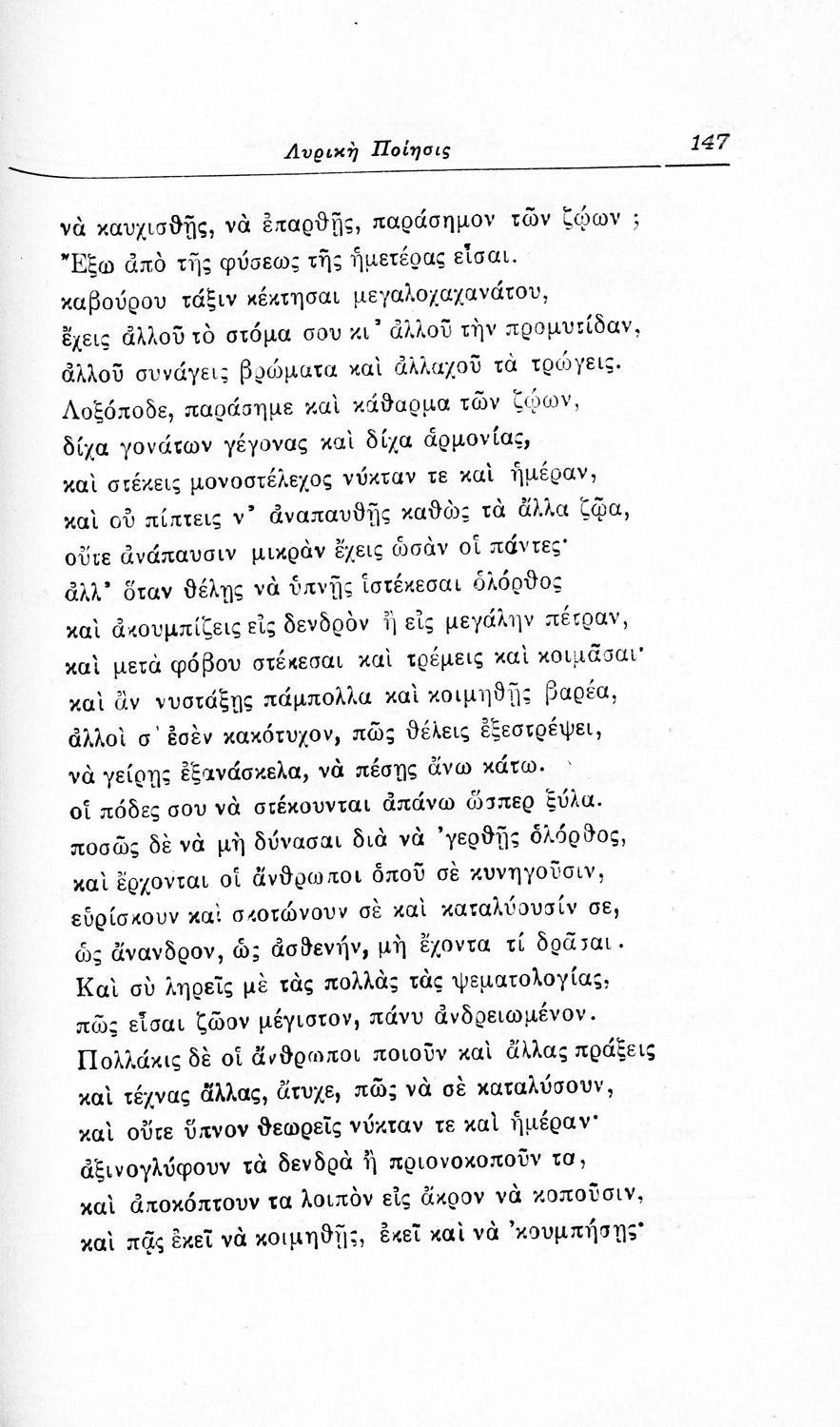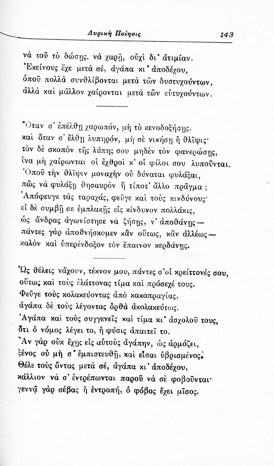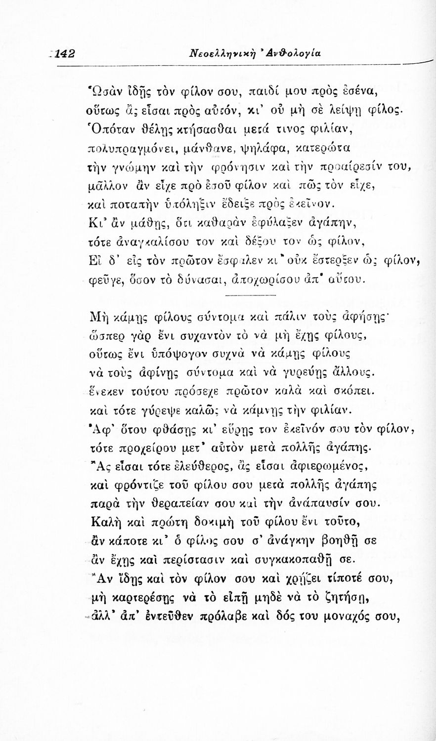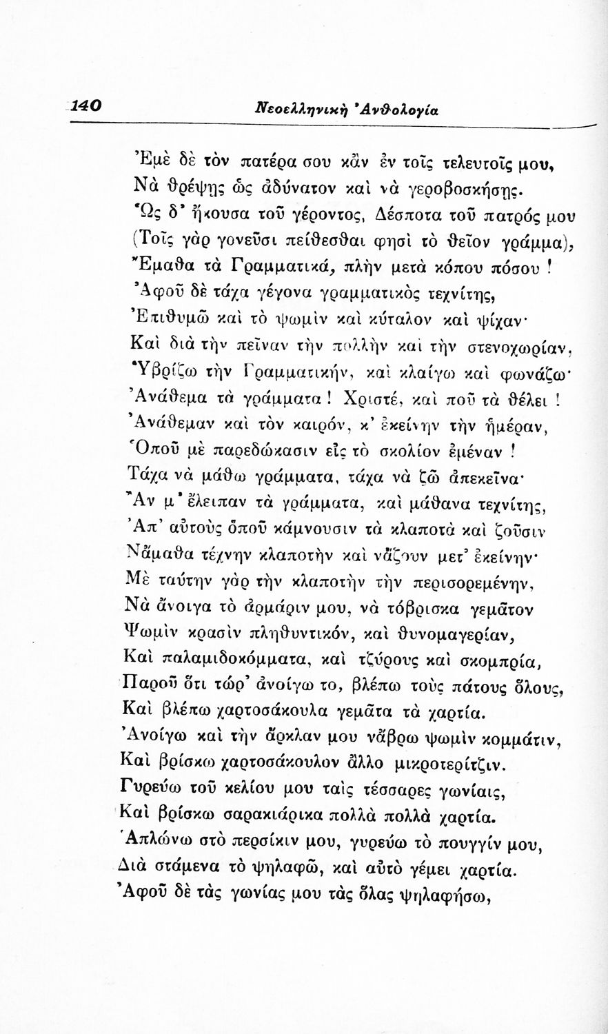 Σχολικό εγχειρίδιο Νέων Ελληνικών για τις τρεις τάξεις των Διδασκαλείων και Γ', Δ' Γυμνασίων. Ανθολόγιο νεοελληνικής ποίησης με αποσπάσματα από επικά, λυρικά και δραματικά ποιήματα. Περιέχει παράρτημα δυσνόητων λέξεων και βιογραφίες των ποιητών. Απουσιάζει το εξώφυλλο ενώ το οπισθόφυλλο έχει κολληθεί από προστατευτικό κάλυμμα του μαθητή.