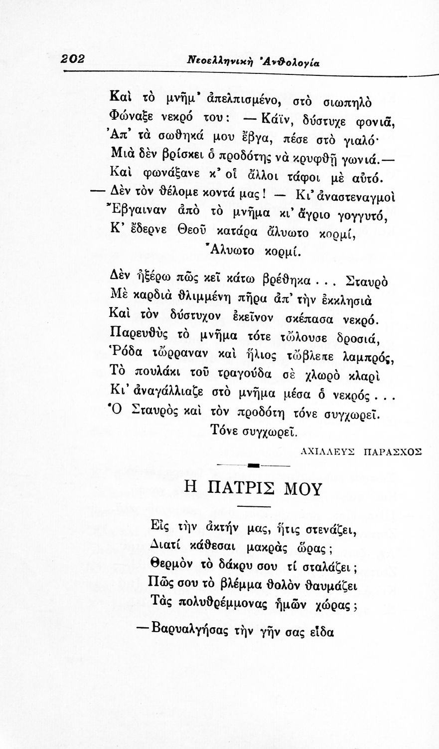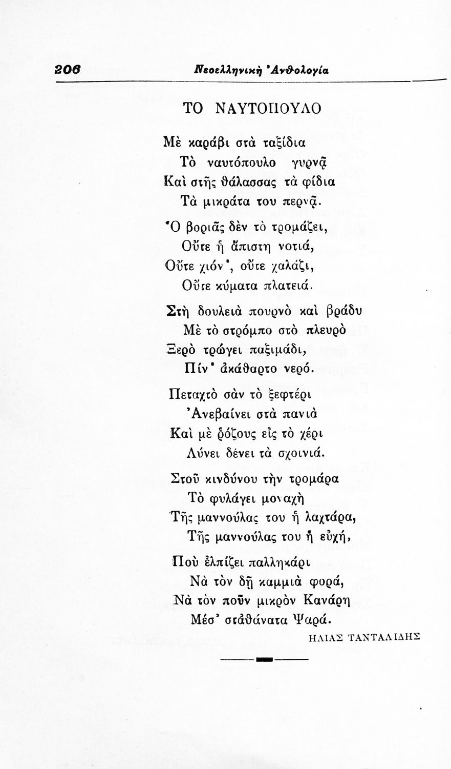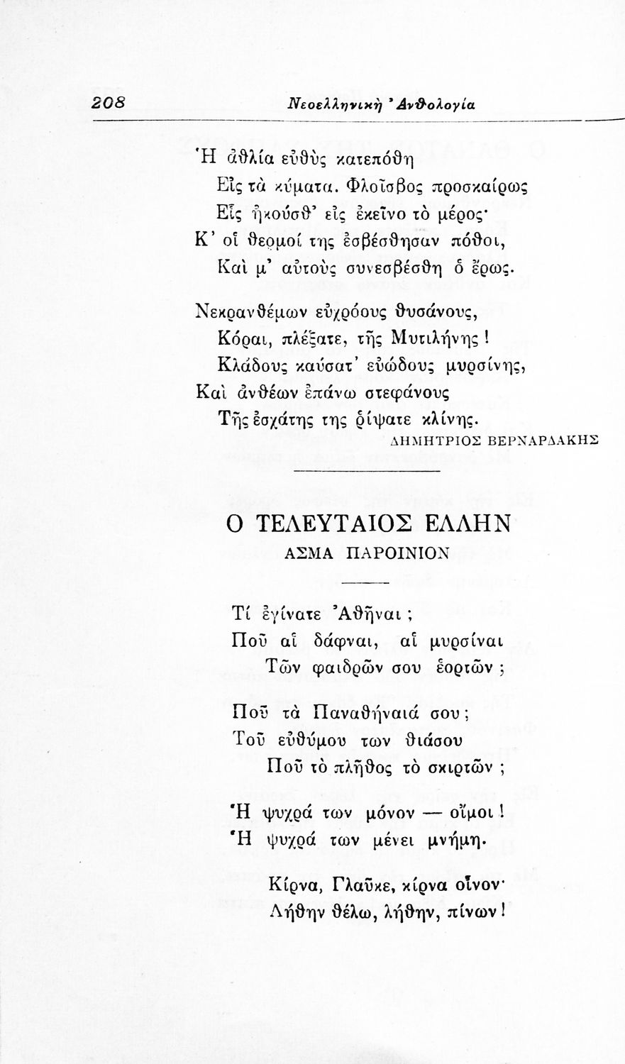 Σχολικό εγχειρίδιο Νέων Ελληνικών για τις τρεις τάξεις των Διδασκαλείων και Γ', Δ' Γυμνασίων. Ανθολόγιο νεοελληνικής ποίησης με αποσπάσματα από επικά, λυρικά και δραματικά ποιήματα. Περιέχει παράρτημα δυσνόητων λέξεων και βιογραφίες των ποιητών. Απουσιάζει το εξώφυλλο ενώ το οπισθόφυλλο έχει κολληθεί από προστατευτικό κάλυμμα του μαθητή.