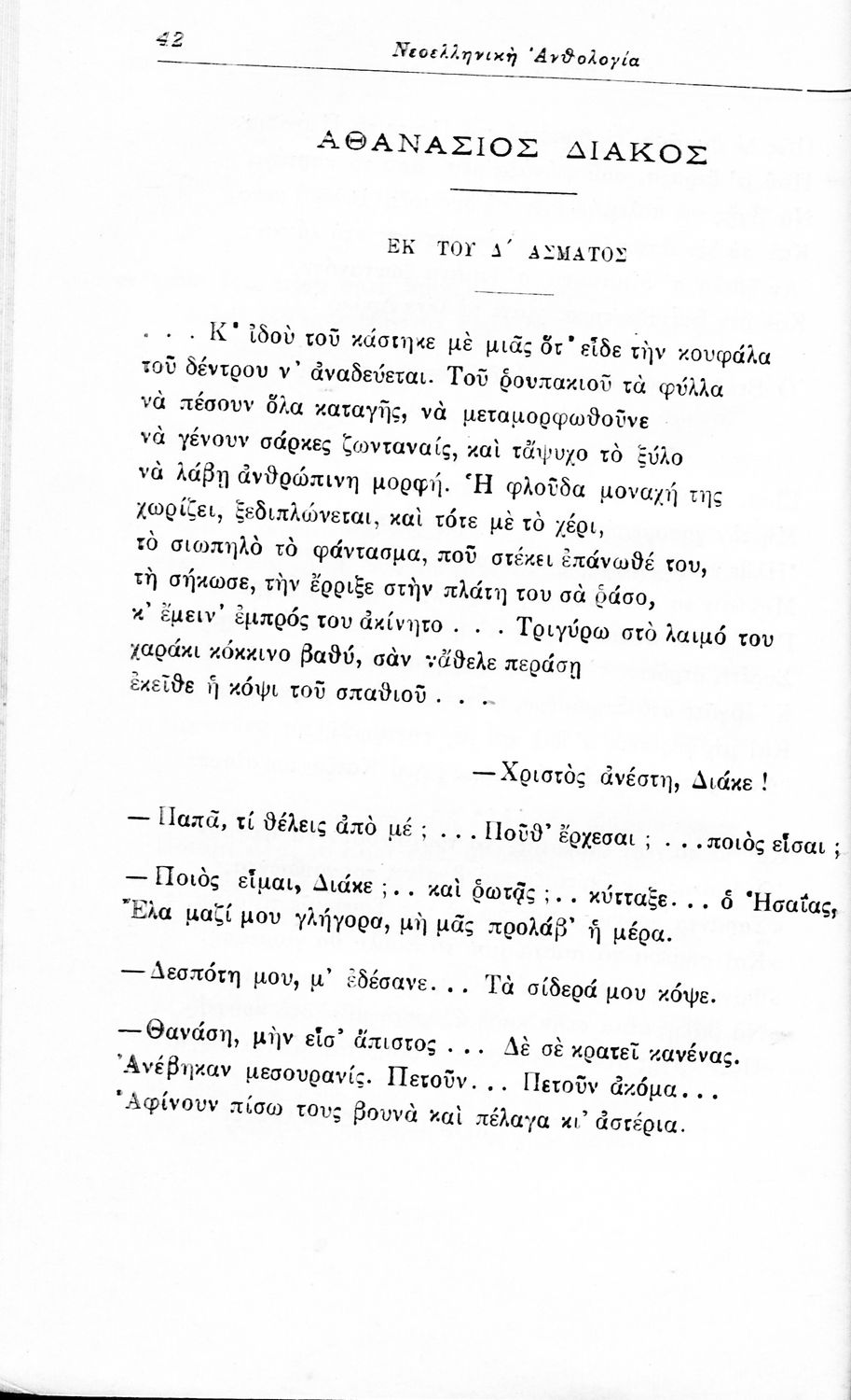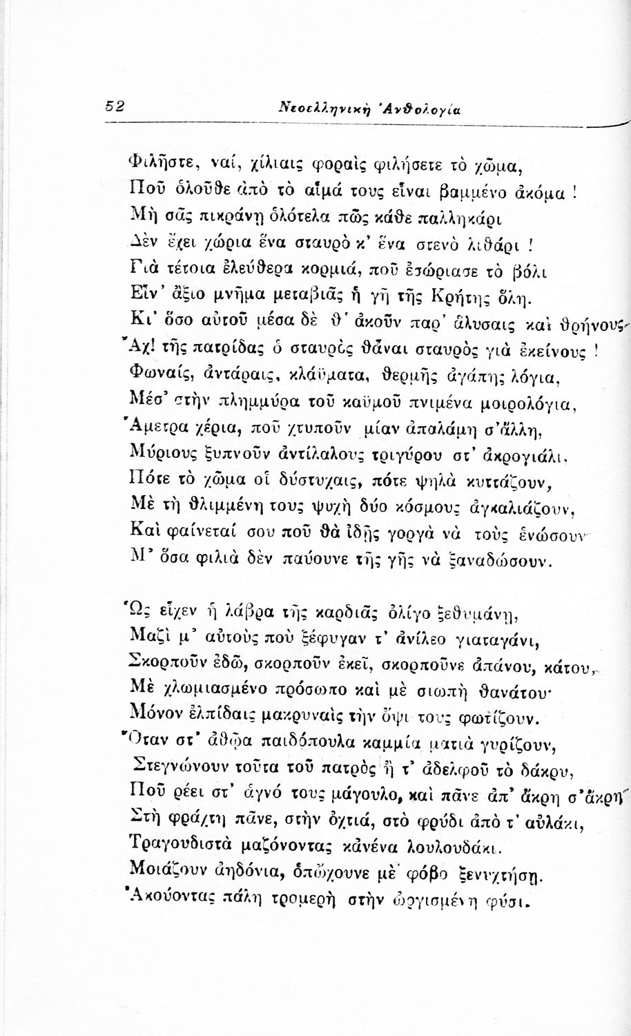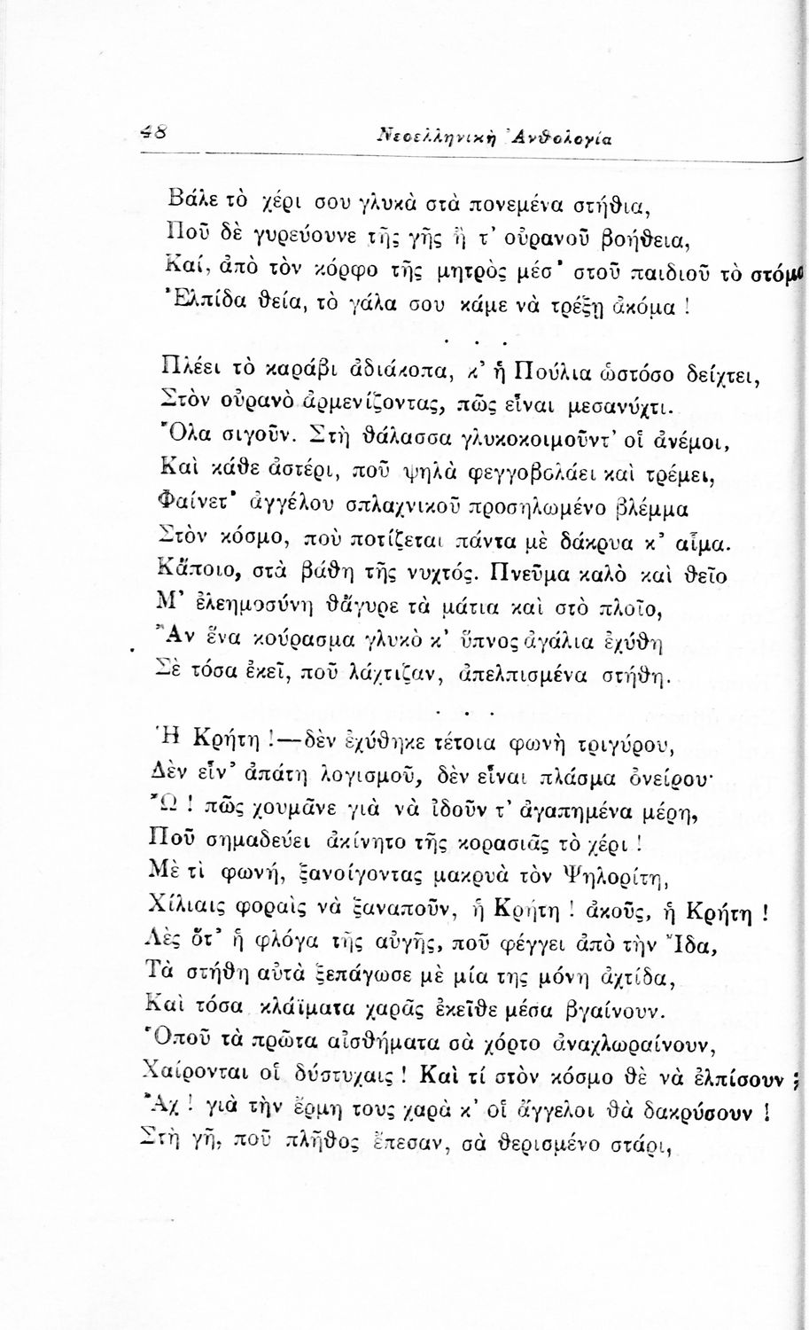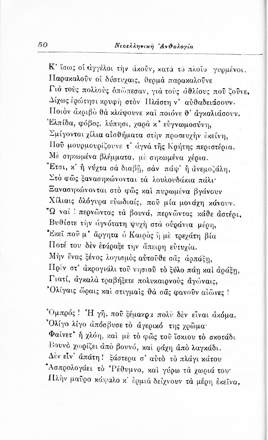 Σχολικό εγχειρίδιο Νέων Ελληνικών για τις τρεις τάξεις των Διδασκαλείων και Γ', Δ' Γυμνασίων. Ανθολόγιο νεοελληνικής ποίησης με αποσπάσματα από επικά, λυρικά και δραματικά ποιήματα. Περιέχει παράρτημα δυσνόητων λέξεων και βιογραφίες των ποιητών. Απουσιάζει το εξώφυλλο ενώ το οπισθόφυλλο έχει κολληθεί από προστατευτικό κάλυμμα του μαθητή.