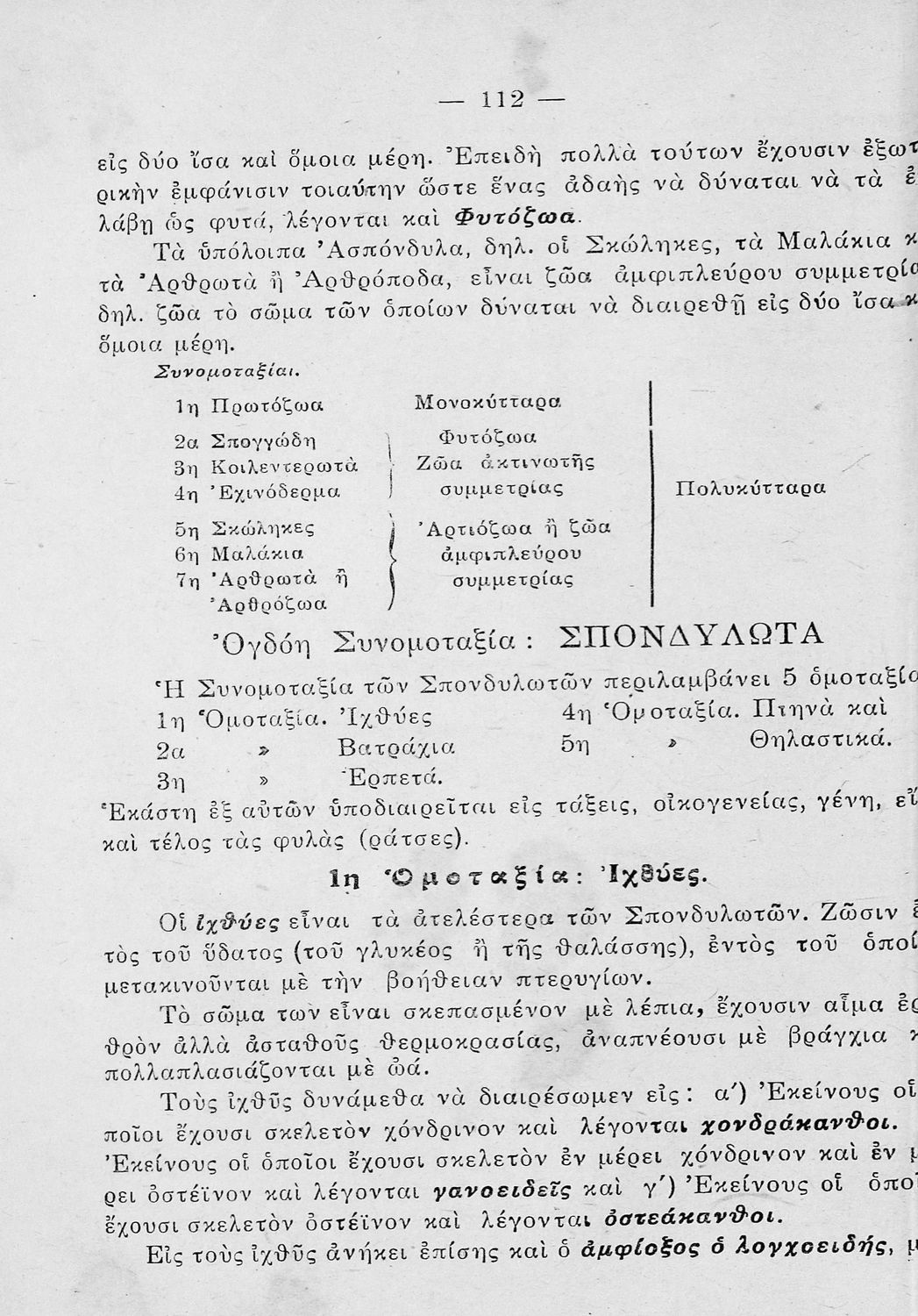 Σχολικό εγχειρίδιο Ζωολογίας για την Γ΄ τάξη των Εξαταξίων Γυμνασίων που παρουσιάζει τα διάφορα ζώα ανάλογα με την συνομοταξία στην οποία ανήκουν.
