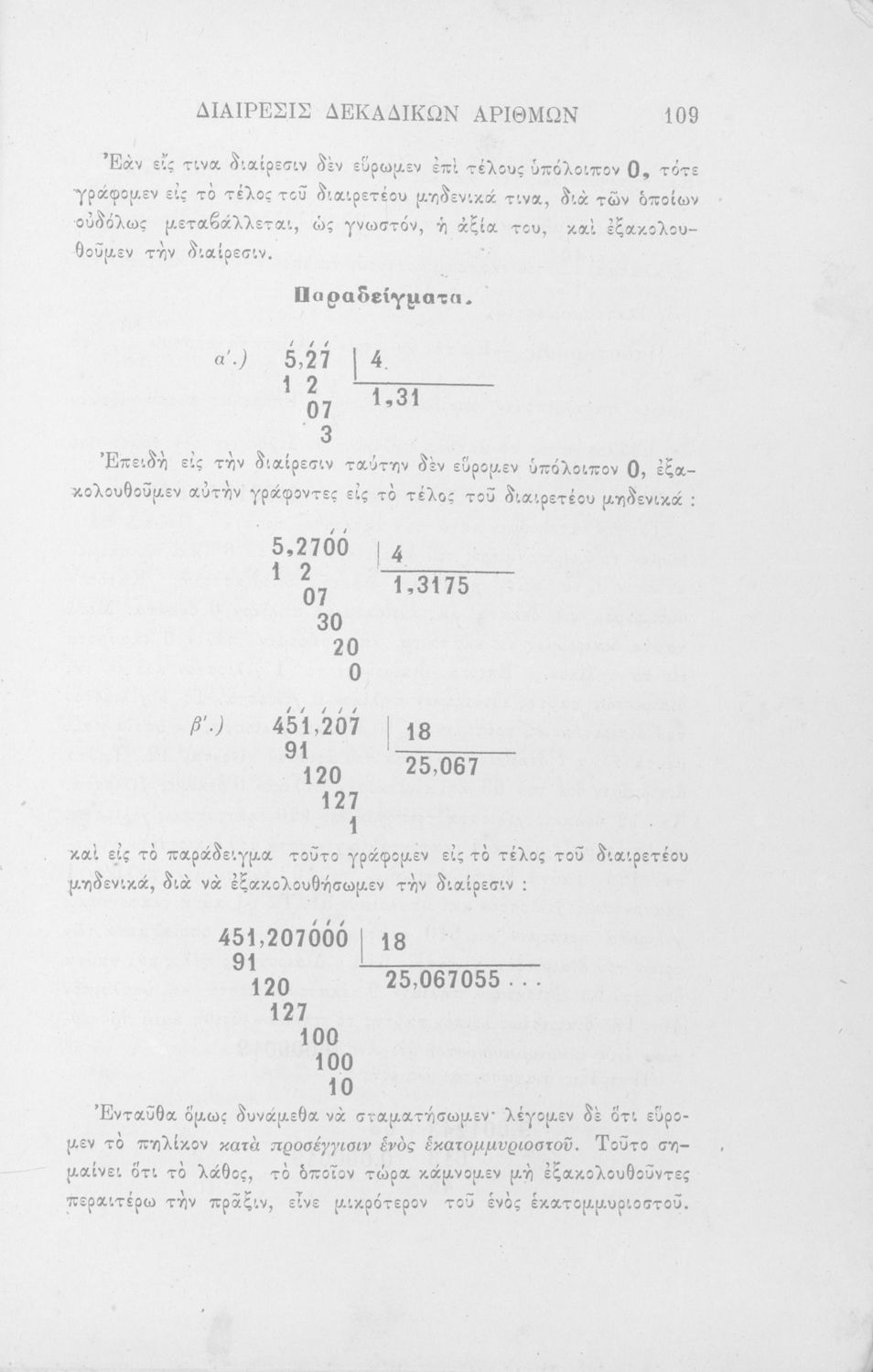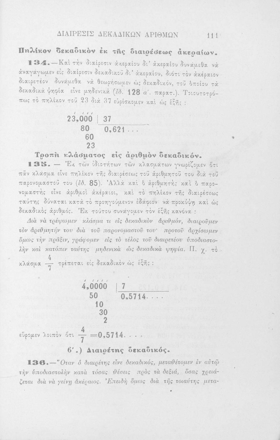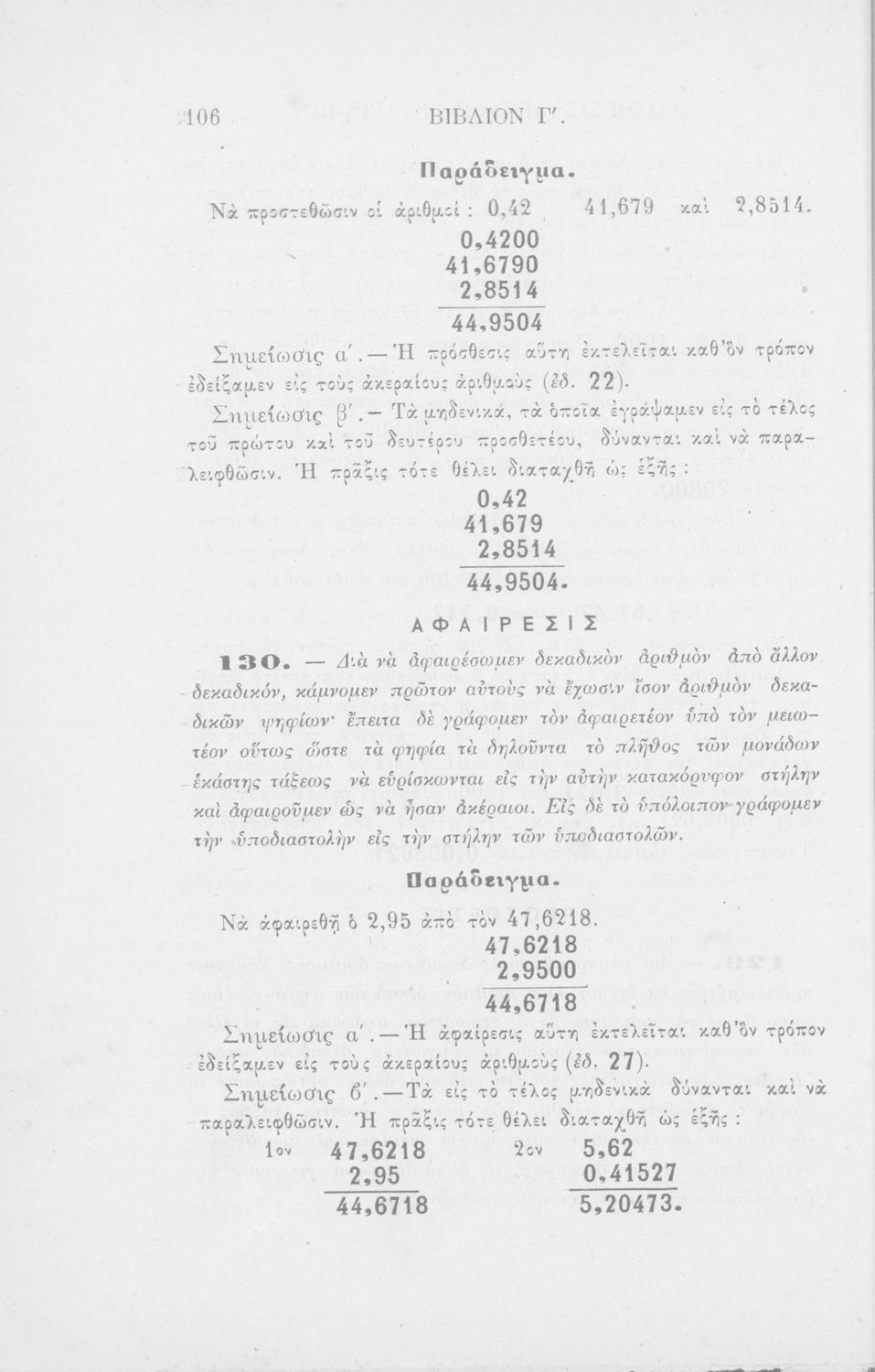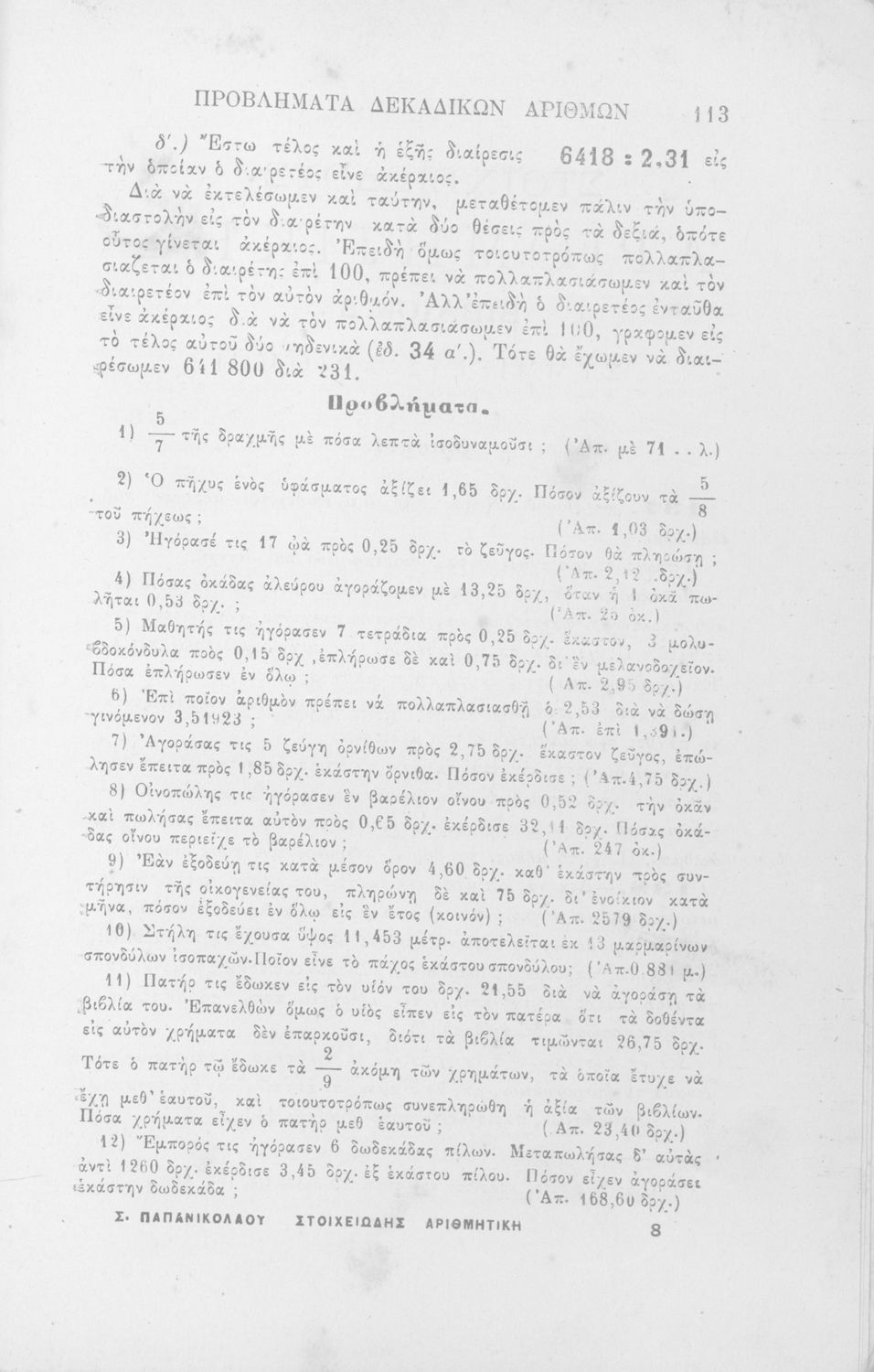 Σχολικό εγχειρίδιο Αριθμητικής για τα Ελληνικά Σχολεία που εστιάζει στις αριθμητικές πράξεις με ακέραιους αριθμούς και κλάσματα και περιλαμβάνει στοιχεία λογιστικής και καταστιχογραφίας.