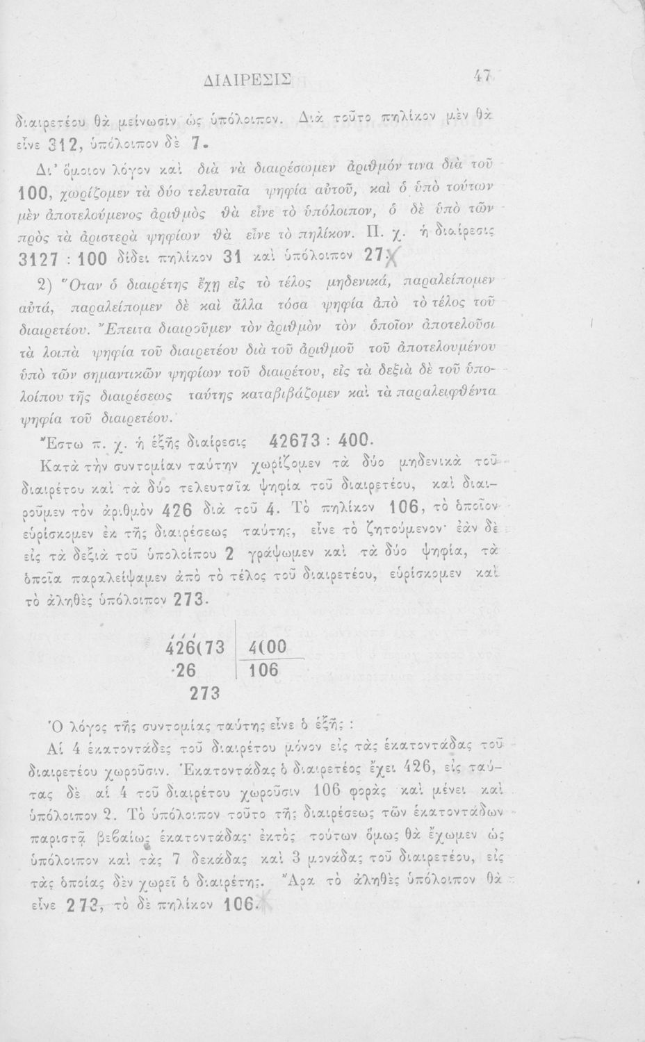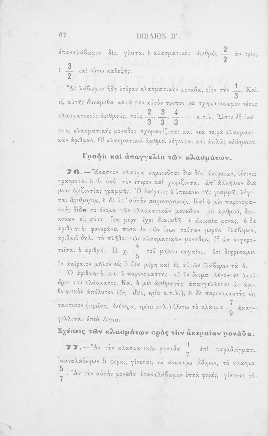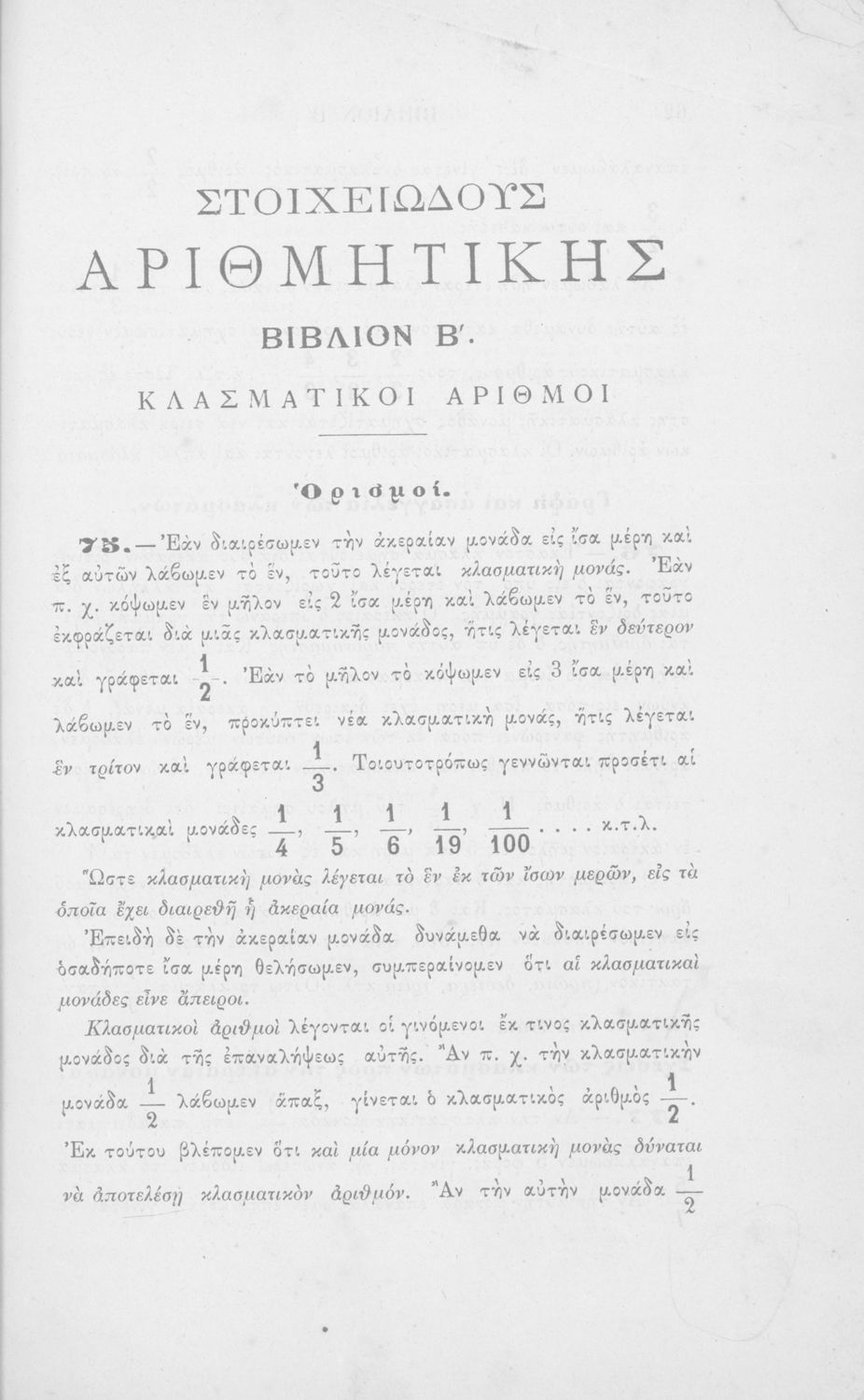 Σχολικό εγχειρίδιο Αριθμητικής για τα Ελληνικά Σχολεία που εστιάζει στις αριθμητικές πράξεις με ακέραιους αριθμούς και κλάσματα και περιλαμβάνει στοιχεία λογιστικής και καταστιχογραφίας.