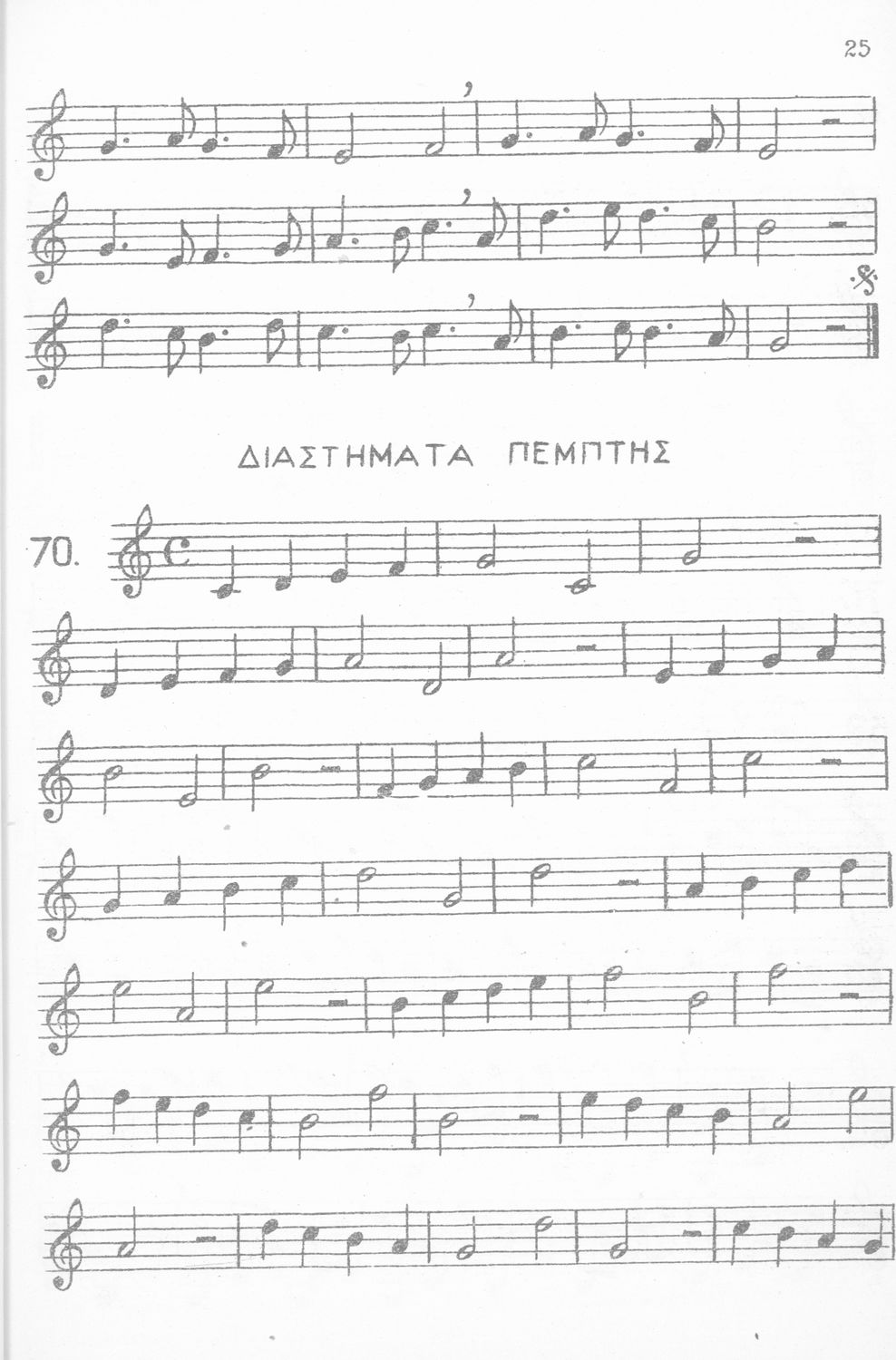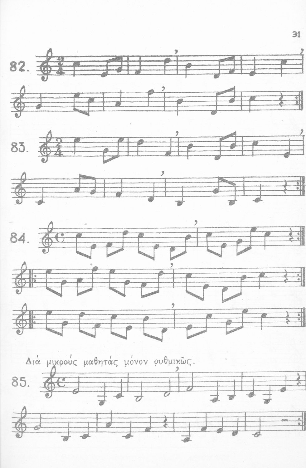 Σχολικό εγχειρίδιο Μουσικής για την Α', Β', Γ', Δ' Γυμνασίου, Πρακτικών Λυκείων και Διδασκαλείων. Περιέχει ασκήσεις μελωδικές, χωρίς θεωρία.