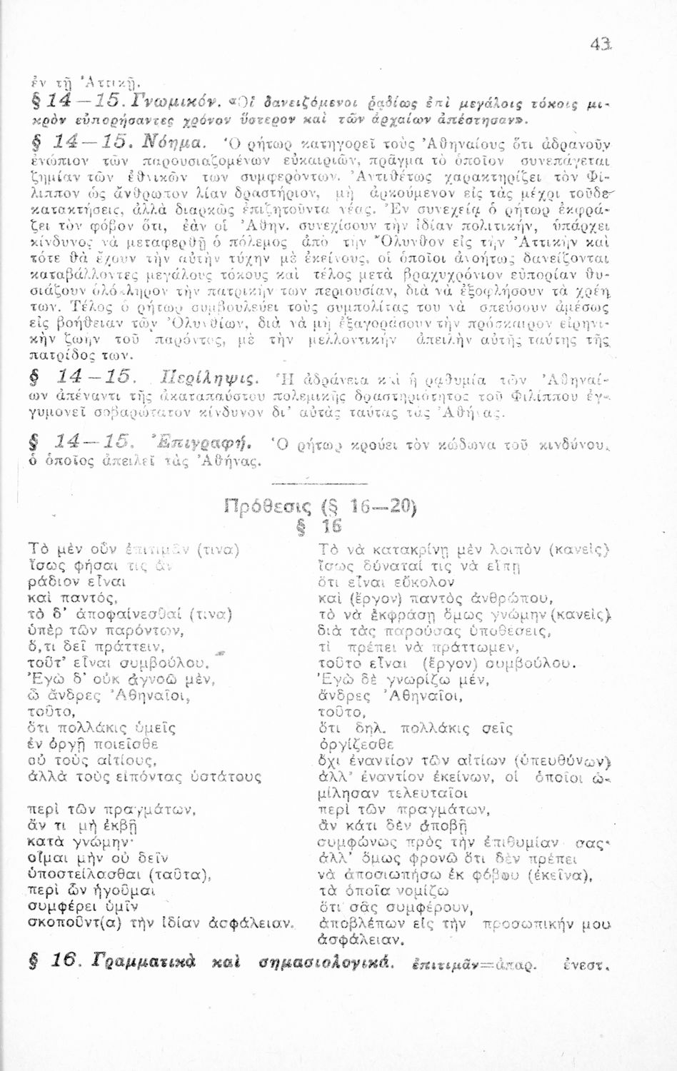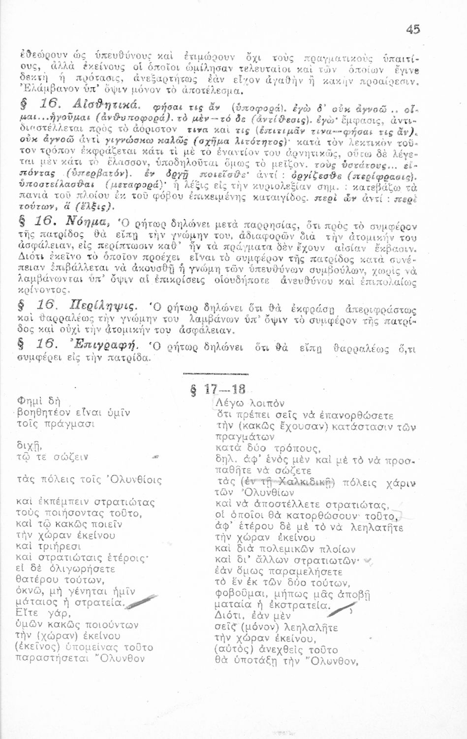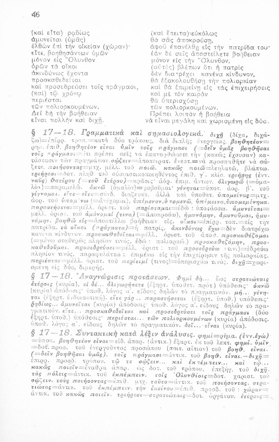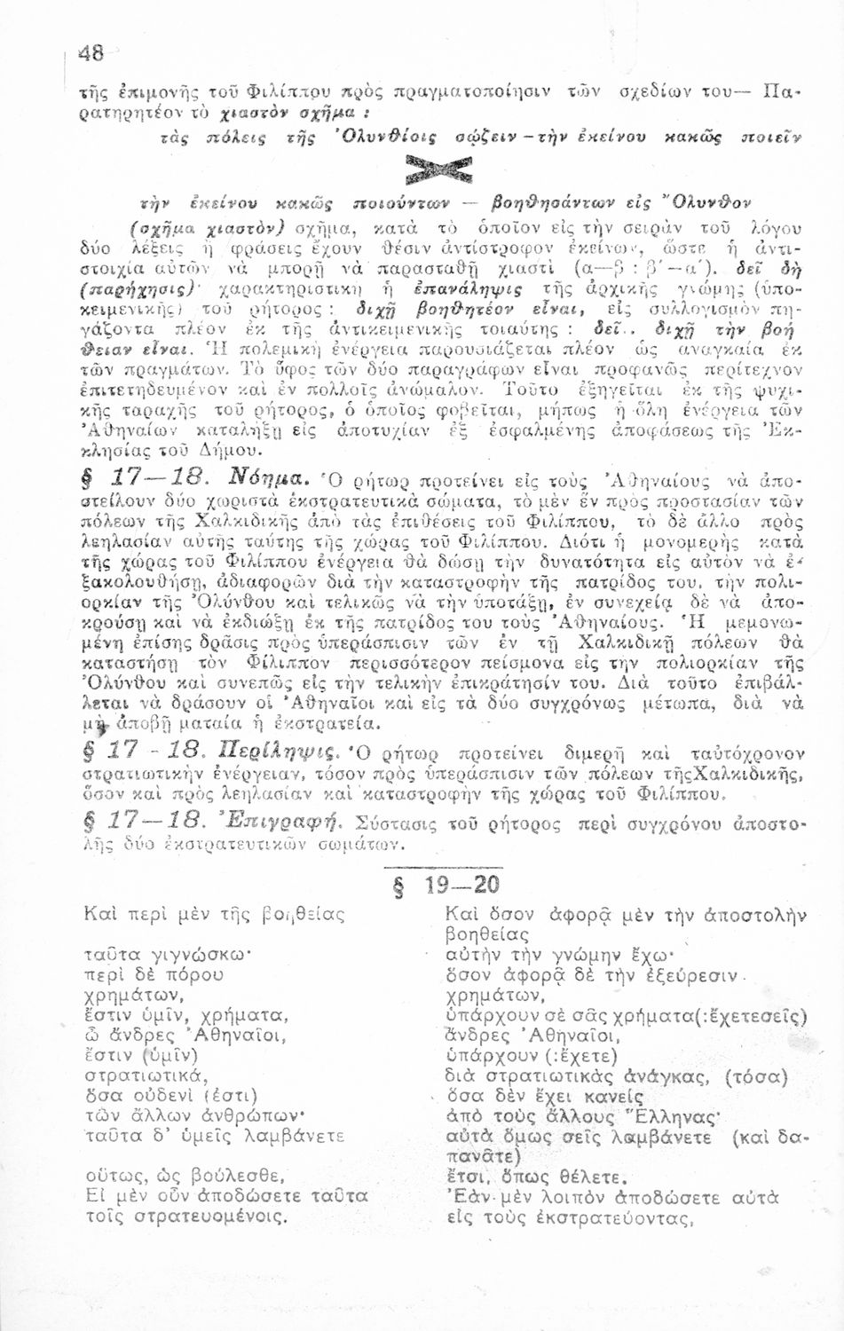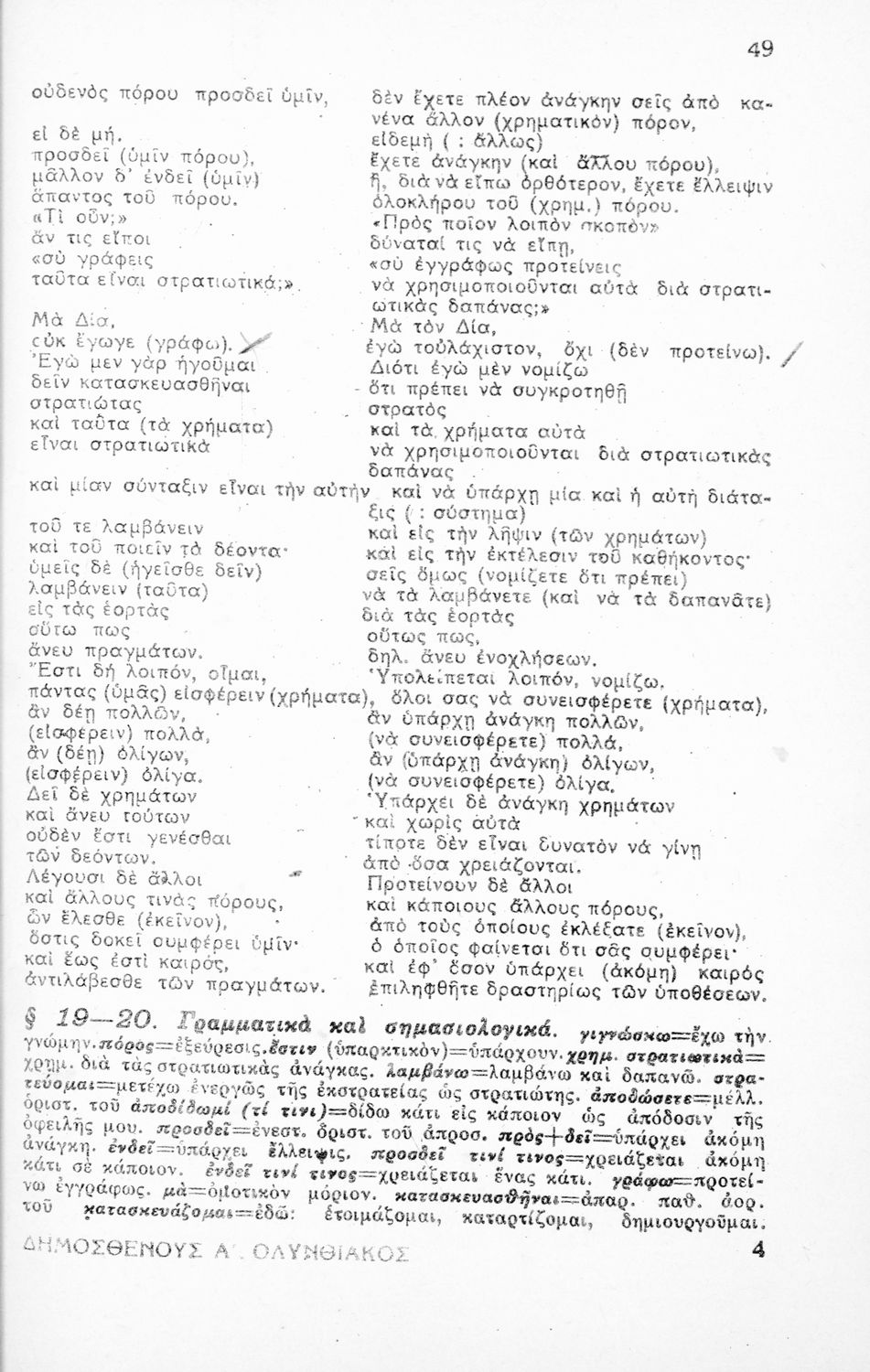 Μαθητικό βοήθημα Αρχαίων Ελληνικών για τους μαθητές της ΣΤ΄ Οκταταξίου Γυμνασίου που περιέχει τον Α' Ολυνθιακό του Δημοσθένη, μετάφραση, γραμματικά και συντακτικά σχόλια.