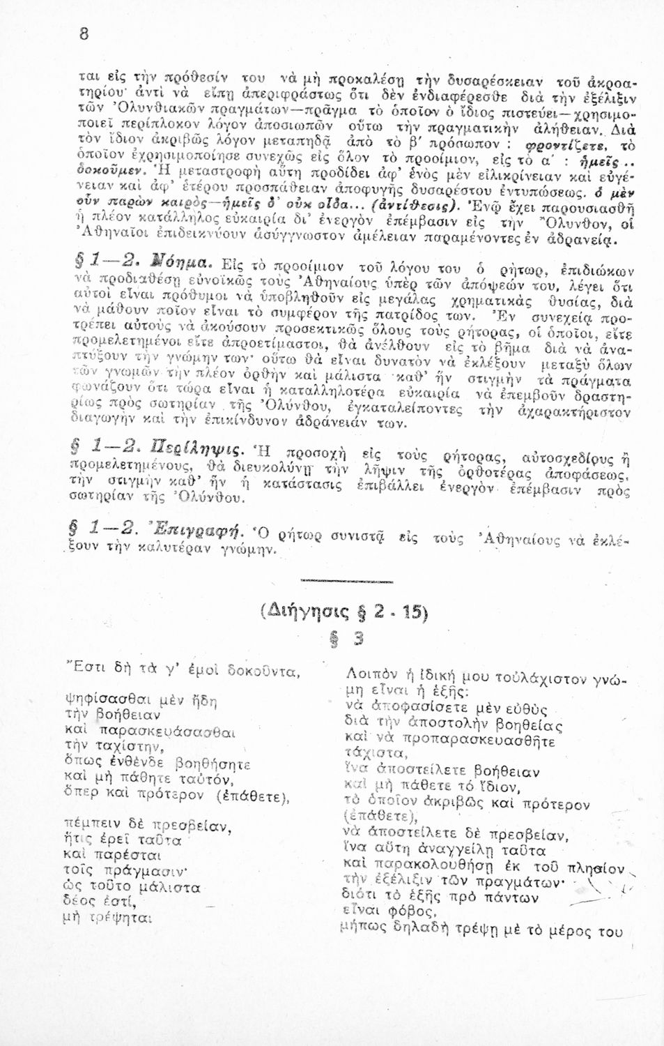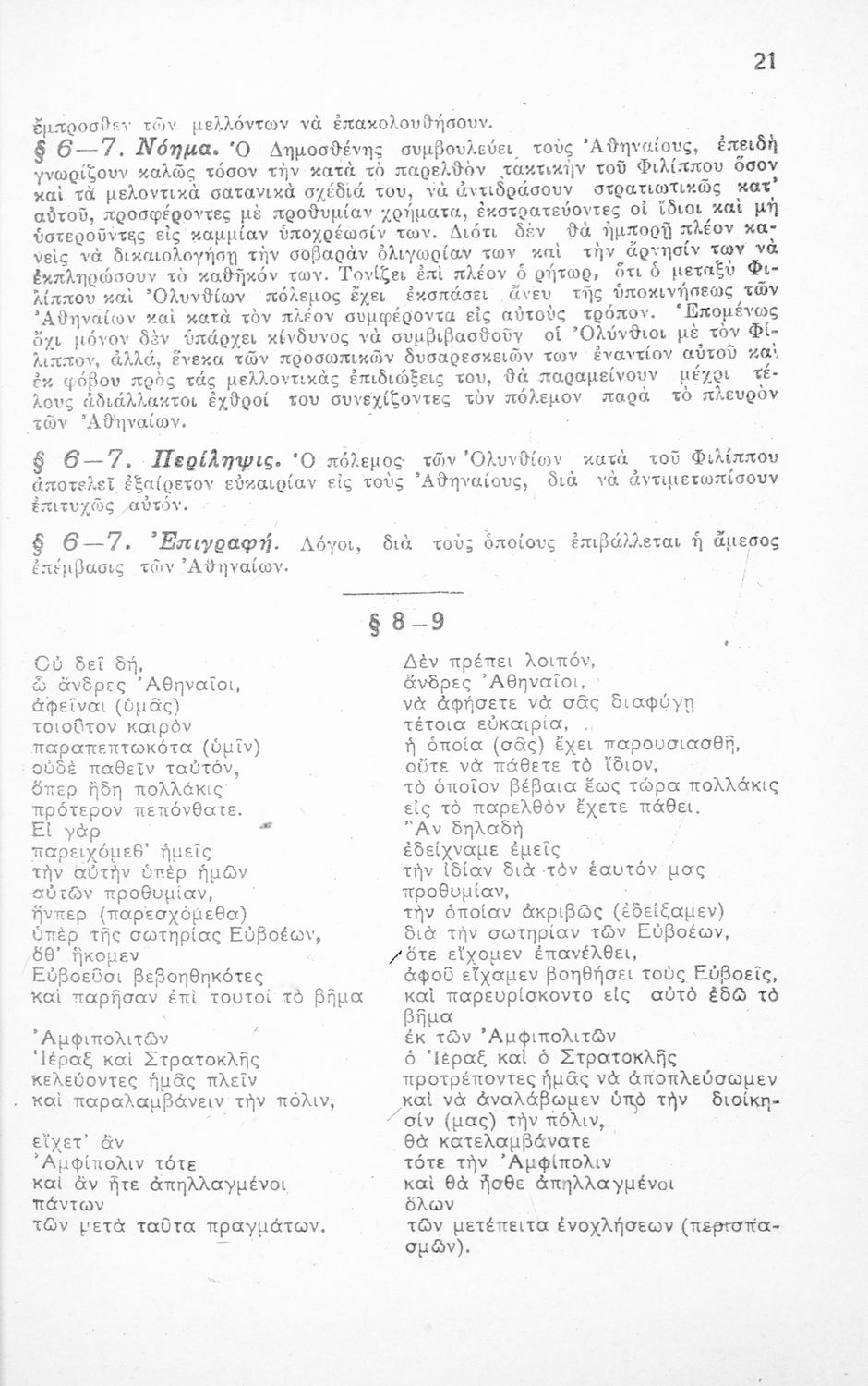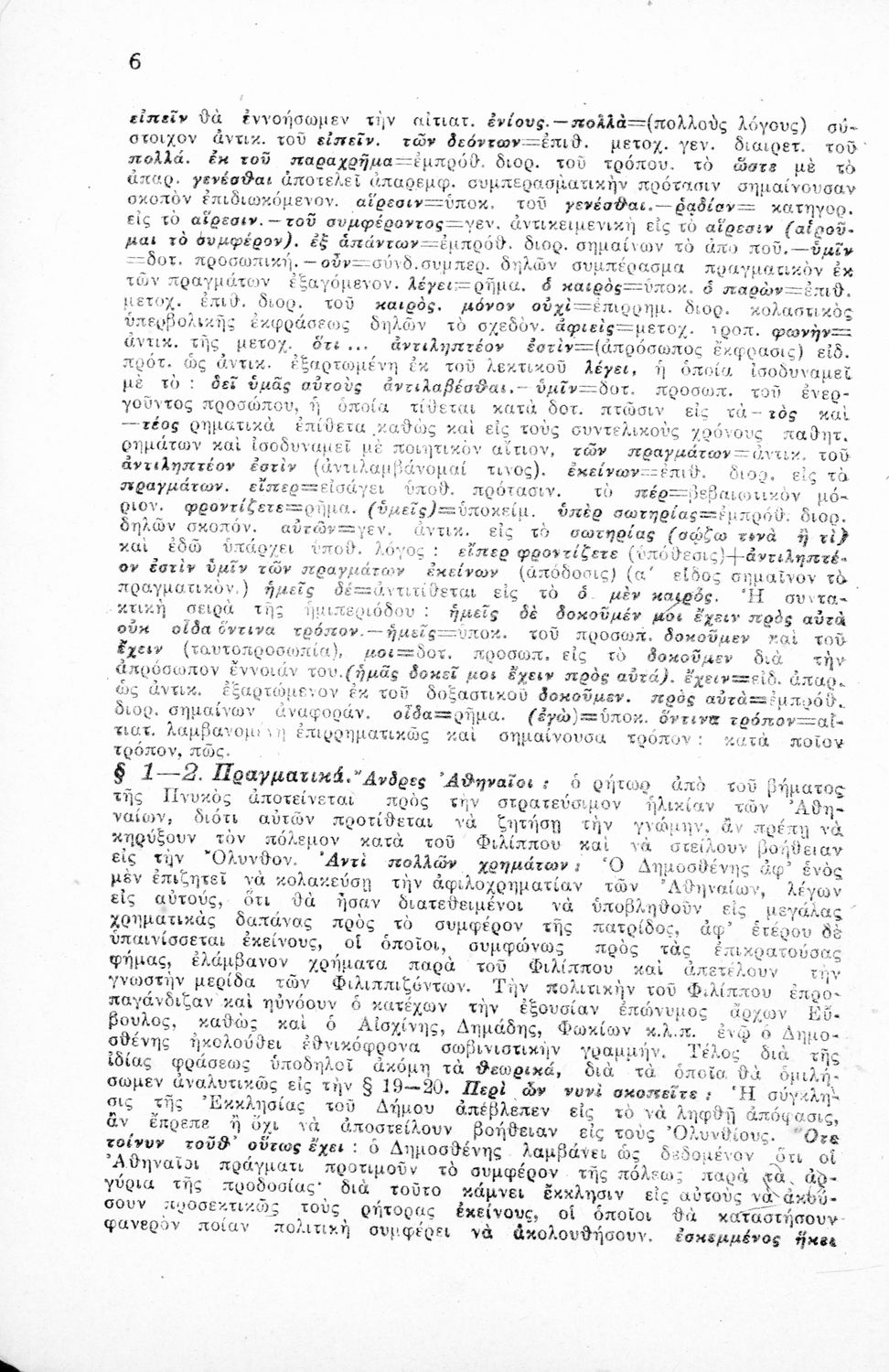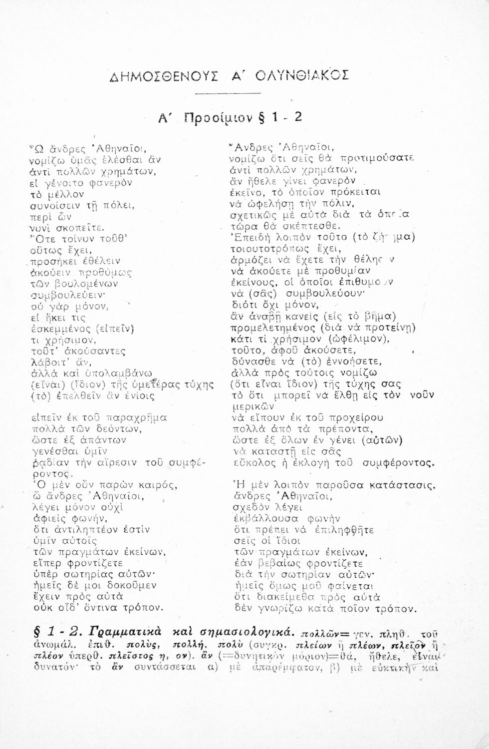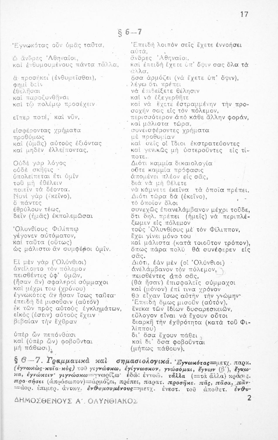 Μαθητικό βοήθημα Αρχαίων Ελληνικών για τους μαθητές της ΣΤ΄ Οκταταξίου Γυμνασίου που περιέχει τον Α' Ολυνθιακό του Δημοσθένη, μετάφραση, γραμματικά και συντακτικά σχόλια.