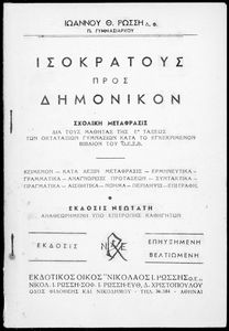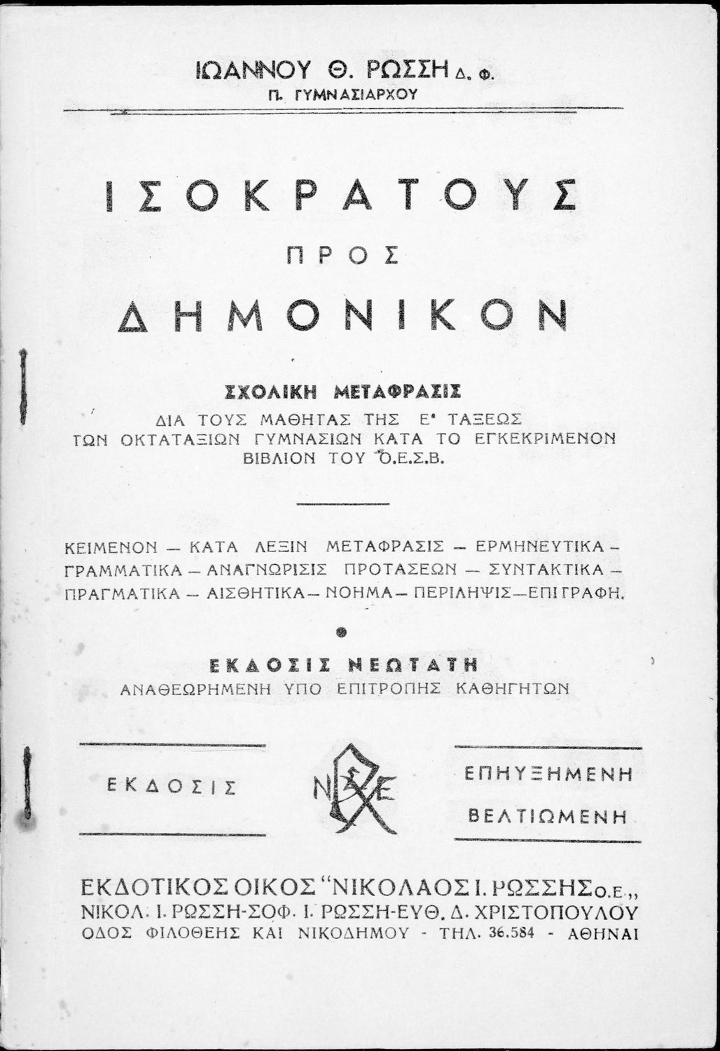 Κωδικός αναγνώρισης: 01-42122 Τίτλος: Ισοκράτους προς Δημόνικον Σχολική μετάφρασις δια τους μαθητάς της Ε' τάξεως των οκταταξίων Γυμνασίων Συγγραφέας: Ισοκράτης, Ιωάννης Θ. Ρώσσης (μετάφραση, σχόλια) Μέγεθος και υπόστρωμα: Μαθητικό βοήθημα, μαλακό εξώφυλλο, 72 σελίδες. |