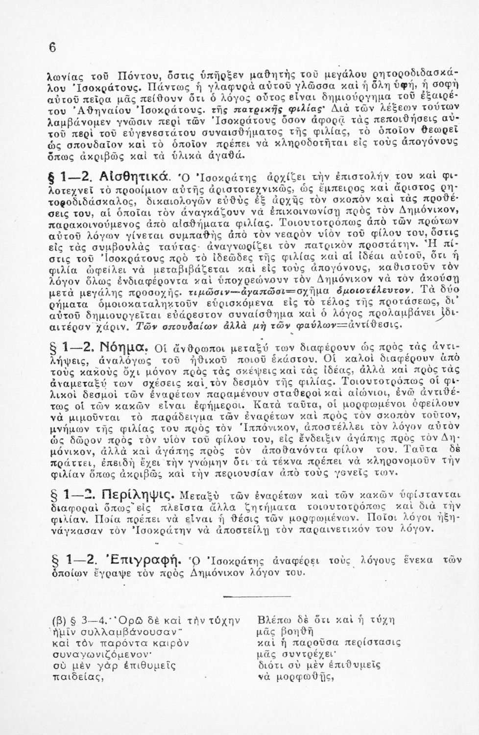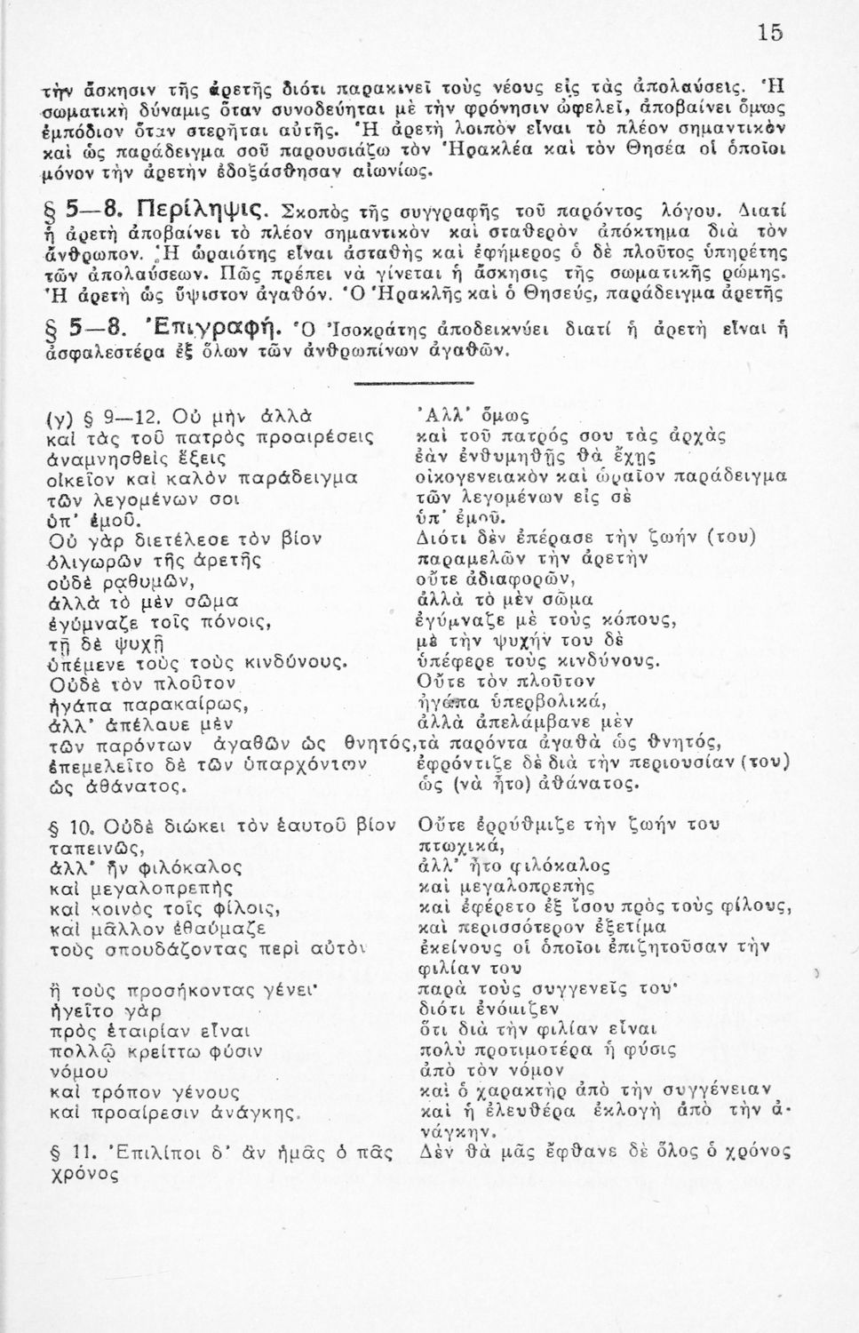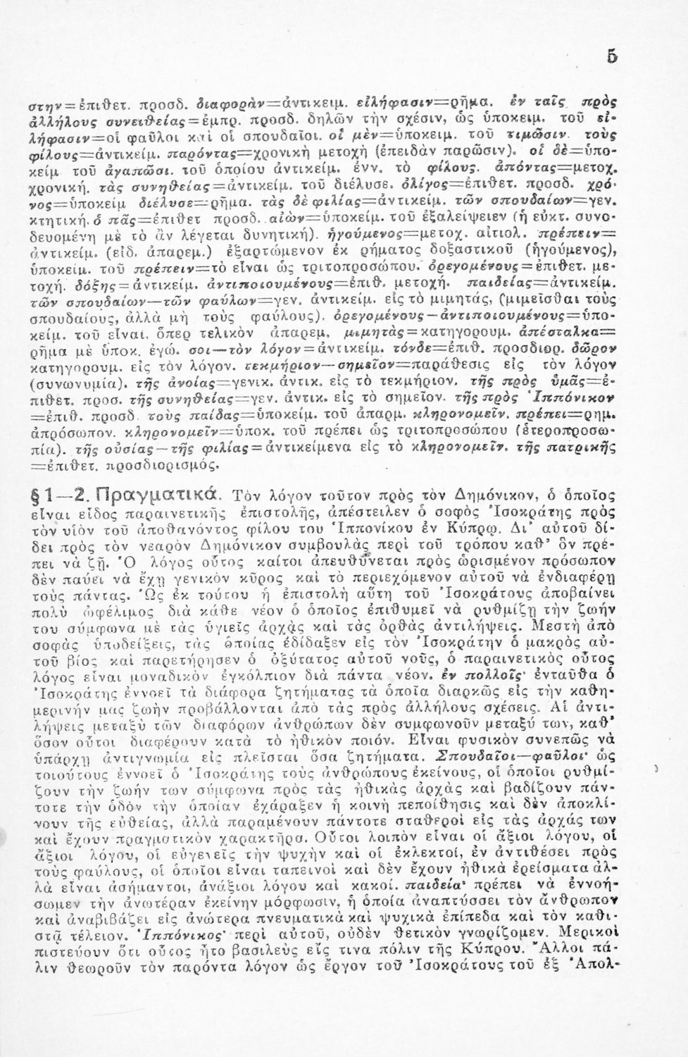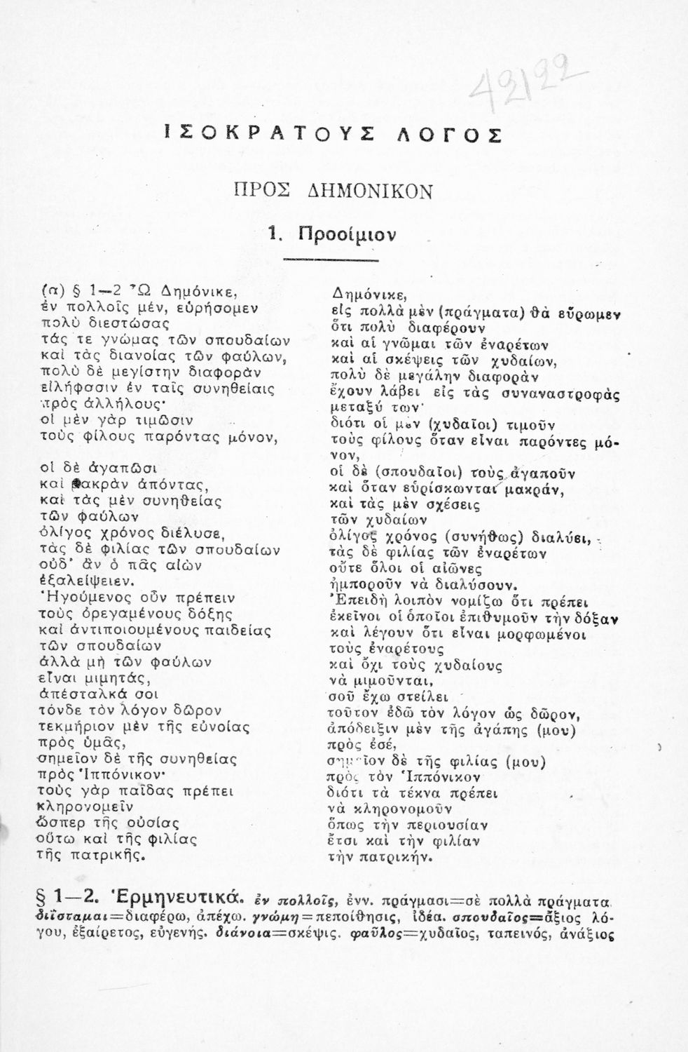 Μαθητικό βοήθημα Αρχαίων Ελληνικών Ε' Γυμνασίου που περιλαμβάνει το Λόγο του Ισοκράτη Προς Δημόνικον, μετάφραση, ερμηνευτικά, γραμματικά και συντακτικά σχόλια.