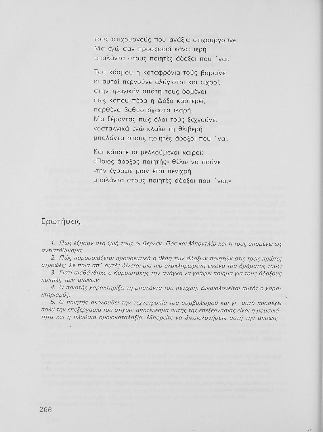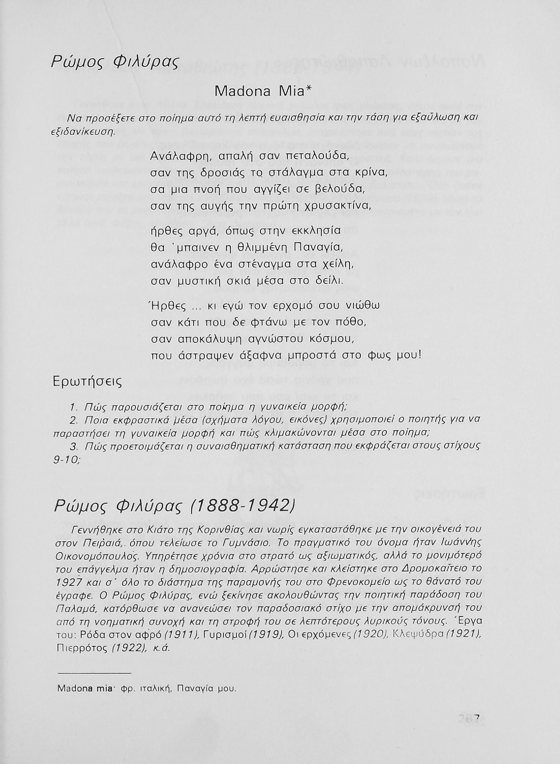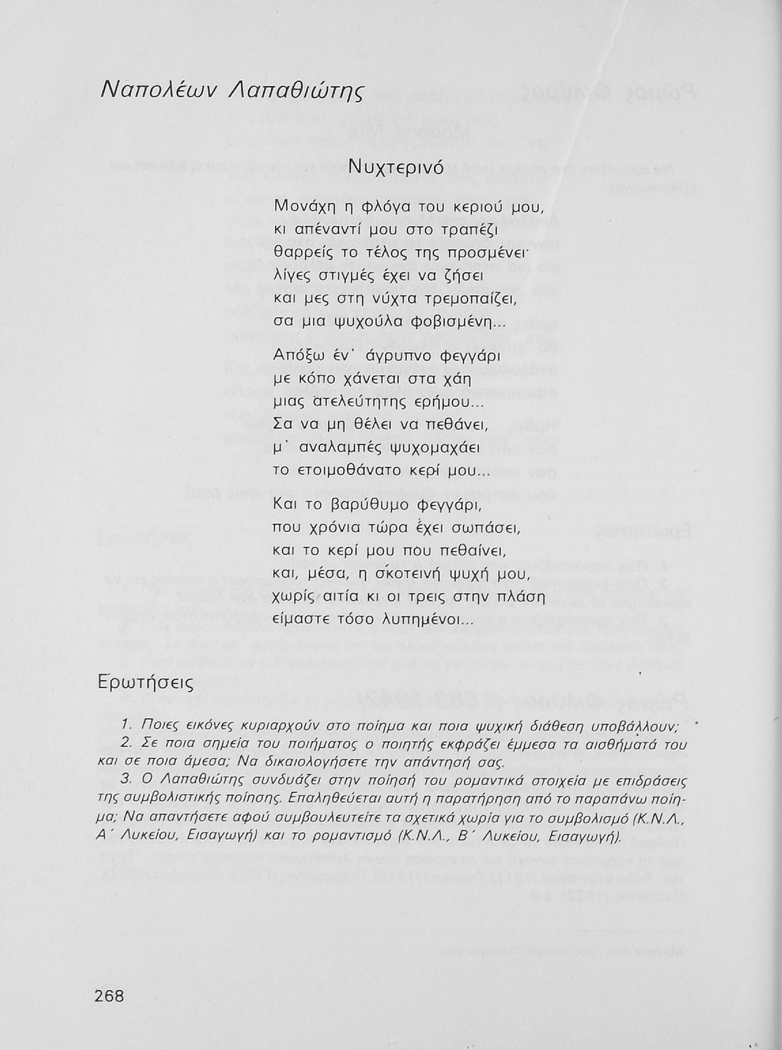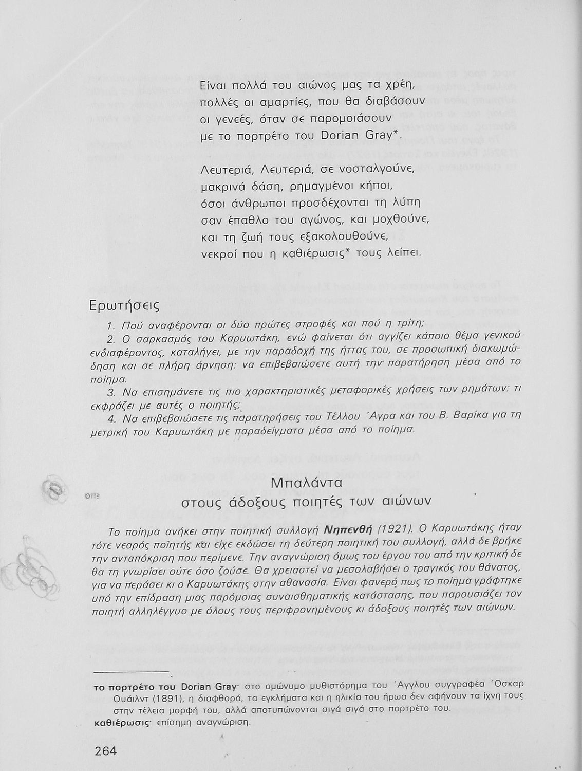 Σχολικό εγχειρίδιο Νέων Ελληνικών Β΄ Λυκείου που περιλαμβάνει πεζά και ποιήματα Ελλήνων συγγραφέων της επτανησιακής και ρομαντικής σχολής, και της νεότερης και μεταπολεμικής λογοτεχνίας και δοκίμια. Περιέχει και έργα κλασσικών ευρωπαίων συγγραφέων και εισαγωγικά σημειώματα.