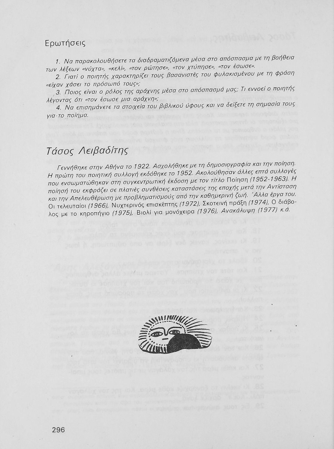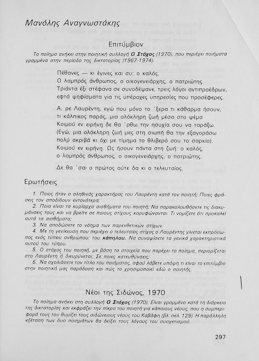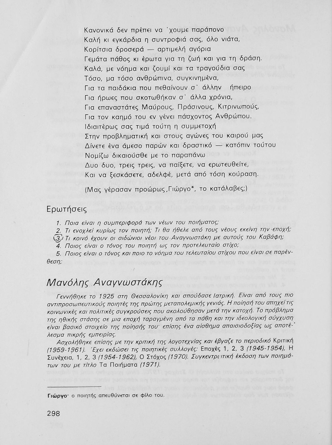 Σχολικό εγχειρίδιο Νέων Ελληνικών Α΄ Λυκείου που περιλαμβάνει πεζά, ποιήματα, δοκίμια και θεατρικά έργα σύγχρονων Ελλήνων και κλασσικών ξένων συγγραφέων, ερωτήσεις και βιογραφικά σημειώματα