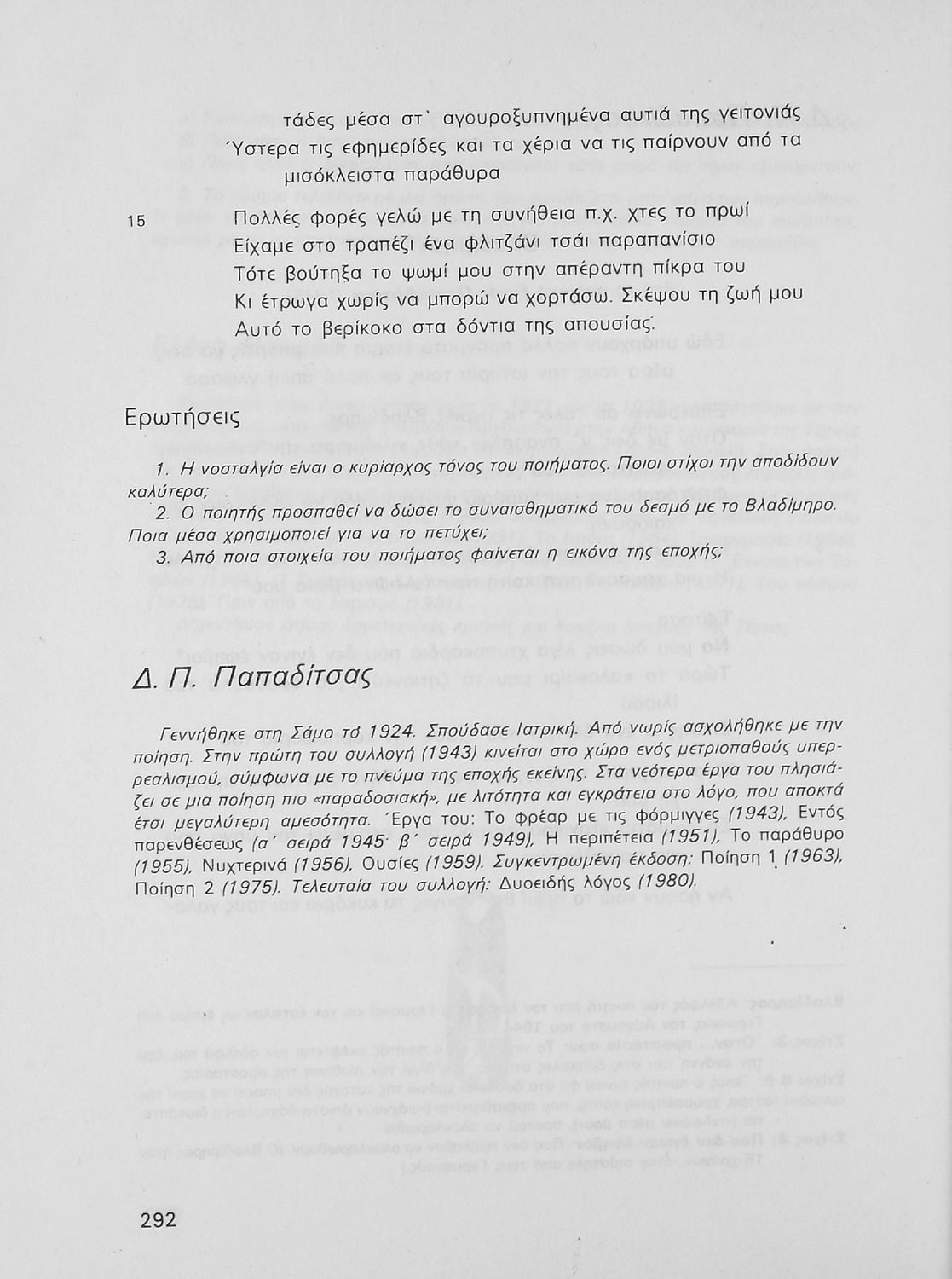 Σχολικό εγχειρίδιο Νέων Ελληνικών Β' Γυμνασίου που περιέχει δημοτικά τραγούδια, πεζά, δοκίμια και ποιήματα σύγχρονων Ελλήνων συγγραφέων και είναι χωρισμένο σε θεματικές ενότητες όπως η πόλη και η ύπαιθρος, η ...