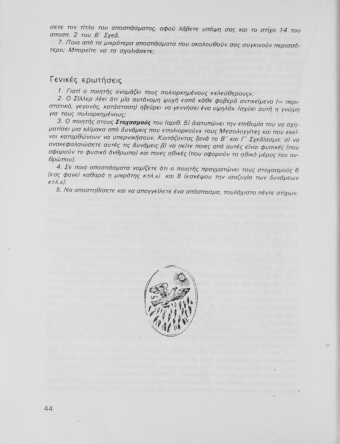 Σχολικό εγχειρίδιο Νέων Ελληνικών Β΄ Λυκείου που περιλαμβάνει πεζά και ποιήματα Ελλήνων συγγραφέων της επτανησιακής και ρομαντικής σχολής, και της νεότερης και μεταπολεμικής λογοτεχνίας και δοκίμια. Περιέχει και έργα κλασσικών ευρωπαίων συγγραφέων και εισαγωγικά σημειώματα.