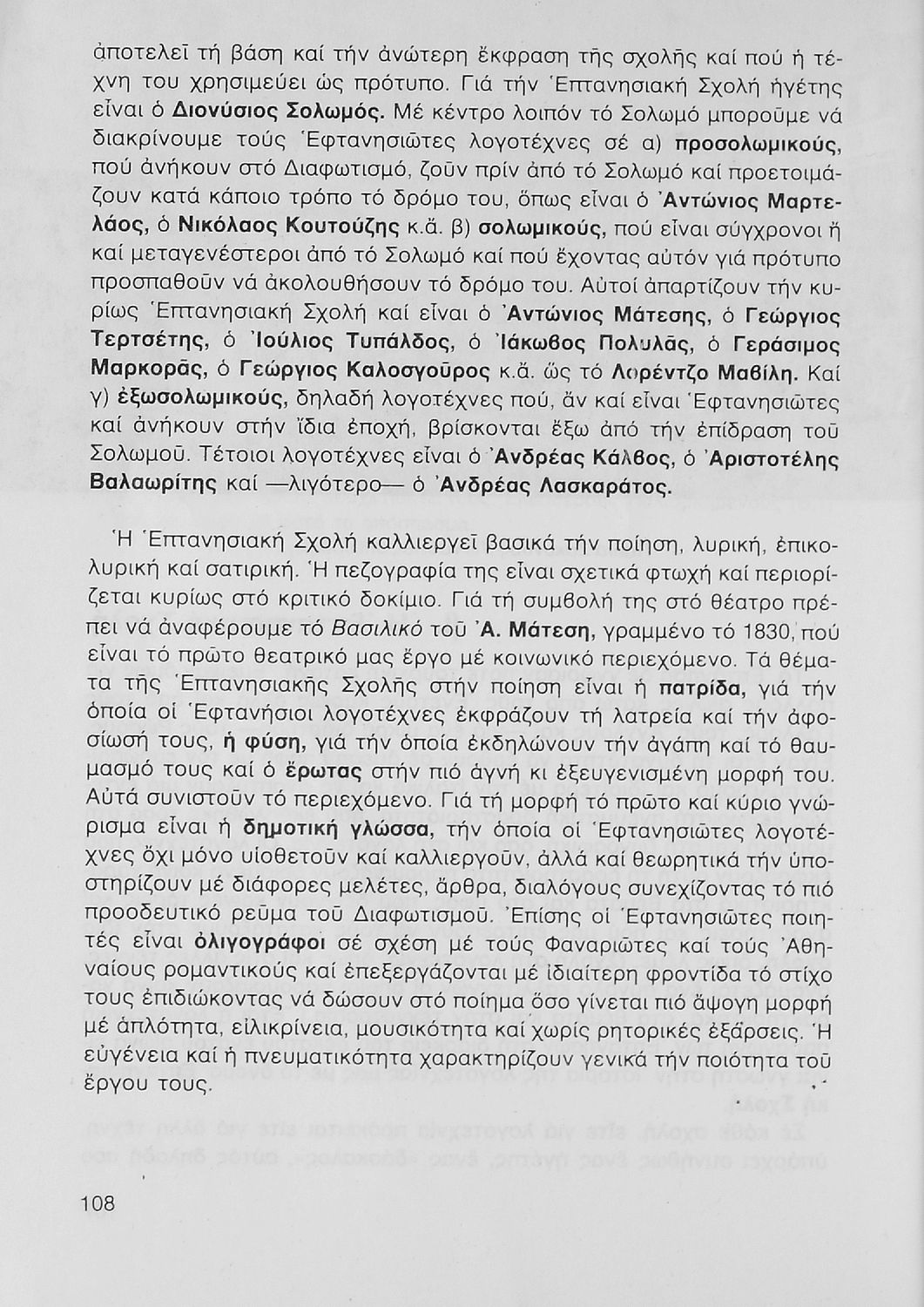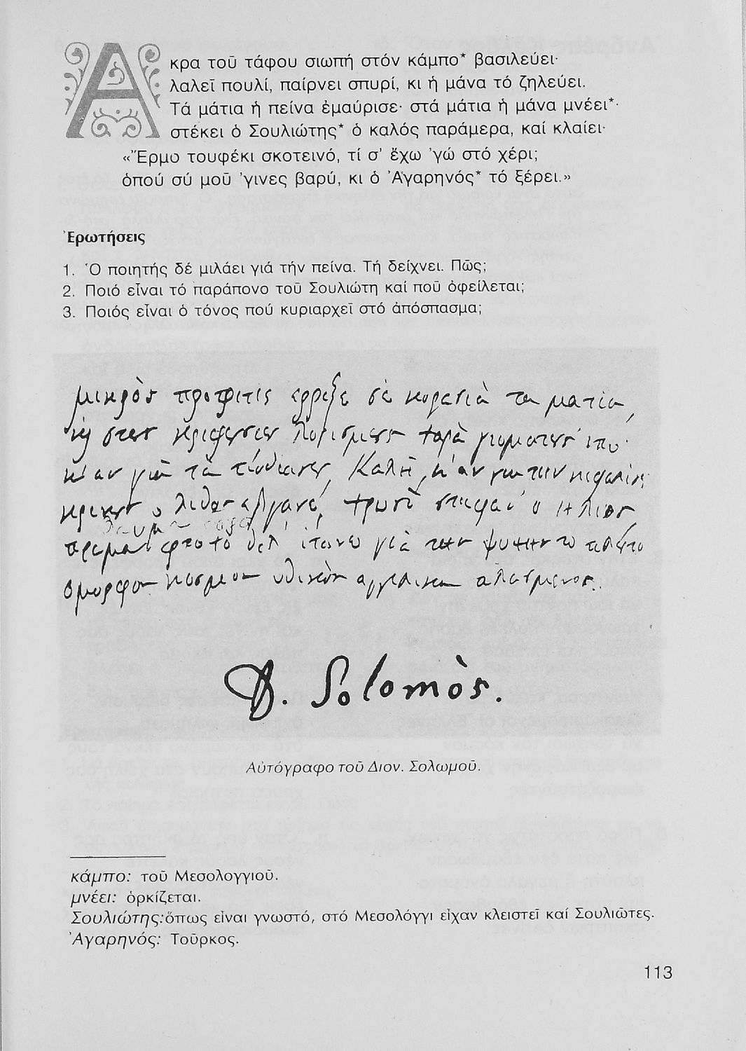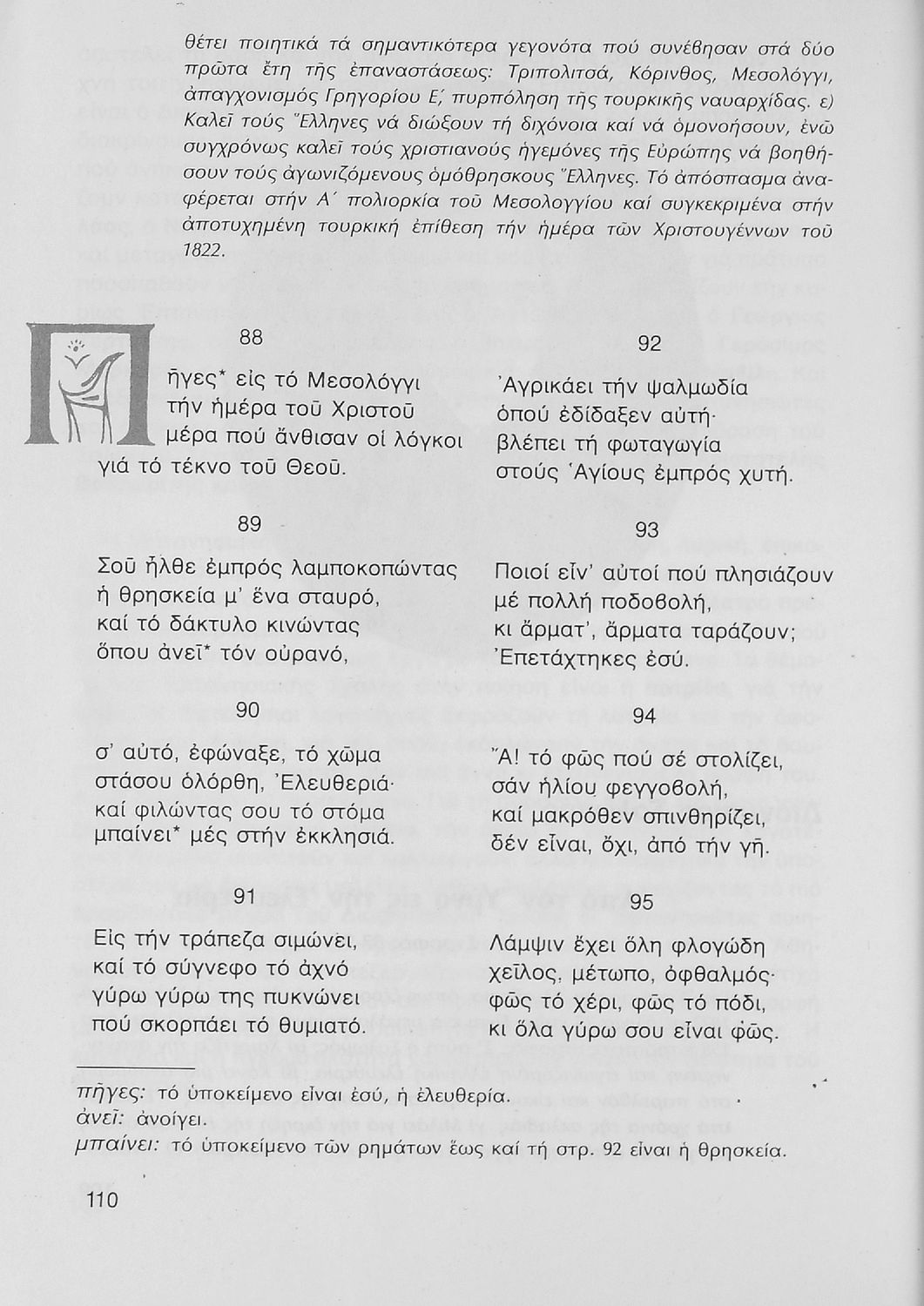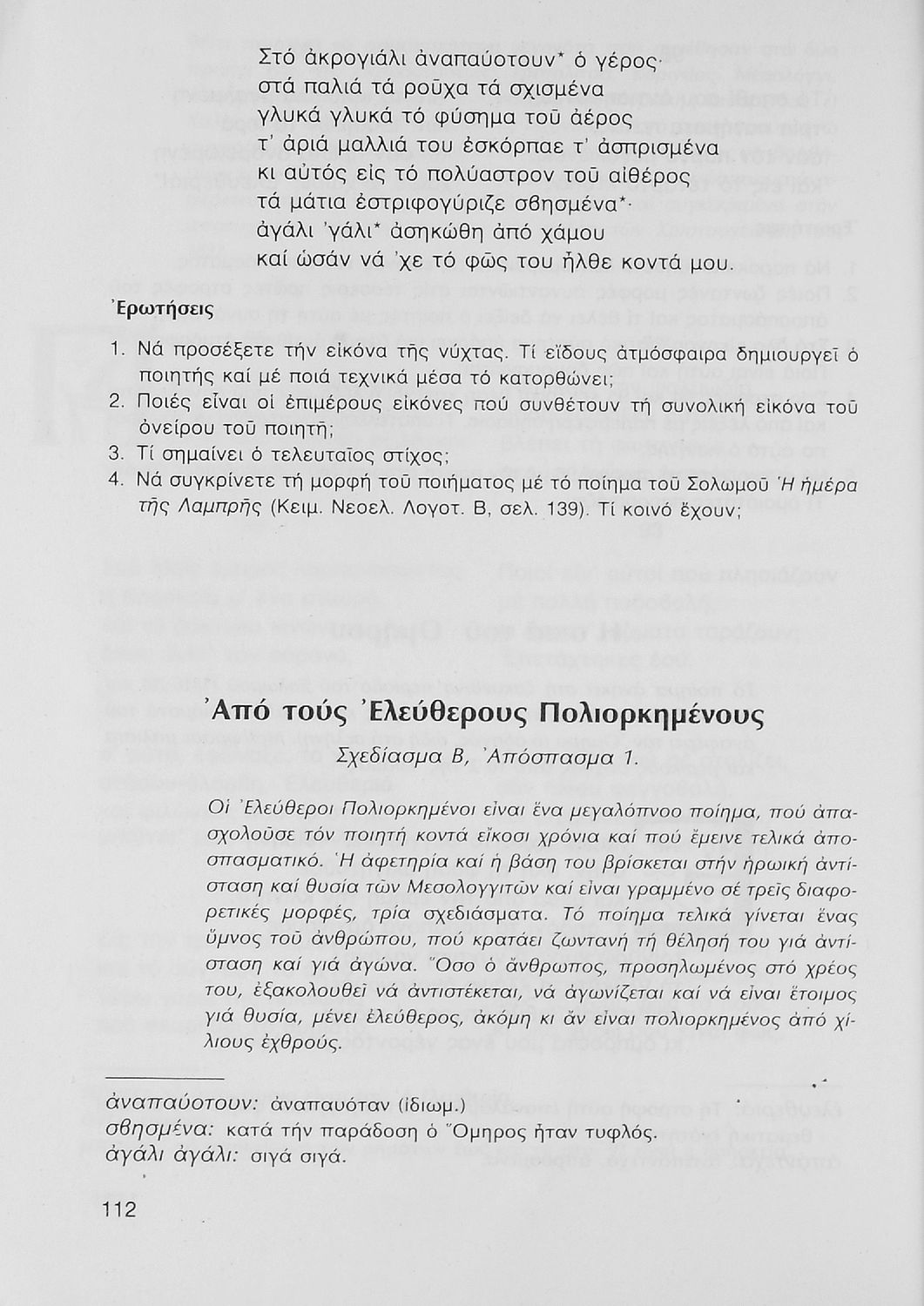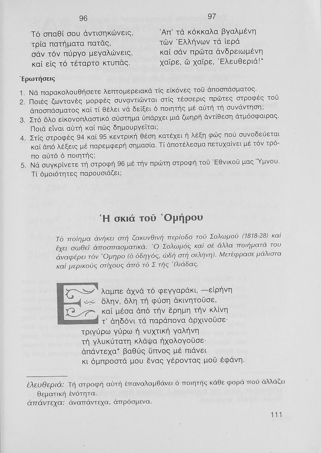 Σχολικό εγχειρίδιο Νέων Ελληνικών Γ΄ Γυμνασίου που περιλαμβάνει δημοτικά τραγούδια, και χαρακτηριστικά δείγματα της κρητικής λογοτεχνίας, της επτανησιακής και ρομαντικής σχολής, της Νέας Αθηναϊκής Σχολής και της νεότερης και μεταπολεμικής λογοτεχνίας. Περιέχει και έργα σύγχρονων ξένων συγγραφέων, βιογραφικά και εισαγωγικά σημειώματα.