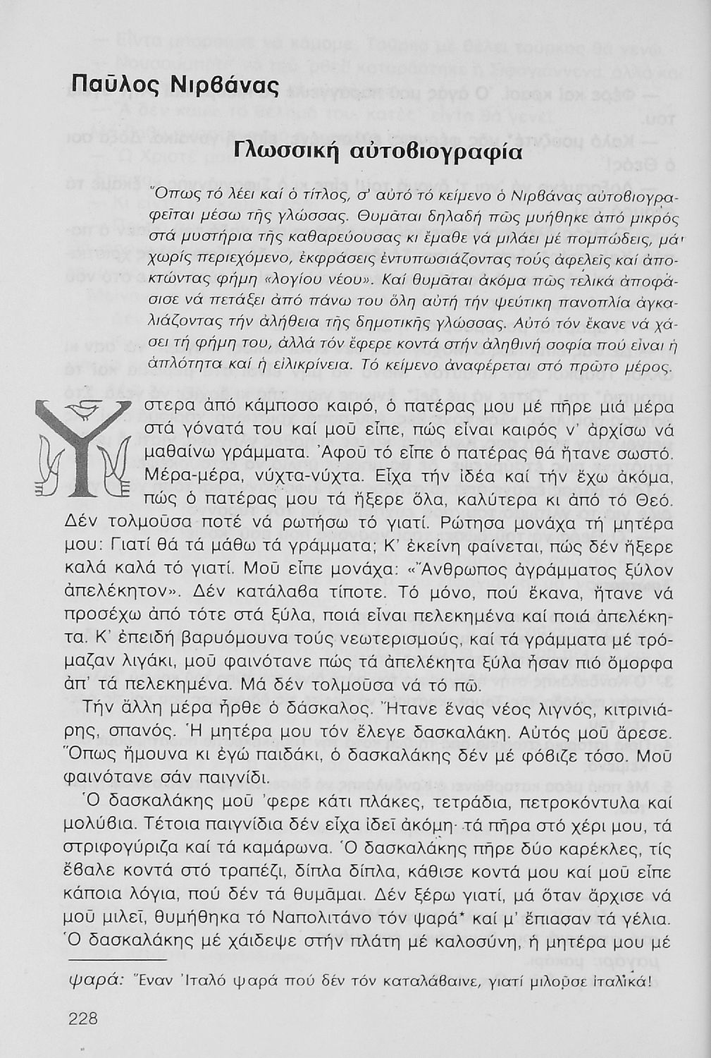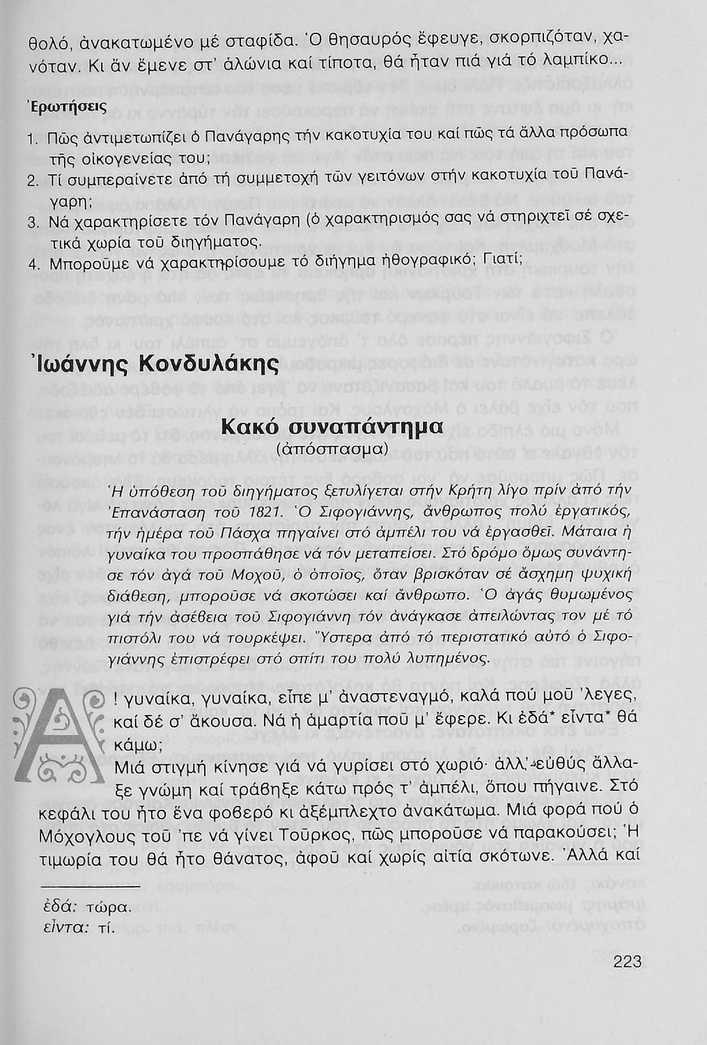Σχολικό εγχειρίδιο Νέων Ελληνικών Α΄ Γυμνασίου που περιλαμβάνει δοκίμια, πεζά και ποιήματα Ελλήνων συγγραφέων και δημοτικά τραγούδια εμπνευσμένα από τη θρησκευτική, εθνική και κοινωνική ζωή, τη "δοκιμασία της ...