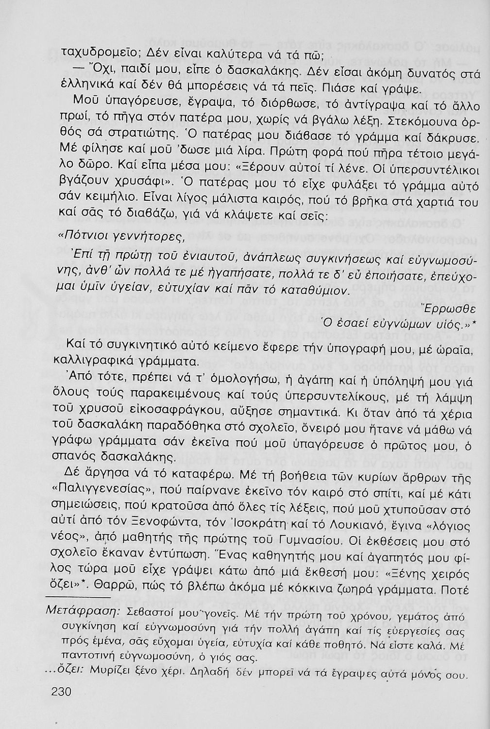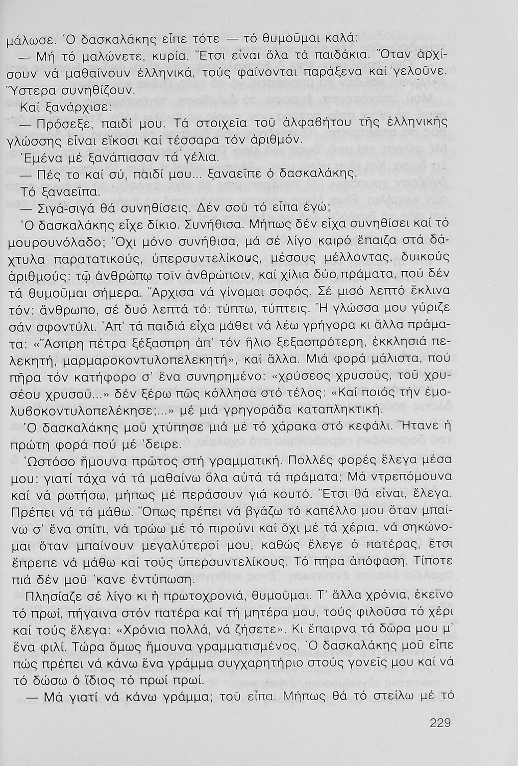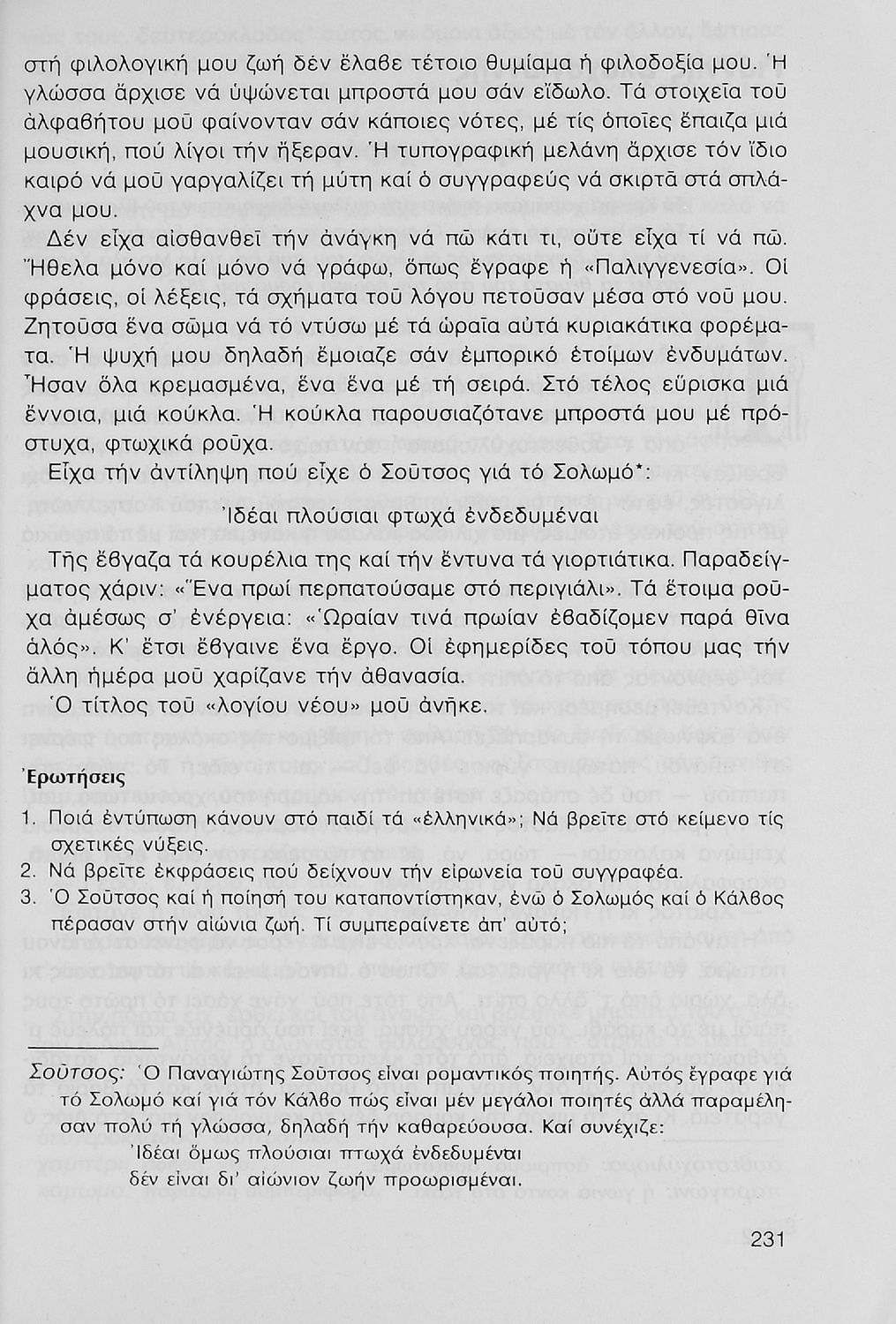 Σχολικό εγχειρίδιο Νέων Ελληνικών Γ΄ Γυμνασίου που περιλαμβάνει δημοτικά τραγούδια, και χαρακτηριστικά δείγματα της κρητικής λογοτεχνίας, της επτανησιακής και ρομαντικής σχολής, της Νέας Αθηναϊκής Σχολής και της νεότερης και μεταπολεμικής λογοτεχνίας. Περιέχει και έργα σύγχρονων ξένων συγγραφέων, βιογραφικά και εισαγωγικά σημειώματα.