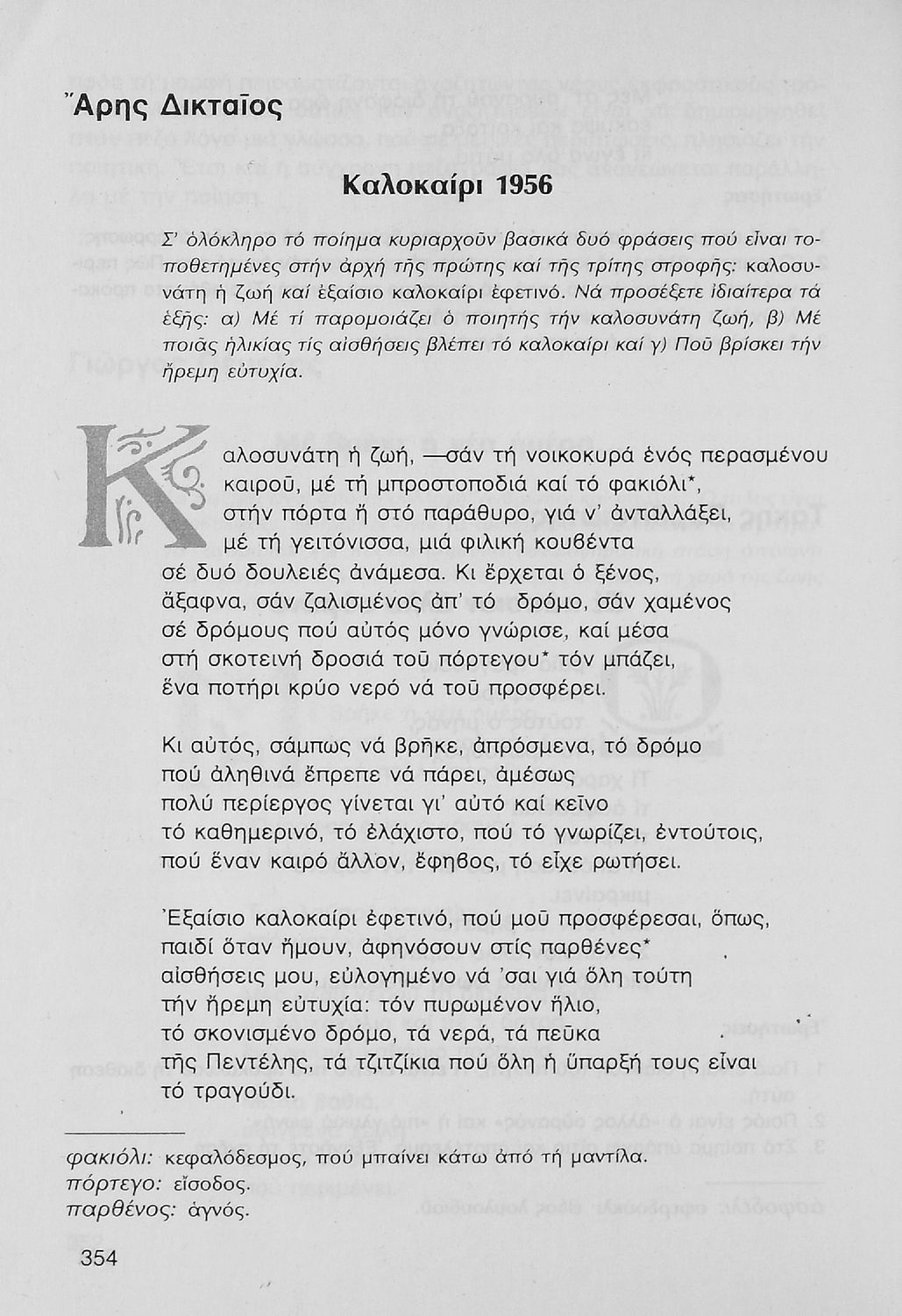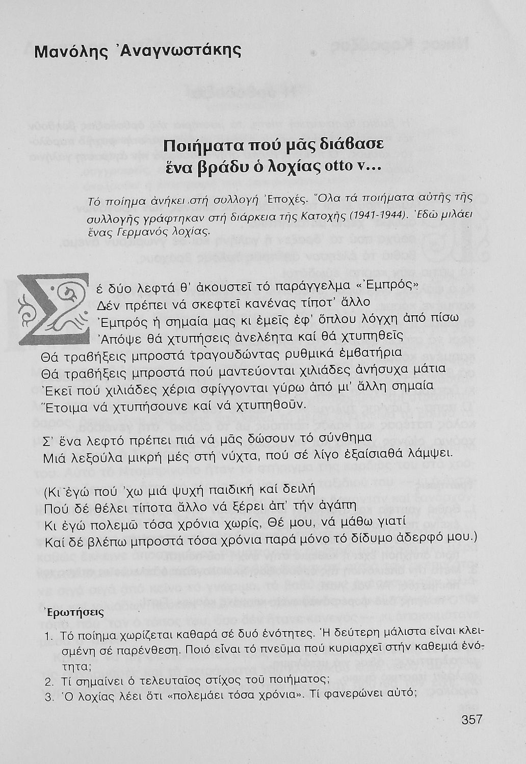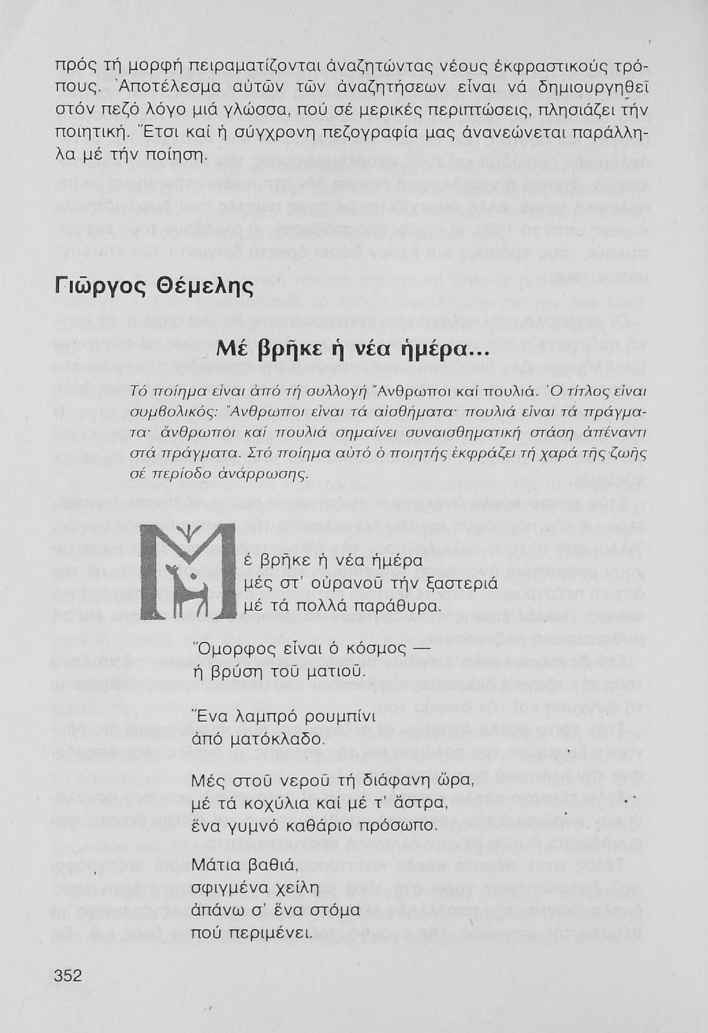 Σχολικό εγχειρίδιο Νέων Ελληνικών Γ΄ Γυμνασίου που περιλαμβάνει δημοτικά τραγούδια, και χαρακτηριστικά δείγματα της κρητικής λογοτεχνίας, της επτανησιακής και ρομαντικής σχολής, της Νέας Αθηναϊκής Σχολής και της νεότερης και μεταπολεμικής λογοτεχνίας. Περιέχει και έργα σύγχρονων ξένων συγγραφέων, βιογραφικά και εισαγωγικά σημειώματα.