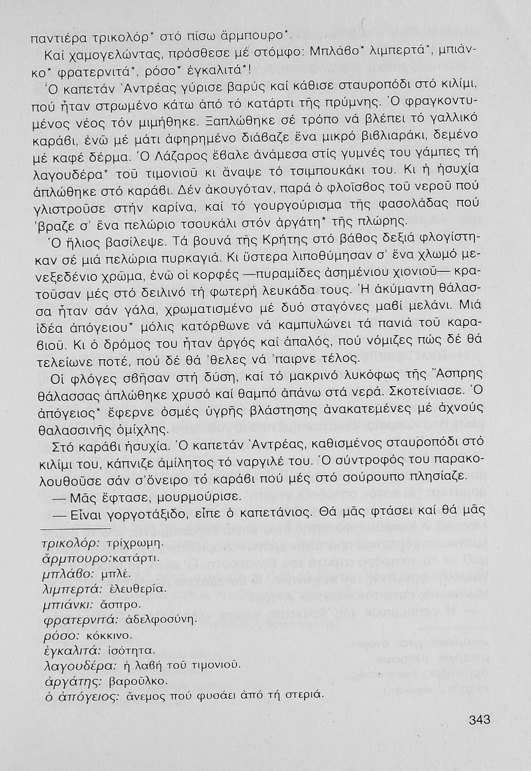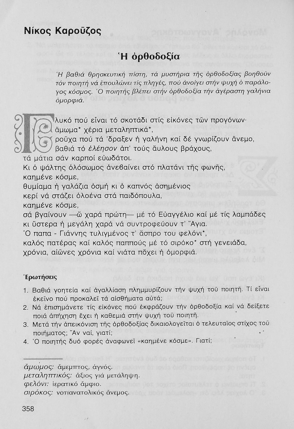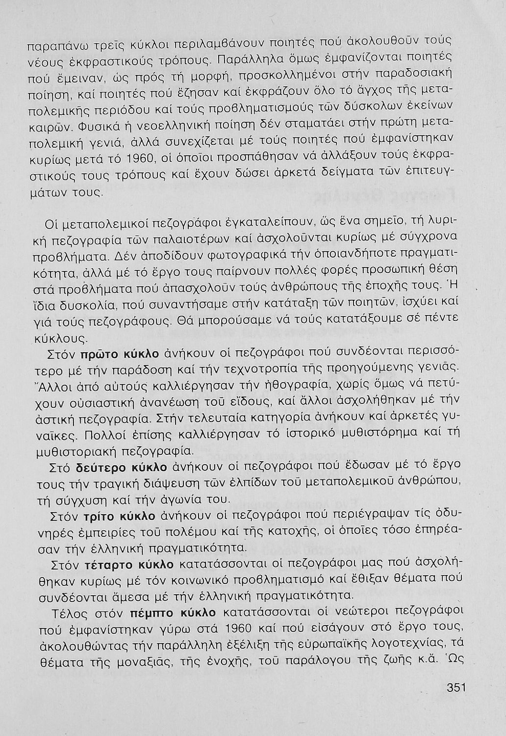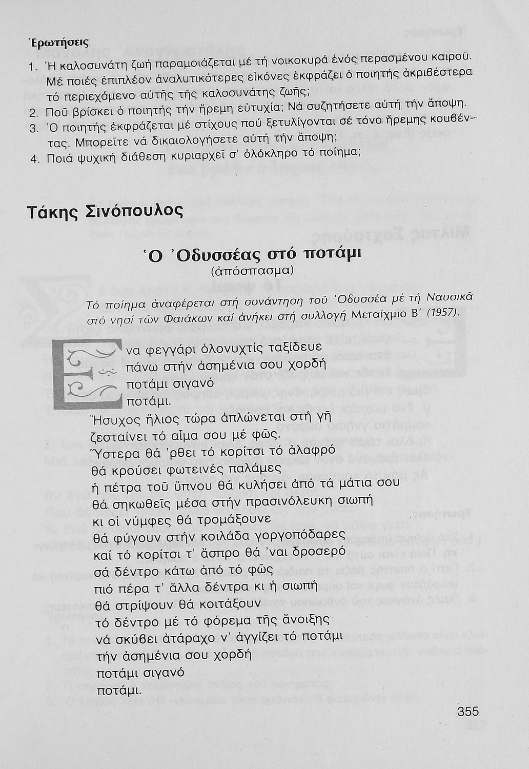 Σχολικό εγχειρίδιο Νέων Ελληνικών Γ΄ Γυμνασίου που περιλαμβάνει δημοτικά τραγούδια, και χαρακτηριστικά δείγματα της κρητικής λογοτεχνίας, της επτανησιακής και ρομαντικής σχολής, της Νέας Αθηναϊκής Σχολής και της νεότερης και μεταπολεμικής λογοτεχνίας. Περιέχει και έργα σύγχρονων ξένων συγγραφέων, βιογραφικά και εισαγωγικά σημειώματα.