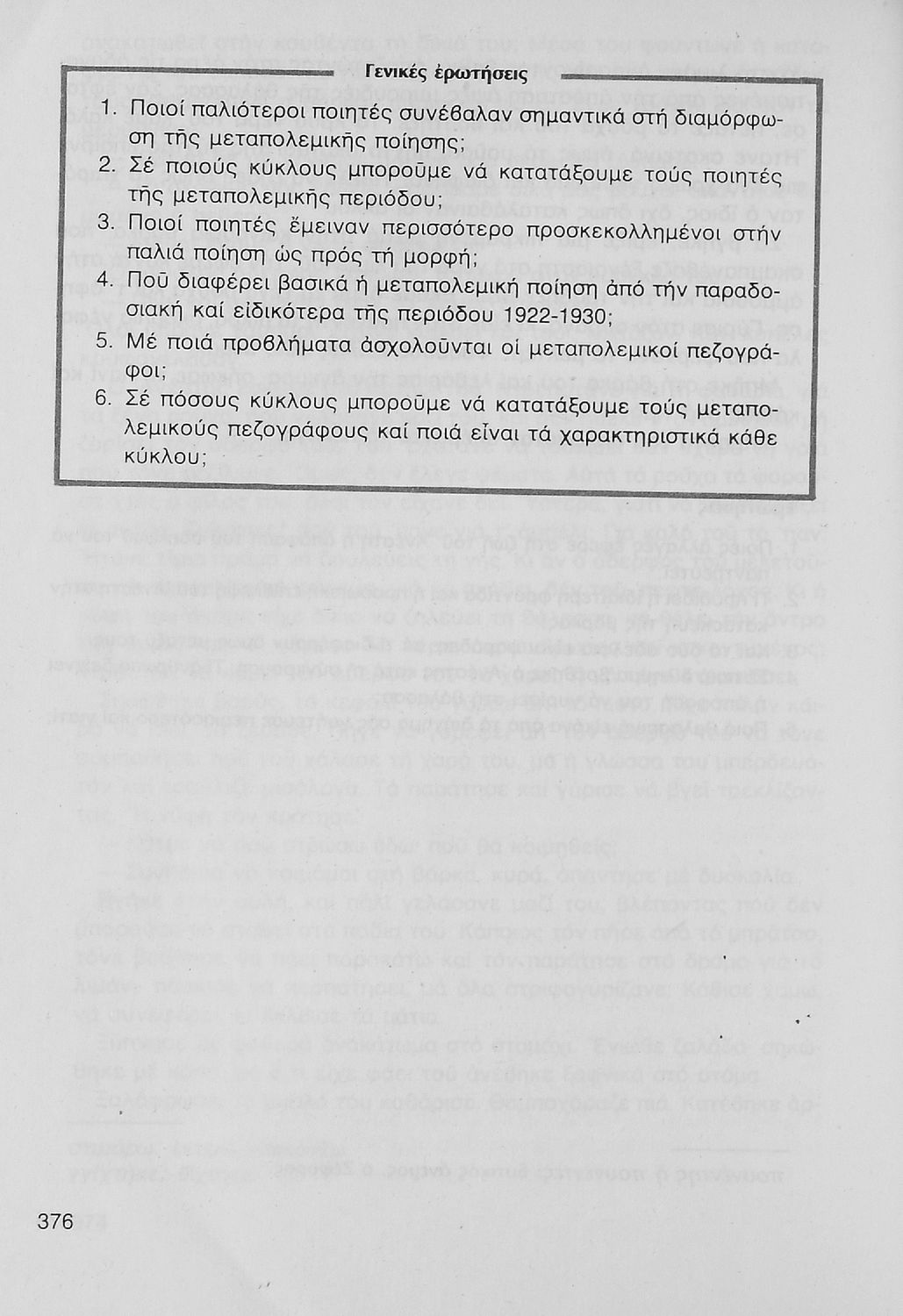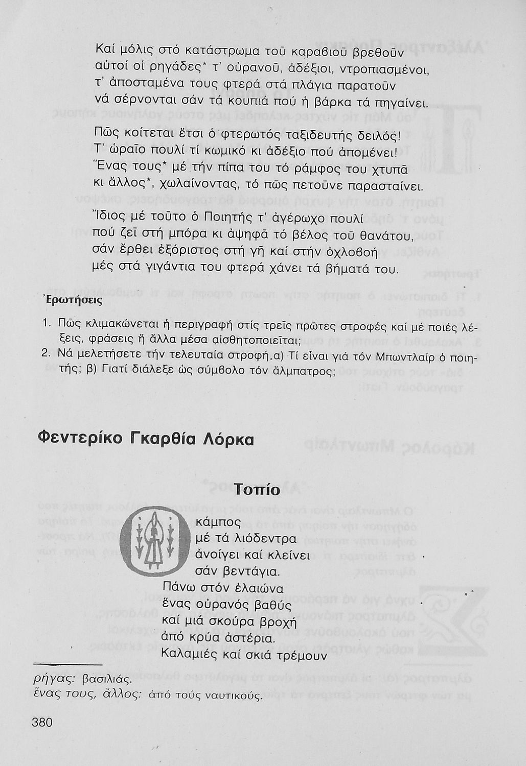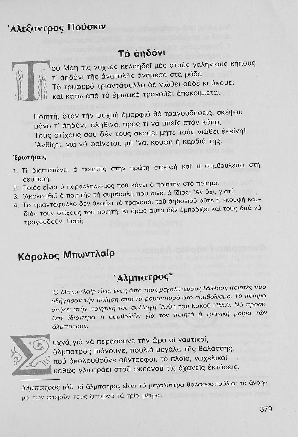 Σχολικό εγχειρίδιο Νέων Ελληνικών Γ΄ Γυμνασίου που περιλαμβάνει δημοτικά τραγούδια, και χαρακτηριστικά δείγματα της κρητικής λογοτεχνίας, της επτανησιακής και ρομαντικής σχολής, της Νέας Αθηναϊκής Σχολής και της νεότερης και μεταπολεμικής λογοτεχνίας. Περιέχει και έργα σύγχρονων ξένων συγγραφέων, βιογραφικά και εισαγωγικά σημειώματα.