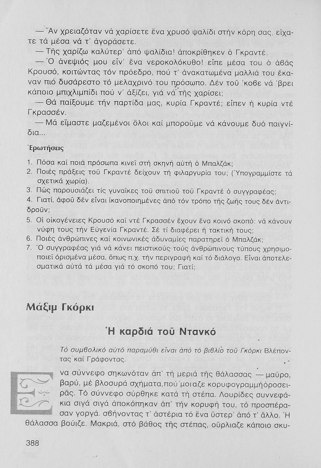 Σχολικό εγχειρίδιο Νέων Ελληνικών Γ΄ Γυμνασίου που περιλαμβάνει δημοτικά τραγούδια, και χαρακτηριστικά δείγματα της κρητικής λογοτεχνίας, της επτανησιακής και ρομαντικής σχολής, της Νέας Αθηναϊκής Σχολής και της νεότερης και μεταπολεμικής λογοτεχνίας. Περιέχει και έργα σύγχρονων ξένων συγγραφέων, βιογραφικά και εισαγωγικά σημειώματα.