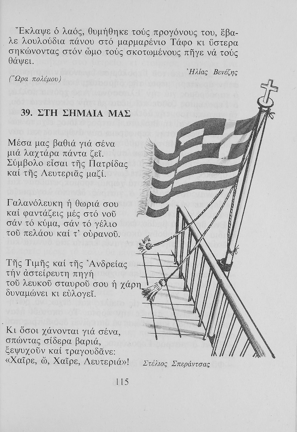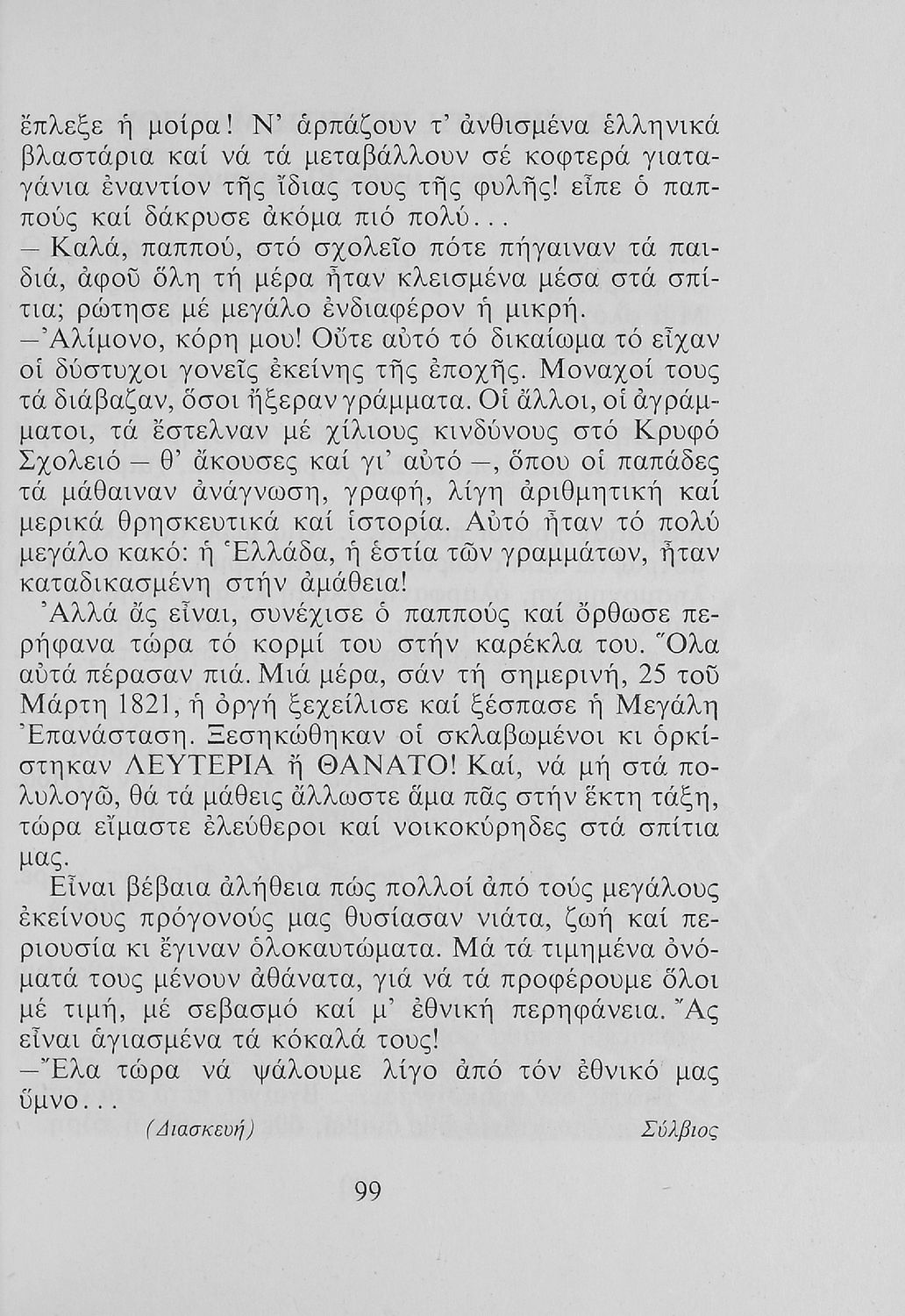 Αναγνωστικό Ε΄ Δημοτικού που περιέχει πεζά και ποιήματα εμπνευσμένα από τη θρησκευτική, εθνική, κοινωνική ζωή καθώς και από τις ασχολίες των Ελλήνων, την αρχαία και σύγχρονη ελληνική ιστορία και τον πολιτισμό.