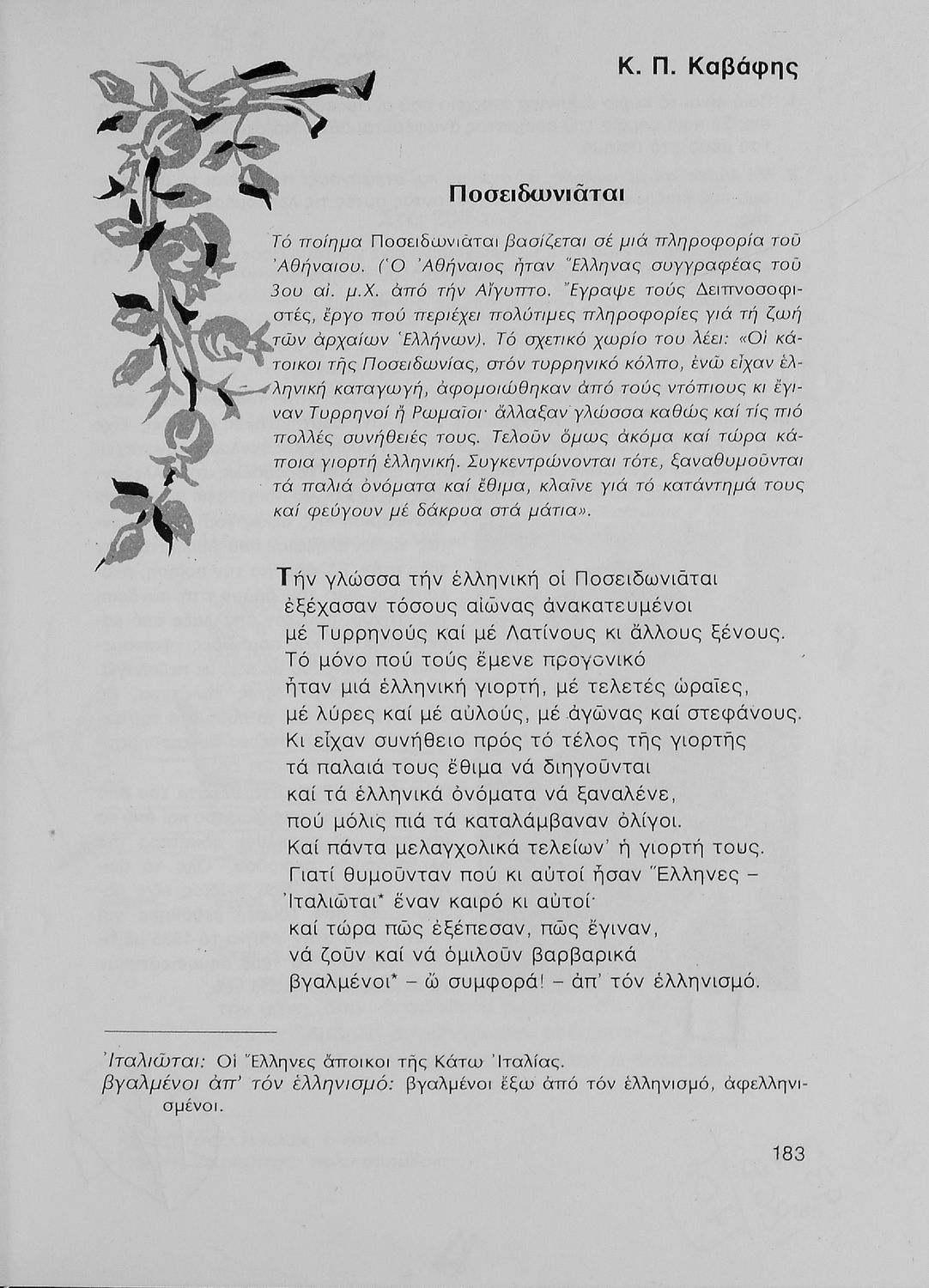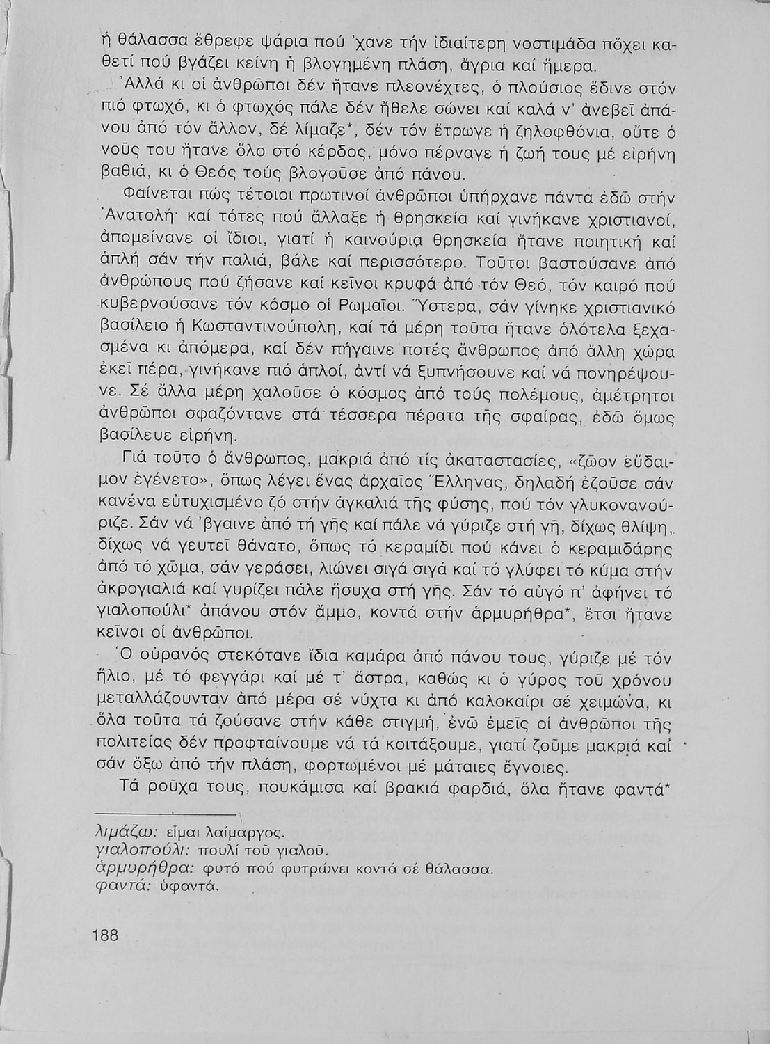 Σχολικό εγχειρίδιο Νέων Ελληνικών Β' Γυμνασίου που περιέχει δημοτικά τραγούδια, πεζά, δοκίμια και ποιήματα σύγχρονων Ελλήνων συγγραφέων και είναι χωρισμένο σε θεματικές ενότητες όπως η πόλη και η ύπαιθρος, η εποχή του 40' και η κατοχή, η θρησκευτική ζωή, ο καημός της ξενιτιάς, ο ελληνισμός έξω από τα σύνορα, οι αγώνες Ακριτών-Κλεφτών κ.α. Περιλαμβάνει και έργα ευρωπαίων λογοτεχνών.