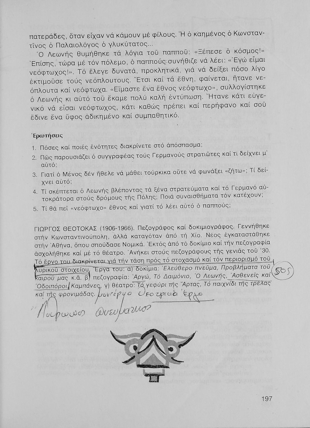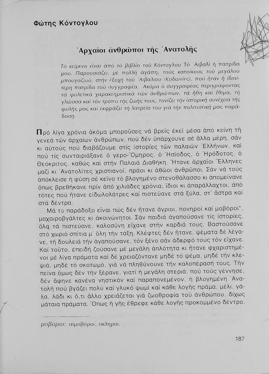Σχολικό εγχειρίδιο Νέων Ελληνικών Α΄ Γυμνασίου που περιλαμβάνει δοκίμια, πεζά και ποιήματα Ελλήνων συγγραφέων και δημοτικά τραγούδια εμπνευσμένα από τη θρησκευτική, εθνική και κοινωνική ζωή, τη "δοκιμασία της ...