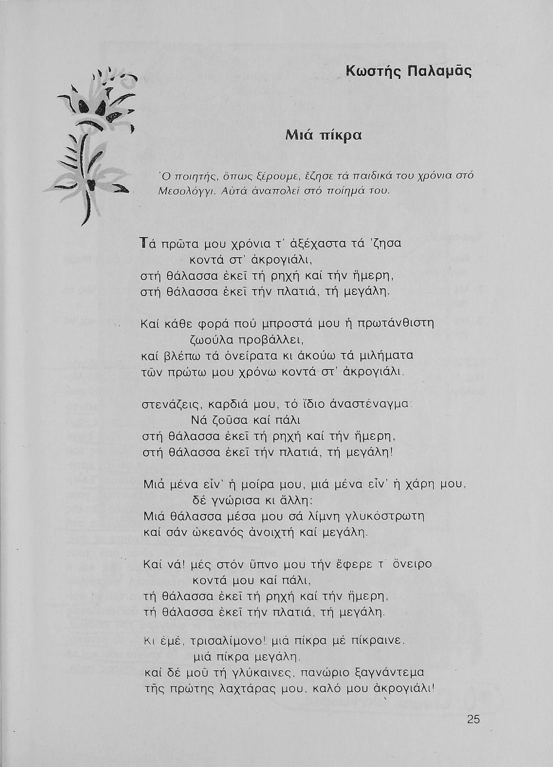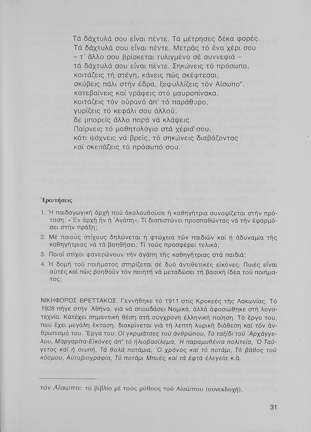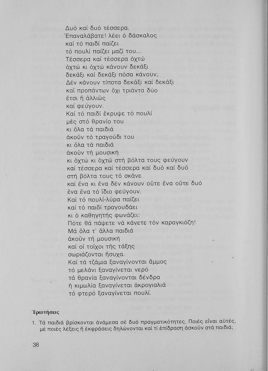 Σχολικό εγχειρίδιο Νέων Ελληνικών Β' Γυμνασίου που περιέχει δημοτικά τραγούδια, πεζά, δοκίμια και ποιήματα σύγχρονων Ελλήνων συγγραφέων και είναι χωρισμένο σε θεματικές ενότητες όπως η πόλη και η ύπαιθρος, η εποχή του 40' και η κατοχή, η θρησκευτική ζωή, ο καημός της ξενιτιάς, ο ελληνισμός έξω από τα σύνορα, οι αγώνες Ακριτών-Κλεφτών κ.α. Περιλαμβάνει και έργα ευρωπαίων λογοτεχνών.