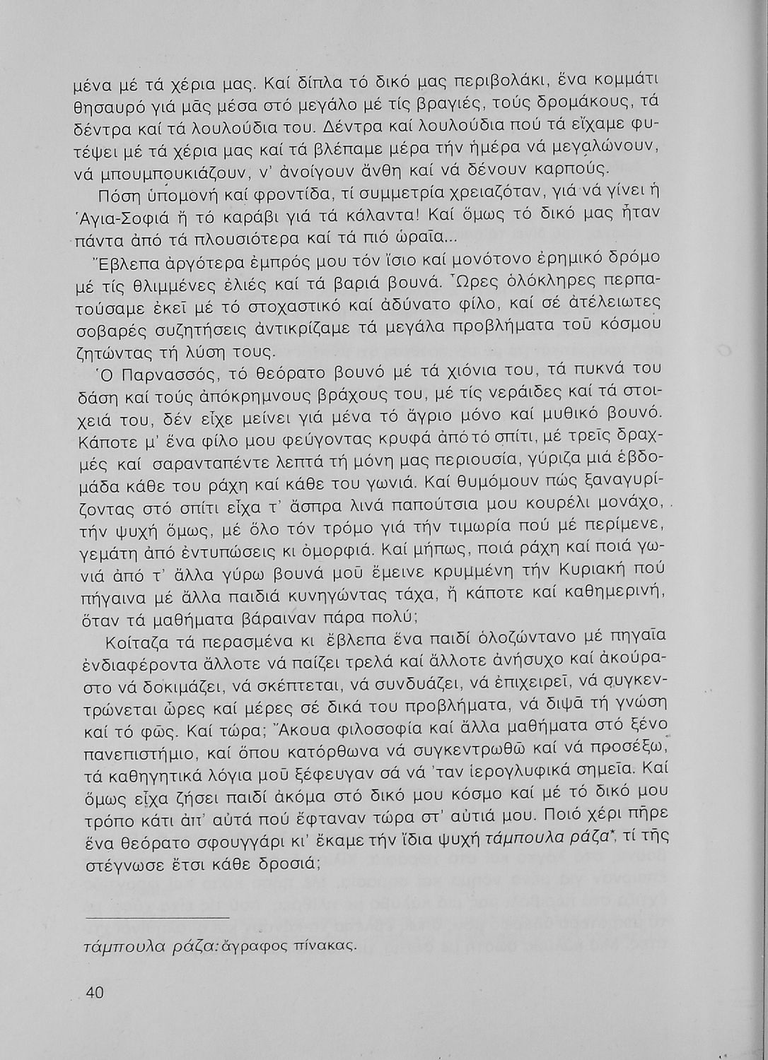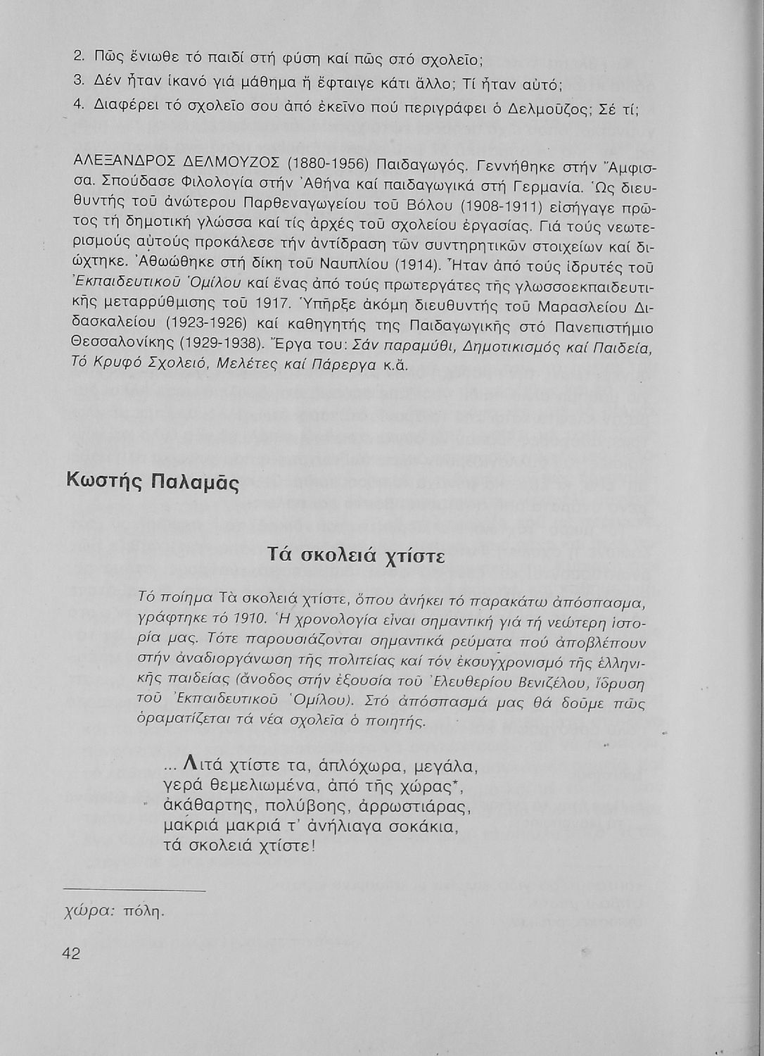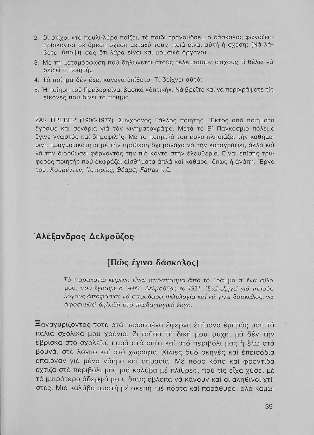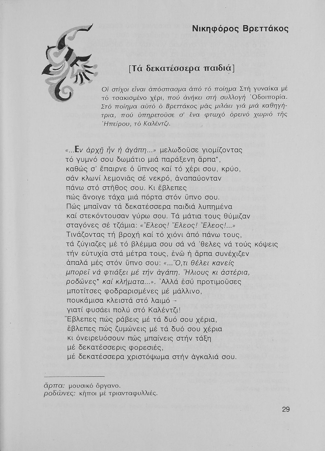 Σχολικό εγχειρίδιο Νέων Ελληνικών Β' Γυμνασίου που περιέχει δημοτικά τραγούδια, πεζά, δοκίμια και ποιήματα σύγχρονων Ελλήνων συγγραφέων και είναι χωρισμένο σε θεματικές ενότητες όπως η πόλη και η ύπαιθρος, η εποχή του 40' και η κατοχή, η θρησκευτική ζωή, ο καημός της ξενιτιάς, ο ελληνισμός έξω από τα σύνορα, οι αγώνες Ακριτών-Κλεφτών κ.α. Περιλαμβάνει και έργα ευρωπαίων λογοτεχνών.