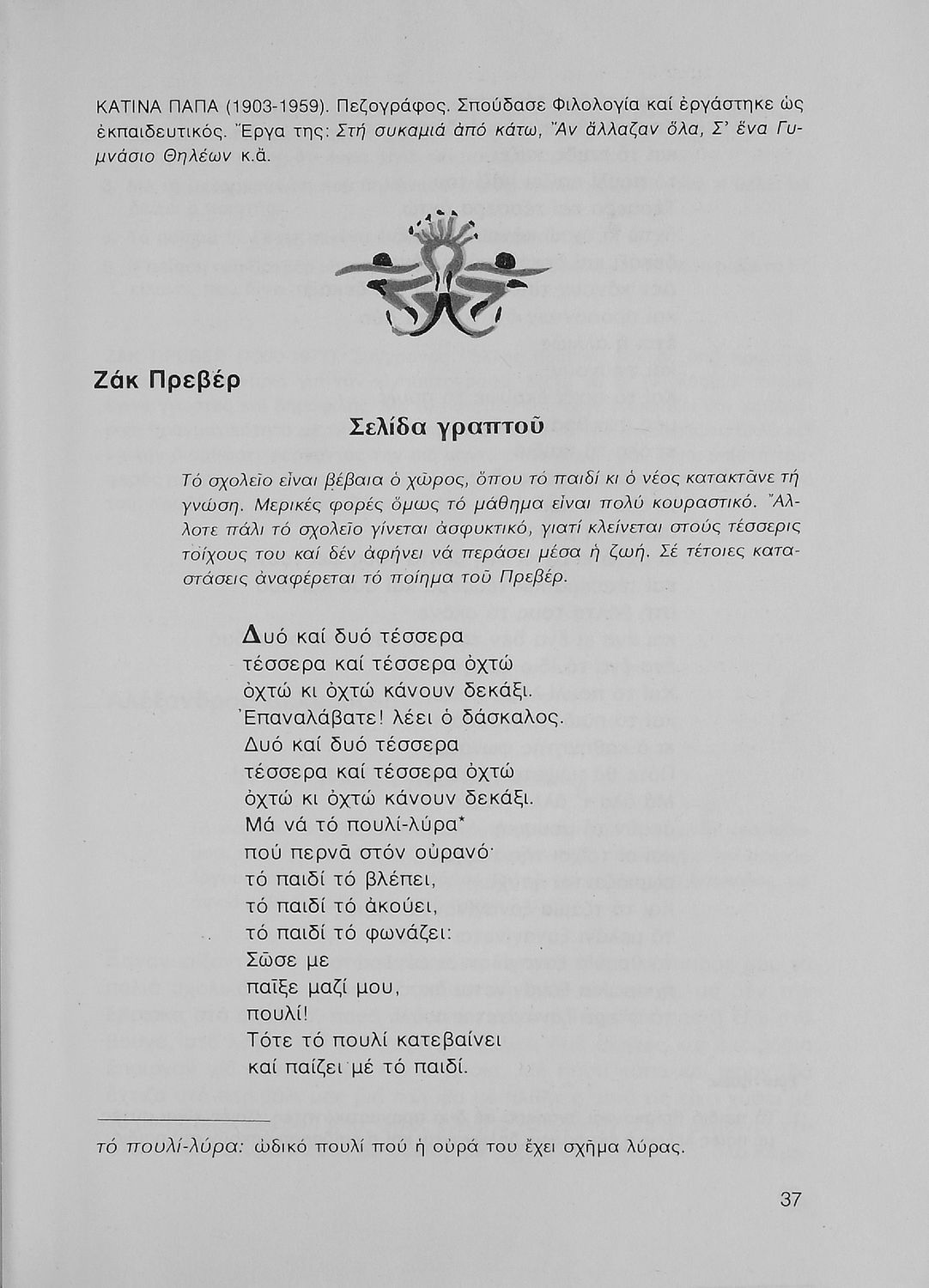 Σχολικό εγχειρίδιο Νέων Ελληνικών Α΄ Γυμνασίου που περιλαμβάνει δοκίμια, πεζά και ποιήματα Ελλήνων συγγραφέων και δημοτικά τραγούδια εμπνευσμένα από τη θρησκευτική, εθνική και κοινωνική ζωή, τη "δοκιμασία της ...