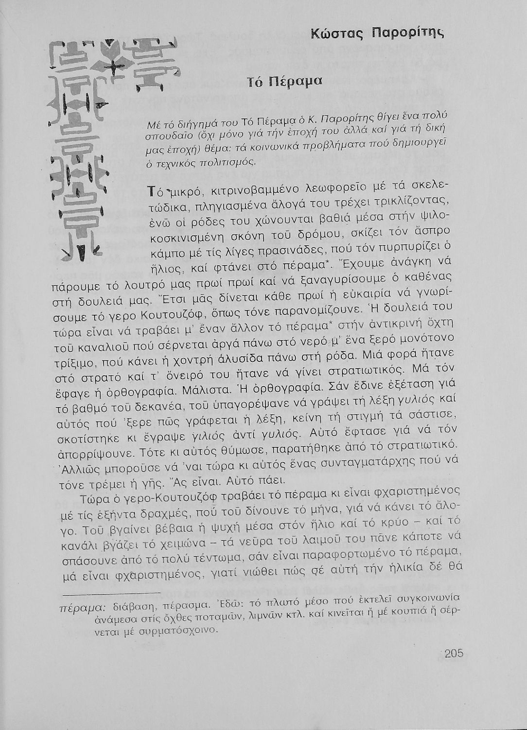 Σχολικό εγχειρίδιο Νέων Ελληνικών Α΄ Γυμνασίου που περιλαμβάνει δοκίμια, πεζά και ποιήματα Ελλήνων συγγραφέων και δημοτικά τραγούδια εμπνευσμένα από τη θρησκευτική, εθνική και κοινωνική ζωή, τη "δοκιμασία της ...