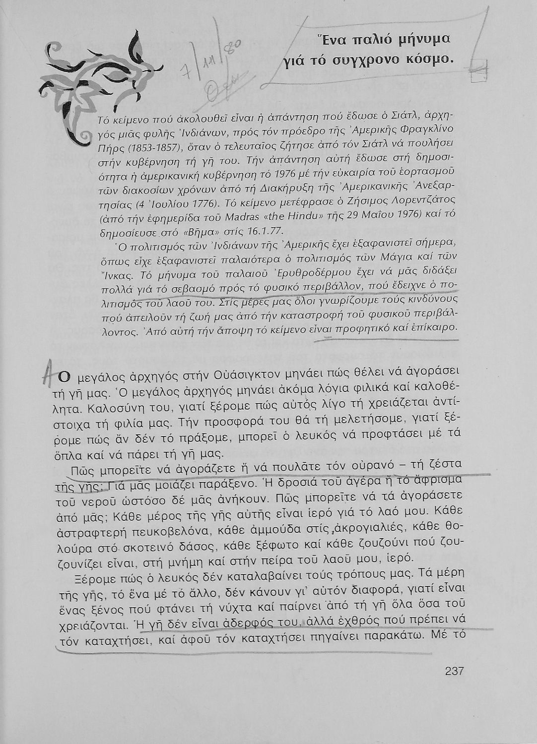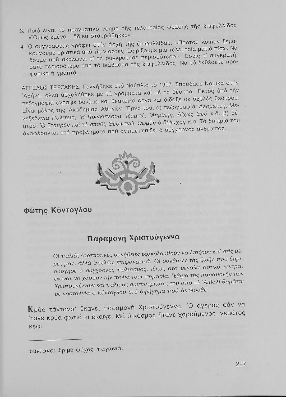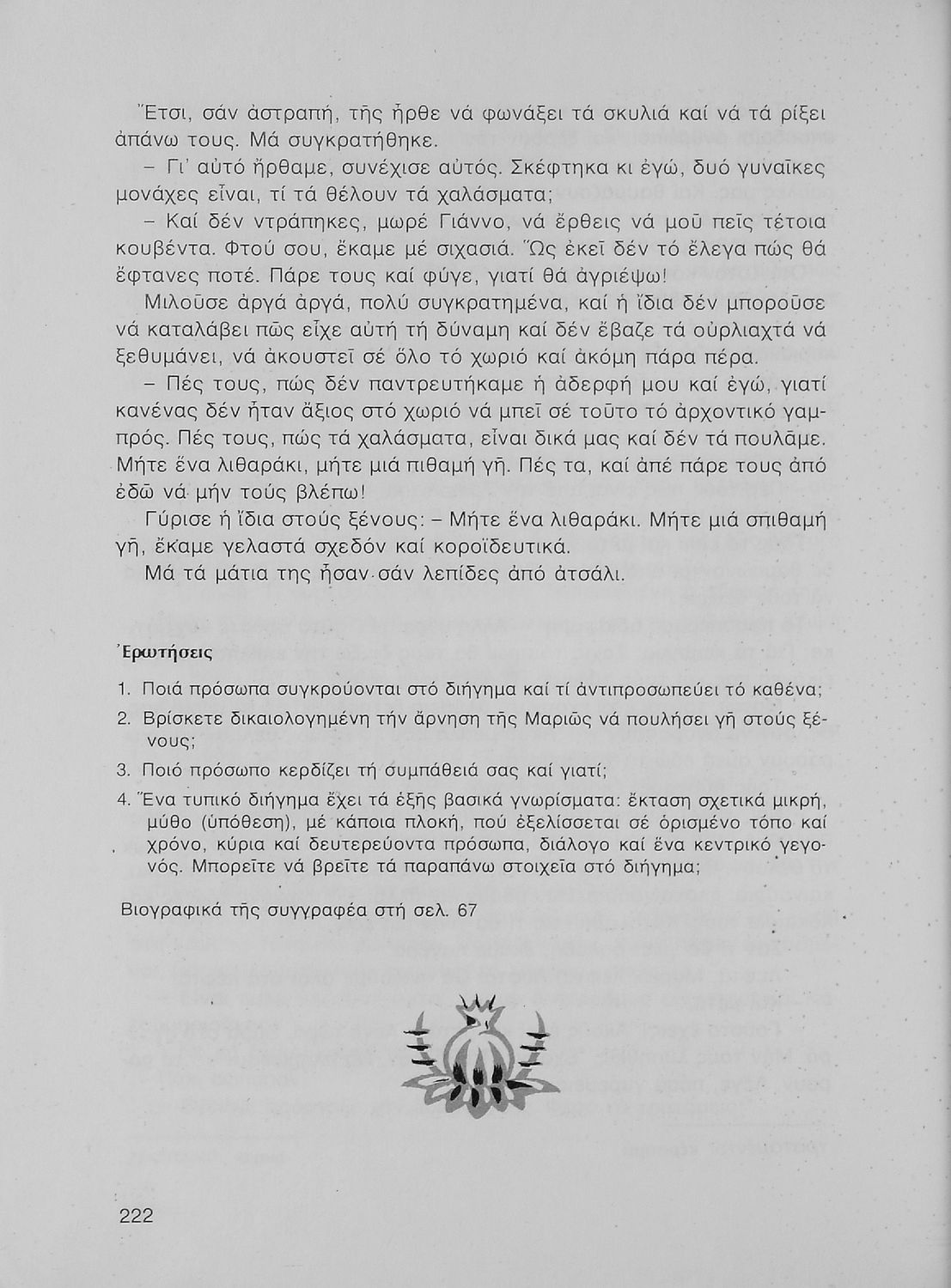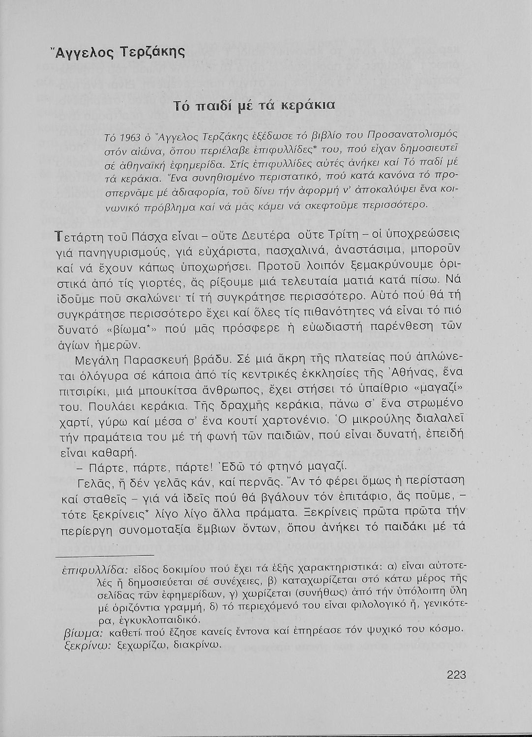 Σχολικό εγχειρίδιο Νέων Ελληνικών Α΄ Γυμνασίου που περιλαμβάνει δοκίμια, πεζά και ποιήματα Ελλήνων συγγραφέων και δημοτικά τραγούδια εμπνευσμένα από τη θρησκευτική, εθνική και κοινωνική ζωή, τη "δοκιμασία της ...