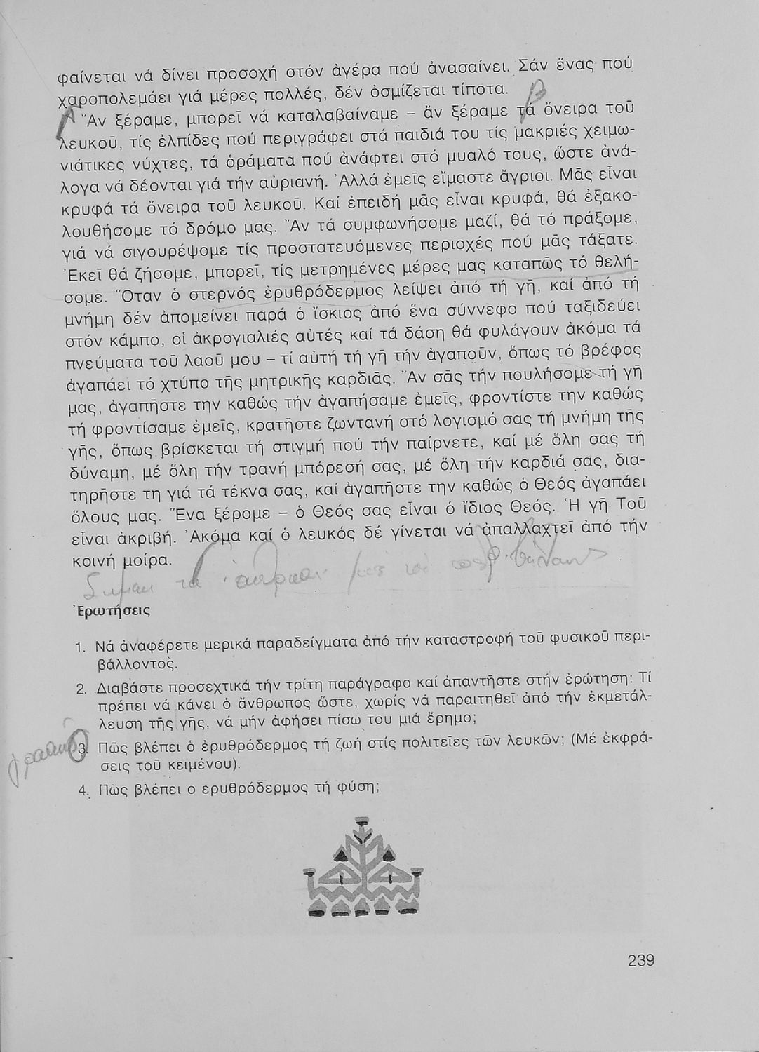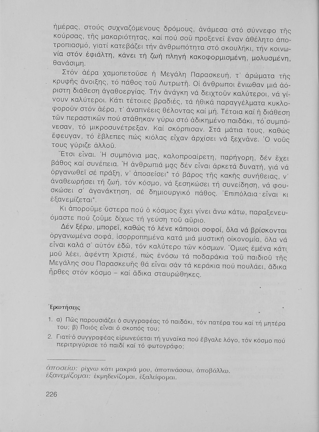 Σχολικό εγχειρίδιο Νέων Ελληνικών Β' Γυμνασίου που περιέχει δημοτικά τραγούδια, πεζά, δοκίμια και ποιήματα σύγχρονων Ελλήνων συγγραφέων και είναι χωρισμένο σε θεματικές ενότητες όπως η πόλη και η ύπαιθρος, η εποχή του 40' και η κατοχή, η θρησκευτική ζωή, ο καημός της ξενιτιάς, ο ελληνισμός έξω από τα σύνορα, οι αγώνες Ακριτών-Κλεφτών κ.α. Περιλαμβάνει και έργα ευρωπαίων λογοτεχνών.