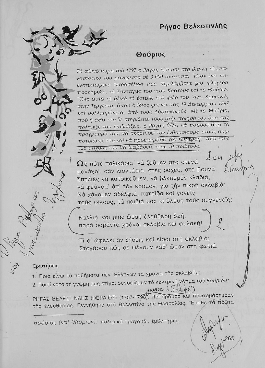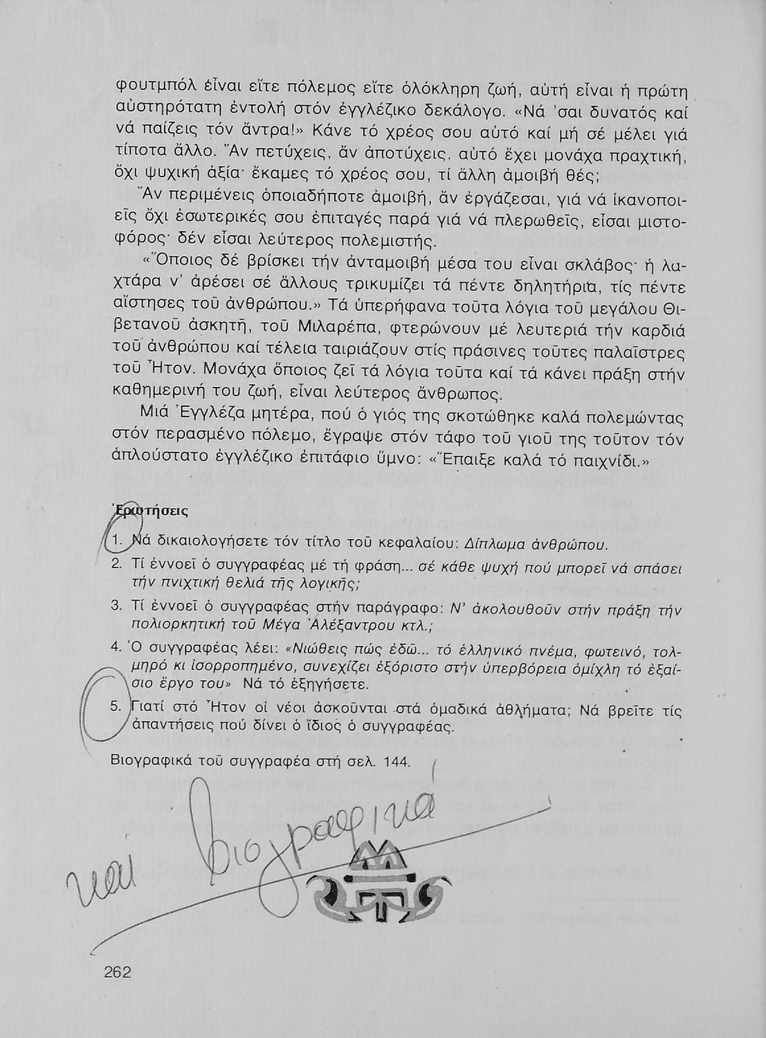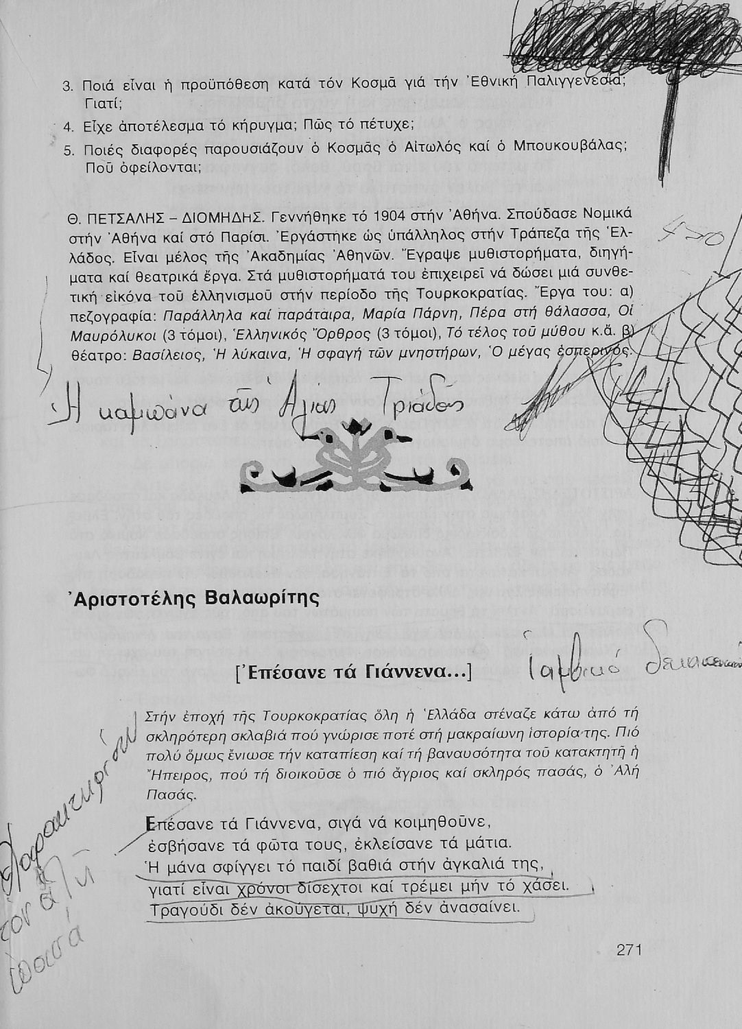 Σχολικό εγχειρίδιο Νέων Ελληνικών Α΄ Γυμνασίου που περιλαμβάνει δοκίμια, πεζά και ποιήματα Ελλήνων συγγραφέων και δημοτικά τραγούδια εμπνευσμένα από τη θρησκευτική, εθνική και κοινωνική ζωή, τη "δοκιμασία της ...