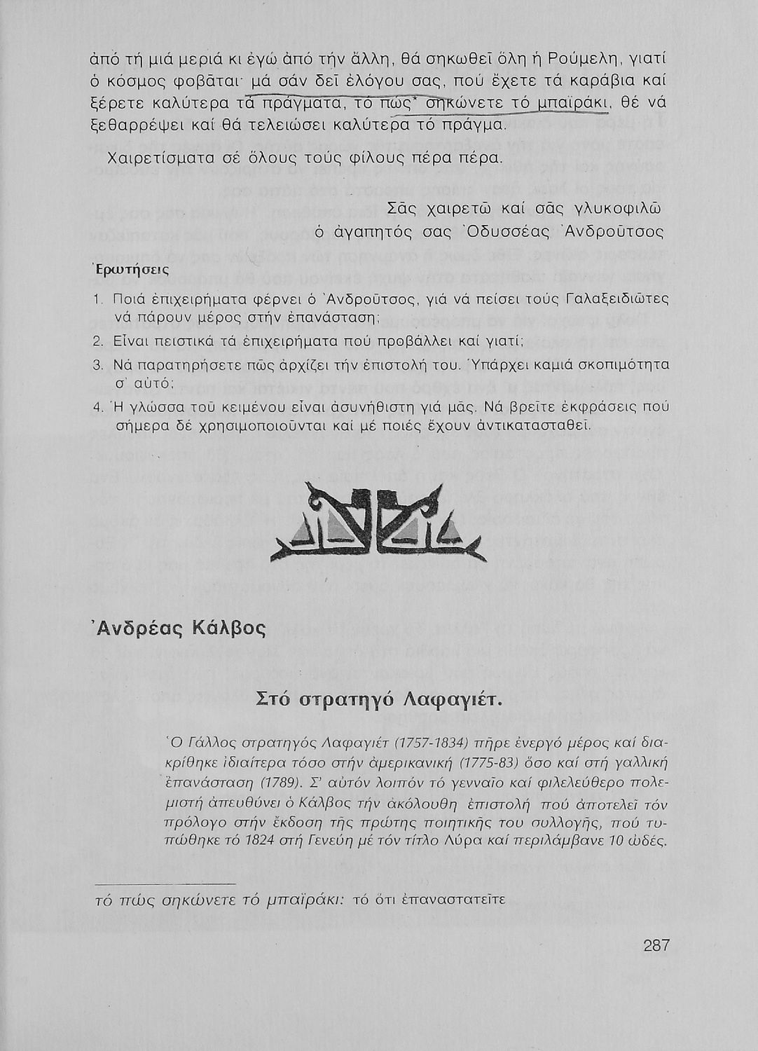 Σχολικό εγχειρίδιο Νέων Ελληνικών Α΄ Γυμνασίου που περιλαμβάνει δοκίμια, πεζά και ποιήματα Ελλήνων συγγραφέων και δημοτικά τραγούδια εμπνευσμένα από τη θρησκευτική, εθνική και κοινωνική ζωή, τη "δοκιμασία της ...