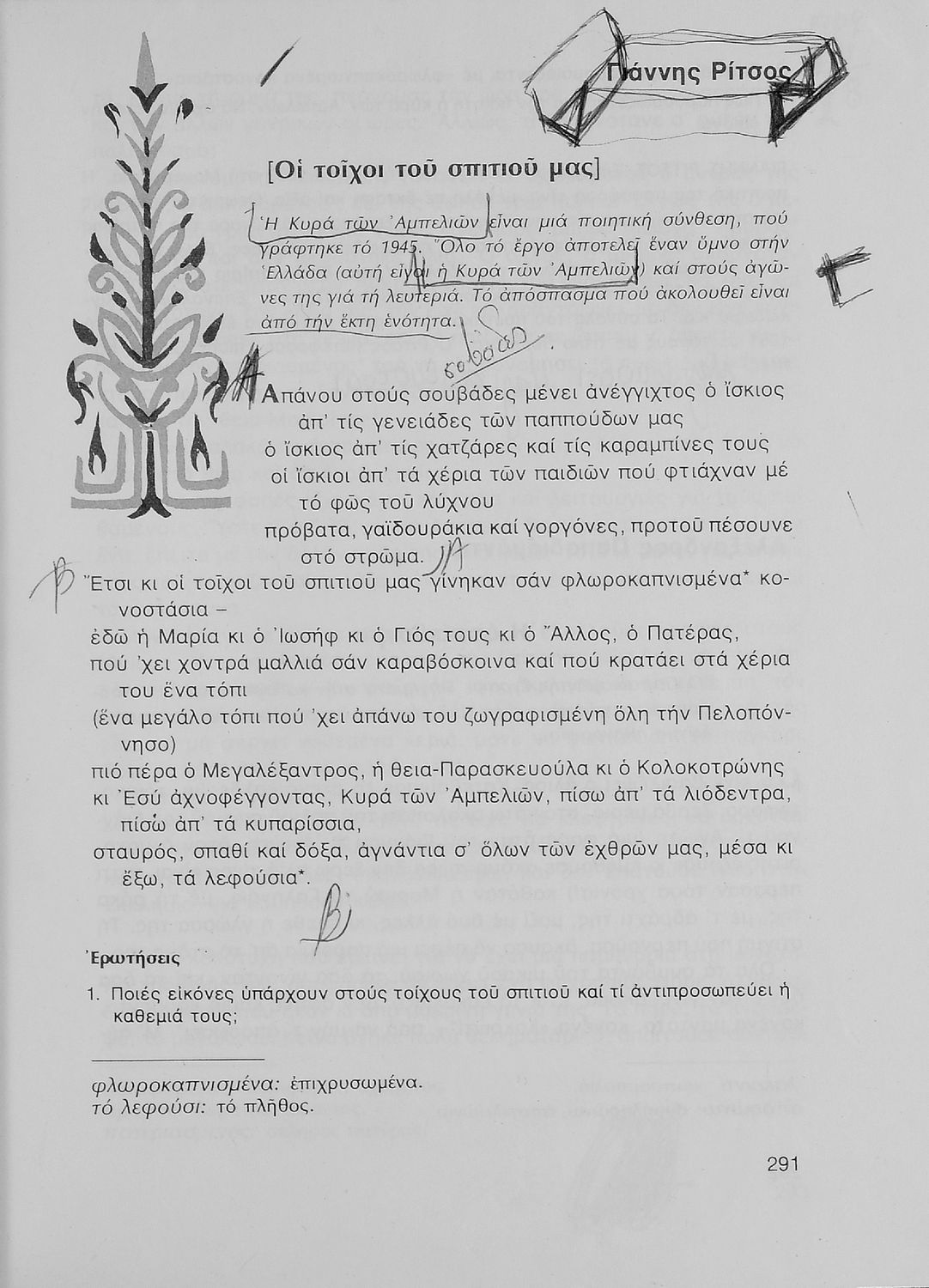 Σχολικό εγχειρίδιο Νέων Ελληνικών Β' Γυμνασίου που περιέχει δημοτικά τραγούδια, πεζά, δοκίμια και ποιήματα σύγχρονων Ελλήνων συγγραφέων και είναι χωρισμένο σε θεματικές ενότητες όπως η πόλη και η ύπαιθρος, η εποχή του 40' και η κατοχή, η θρησκευτική ζωή, ο καημός της ξενιτιάς, ο ελληνισμός έξω από τα σύνορα, οι αγώνες Ακριτών-Κλεφτών κ.α. Περιλαμβάνει και έργα ευρωπαίων λογοτεχνών.