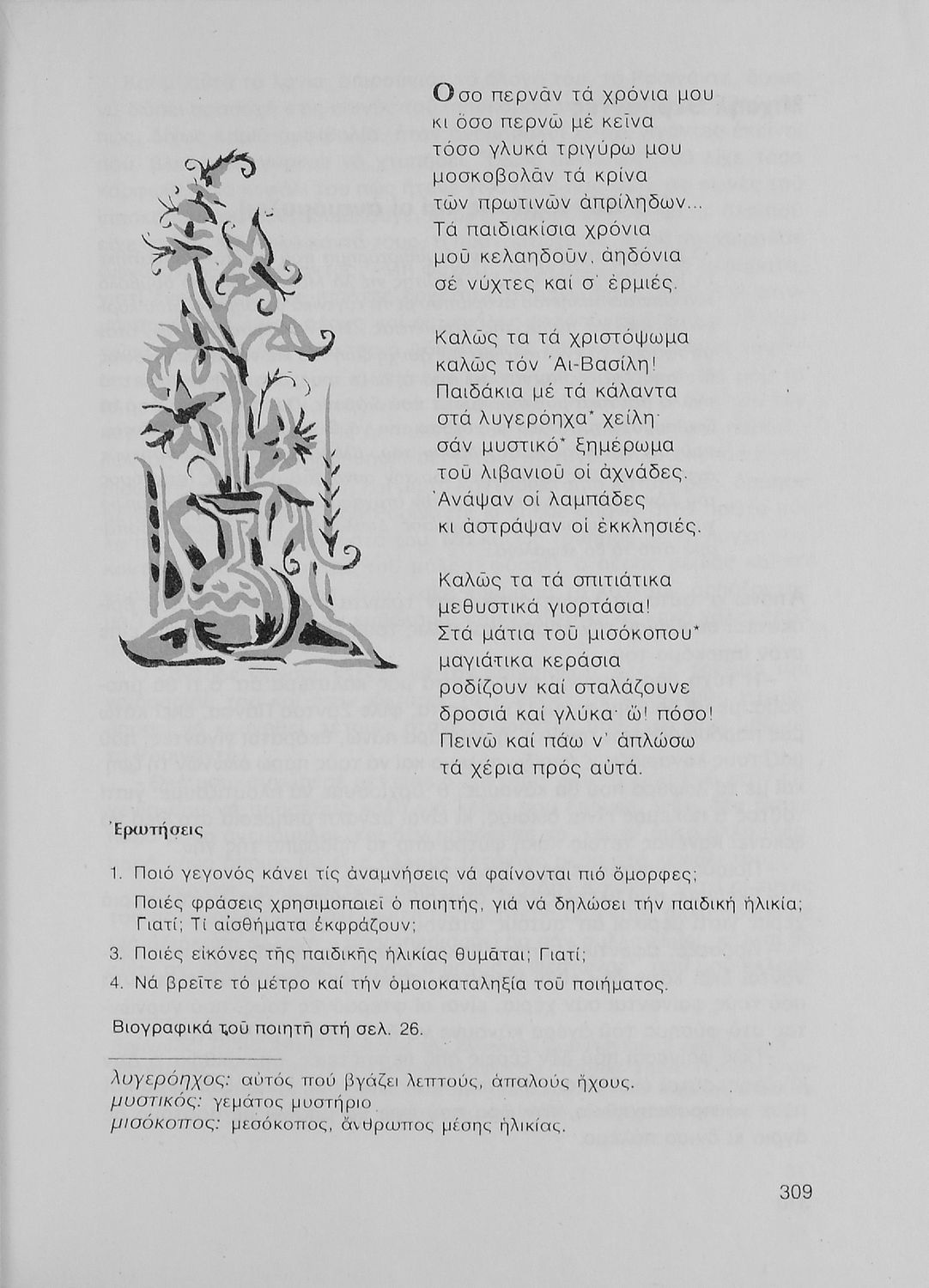 Σχολικό εγχειρίδιο Νέων Ελληνικών Β' Γυμνασίου που περιέχει δημοτικά τραγούδια, πεζά, δοκίμια και ποιήματα σύγχρονων Ελλήνων συγγραφέων και είναι χωρισμένο σε θεματικές ενότητες όπως η πόλη και η ύπαιθρος, η εποχή του 40' και η κατοχή, η θρησκευτική ζωή, ο καημός της ξενιτιάς, ο ελληνισμός έξω από τα σύνορα, οι αγώνες Ακριτών-Κλεφτών κ.α. Περιλαμβάνει και έργα ευρωπαίων λογοτεχνών.