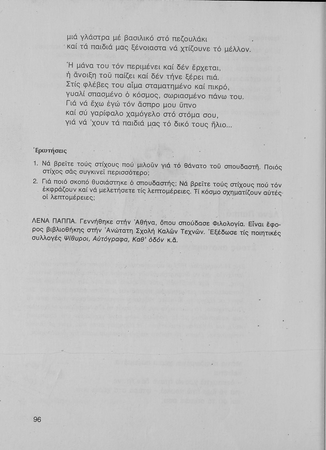 Σχολικό εγχειρίδιο Νέων Ελληνικών Β' Γυμνασίου που περιέχει δημοτικά τραγούδια, πεζά, δοκίμια και ποιήματα σύγχρονων Ελλήνων συγγραφέων και είναι χωρισμένο σε θεματικές ενότητες όπως η πόλη και η ύπαιθρος, η εποχή του 40' και η κατοχή, η θρησκευτική ζωή, ο καημός της ξενιτιάς, ο ελληνισμός έξω από τα σύνορα, οι αγώνες Ακριτών-Κλεφτών κ.α. Περιλαμβάνει και έργα ευρωπαίων λογοτεχνών.