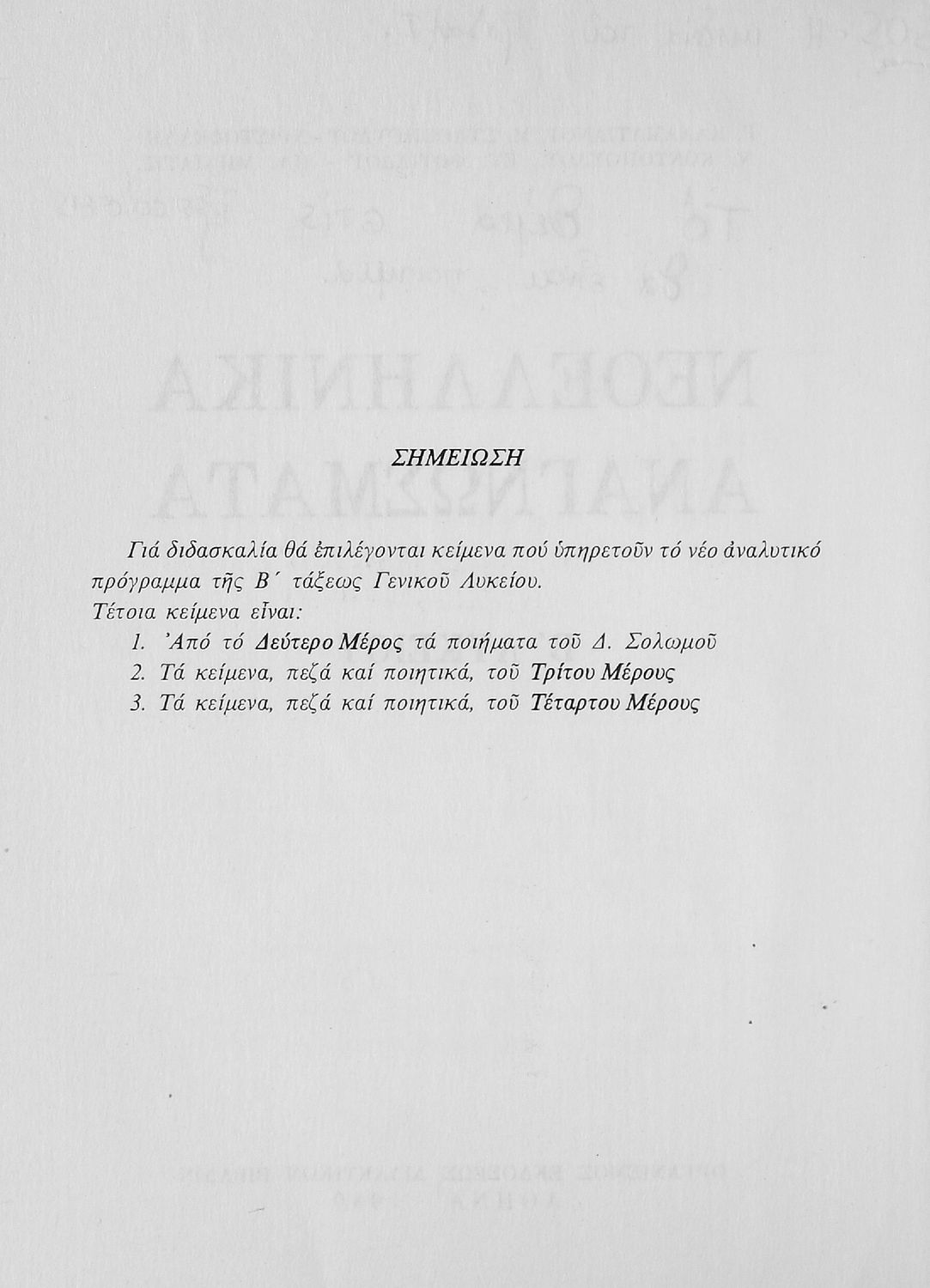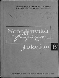Σχολικό εγχειρίδιο Νέων Ελληνικών Β' Ελληνικού Σχολείου που περιλαμβάνει ποιήματα και πεζά Ελλήνων συγγραφέων και δημοτικά τραγούδια εμπνευσμένα από την σύγχρονη ελληνική ιστορία, την ελληνική φύση και τη ζωή ...