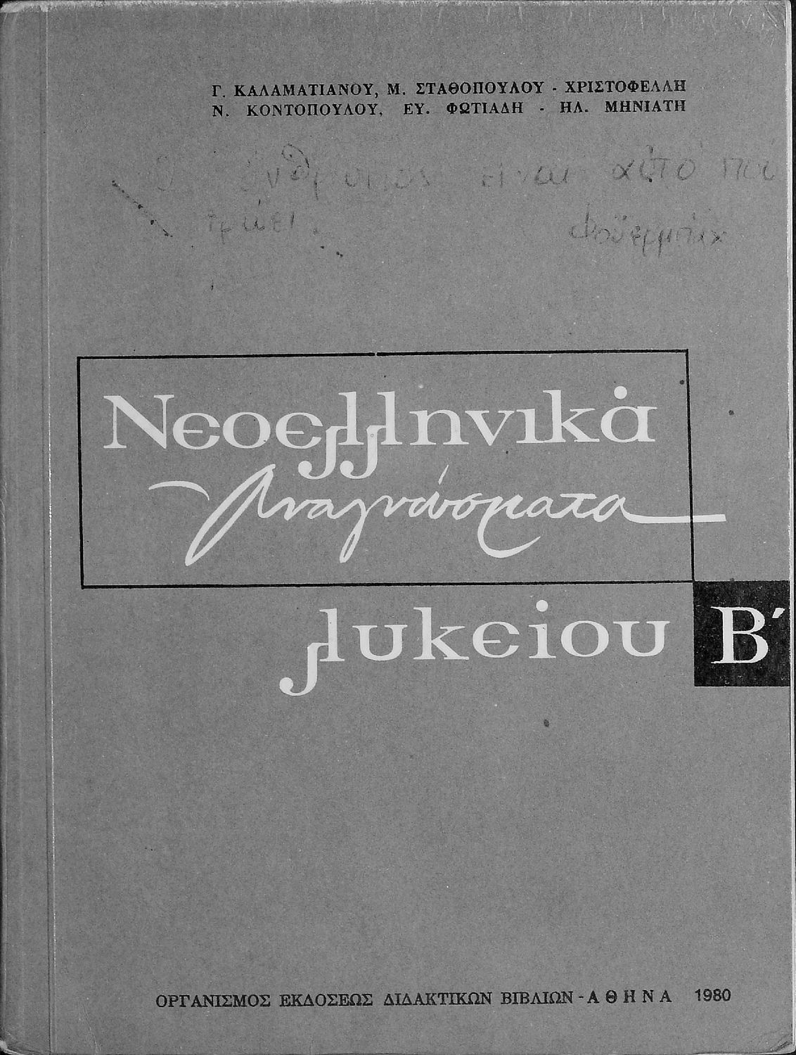 Σχολικό εγχειρίδιο Νέων Ελληνικών για την Β΄ Λυκείου με κείμενα και ποιήματα Ελλήνων και ξένων λογοτεχνών και ποιητών. Τα κείμενα προέρχονται από τη Βυζαντινή περίοδο ως και τη περίοδο των χρόνων του ελεύθερου