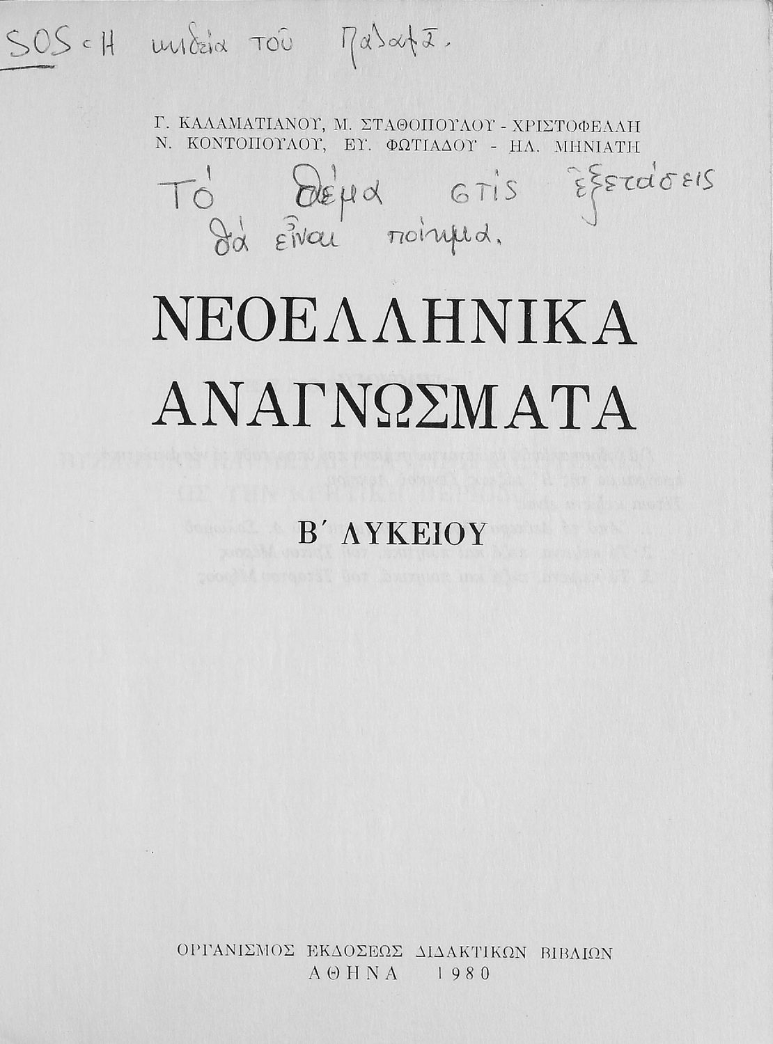 Σχολικό εγχειρίδιο Νέων Ελληνικών ΣΤ΄ Γυμνασίου και Λυκείου που περιλαμβάνει κείμενα Ελλήνων και ξένων συγγραφέων με θέματα από την σύγχρονη ελληνική ιστορία και την οικογενειακή και θρησκευτική ζωή, και ...