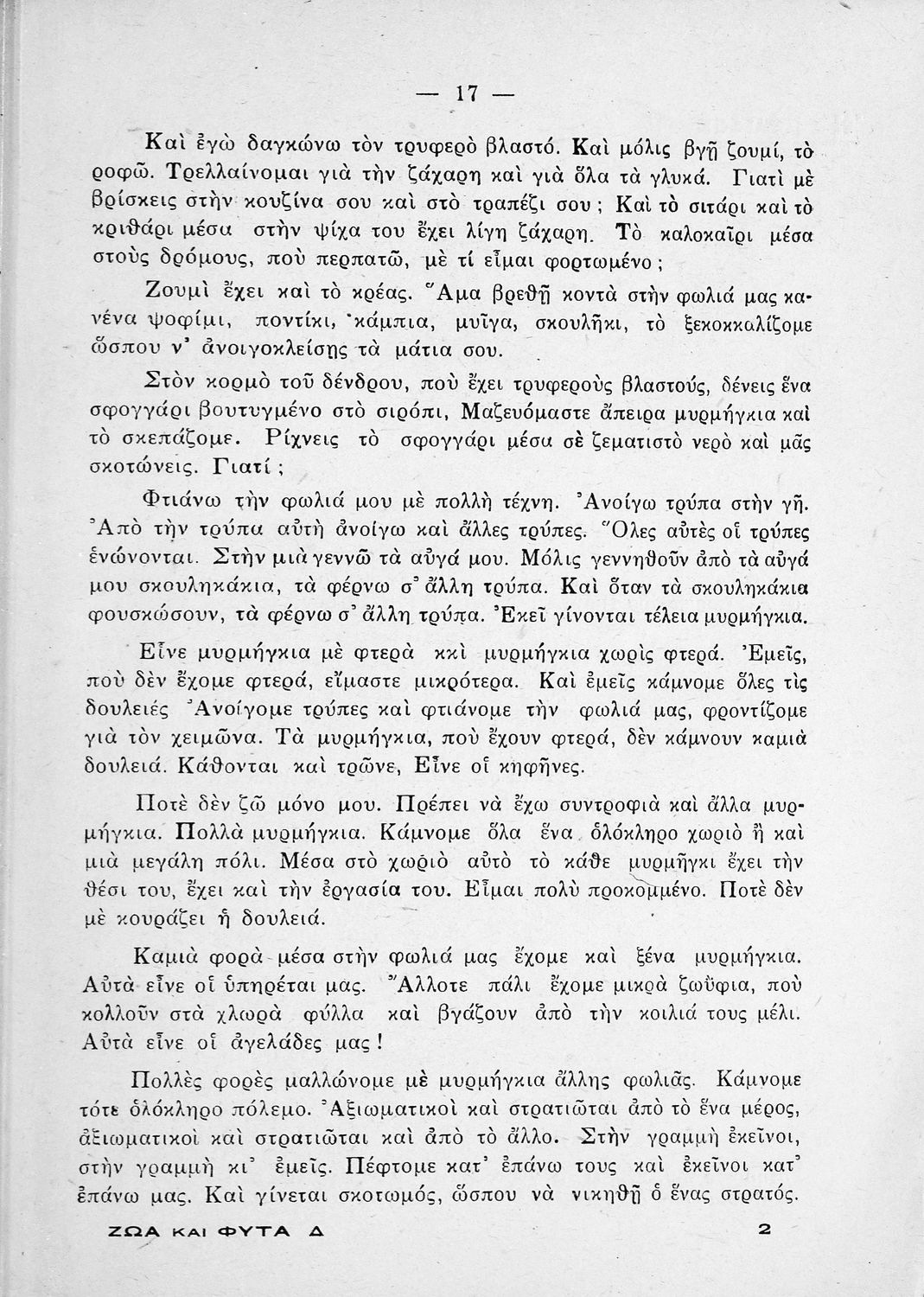 Σχολικό εγχειρίδιο Ζωολογίας και Φυτολογίας για την Δ΄ Δημοτικού που περιγράφει διάφορα ζώα και φυτά με λογοτεχνική αφήγηση και παιγνιώδη διάθεση.