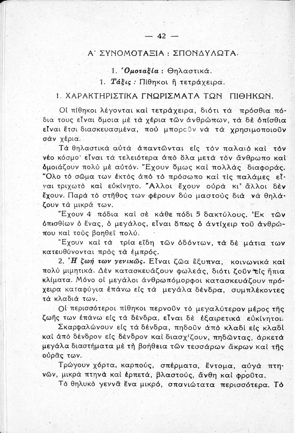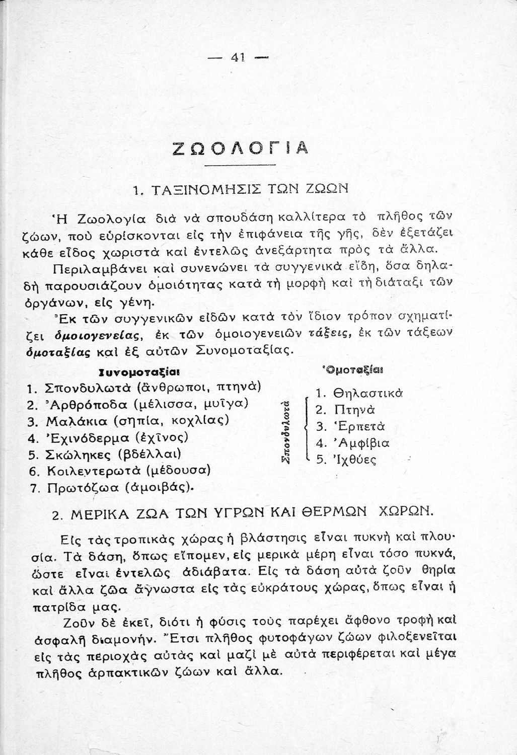 Σχολικό εγχειρίδιο Φυσικής Ιστορίας της Α' Τάξης των Γυμνασίων και Ημιγυμνασίων. Το βιβλίο χωρίζεται σε τρία κεφάλαια: ζωολογία, ορυκτολογία, φυτολογία.