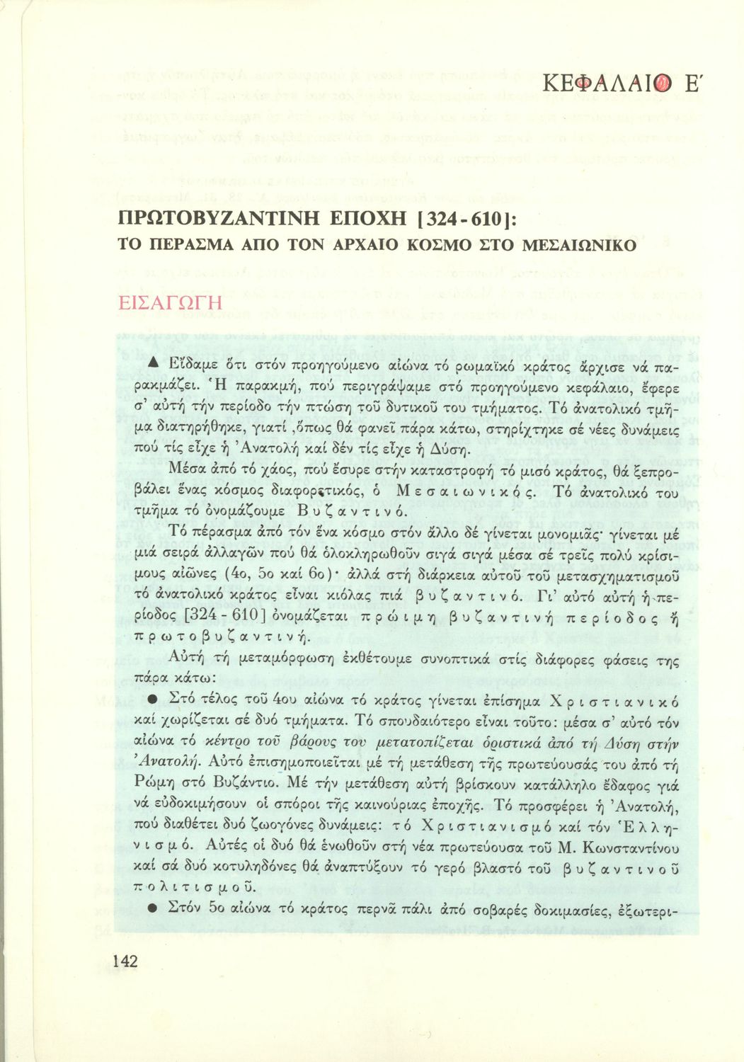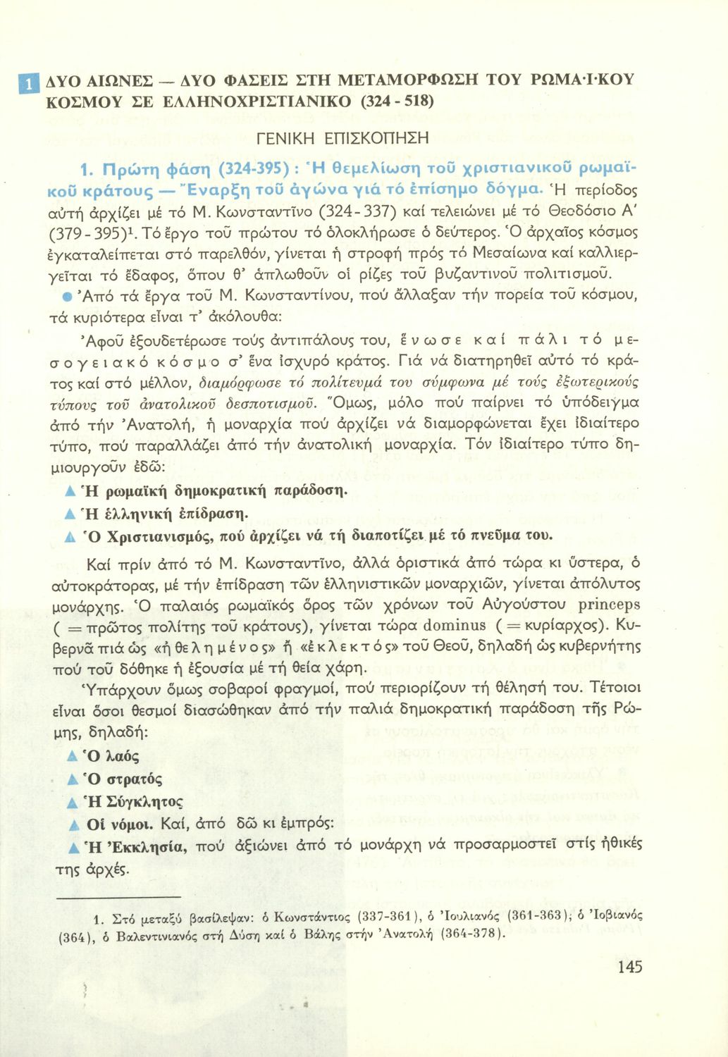 Σχολικό εγχειρίδιο Ιστορίας Β΄ και Ε΄ Γυμνασίου που καλύπτει την περίοδο από την άνοδο του Μ. Κωνσταντίνου στο θρόνο μέχρι και την άλωση της Κωνσταντινούπολης. Παρουσιάζει και τα πνευματικά και καλλιτεχνικά ...