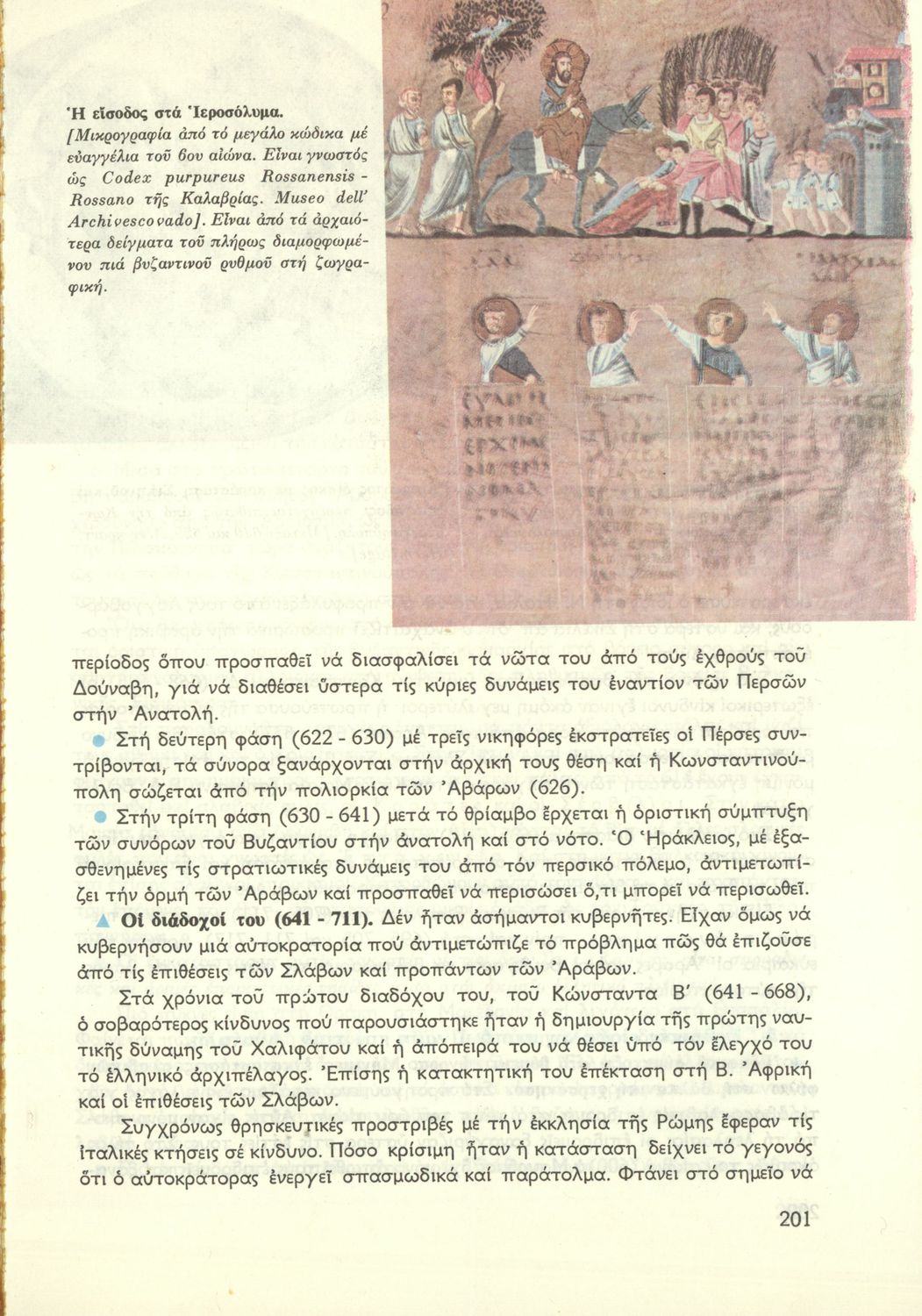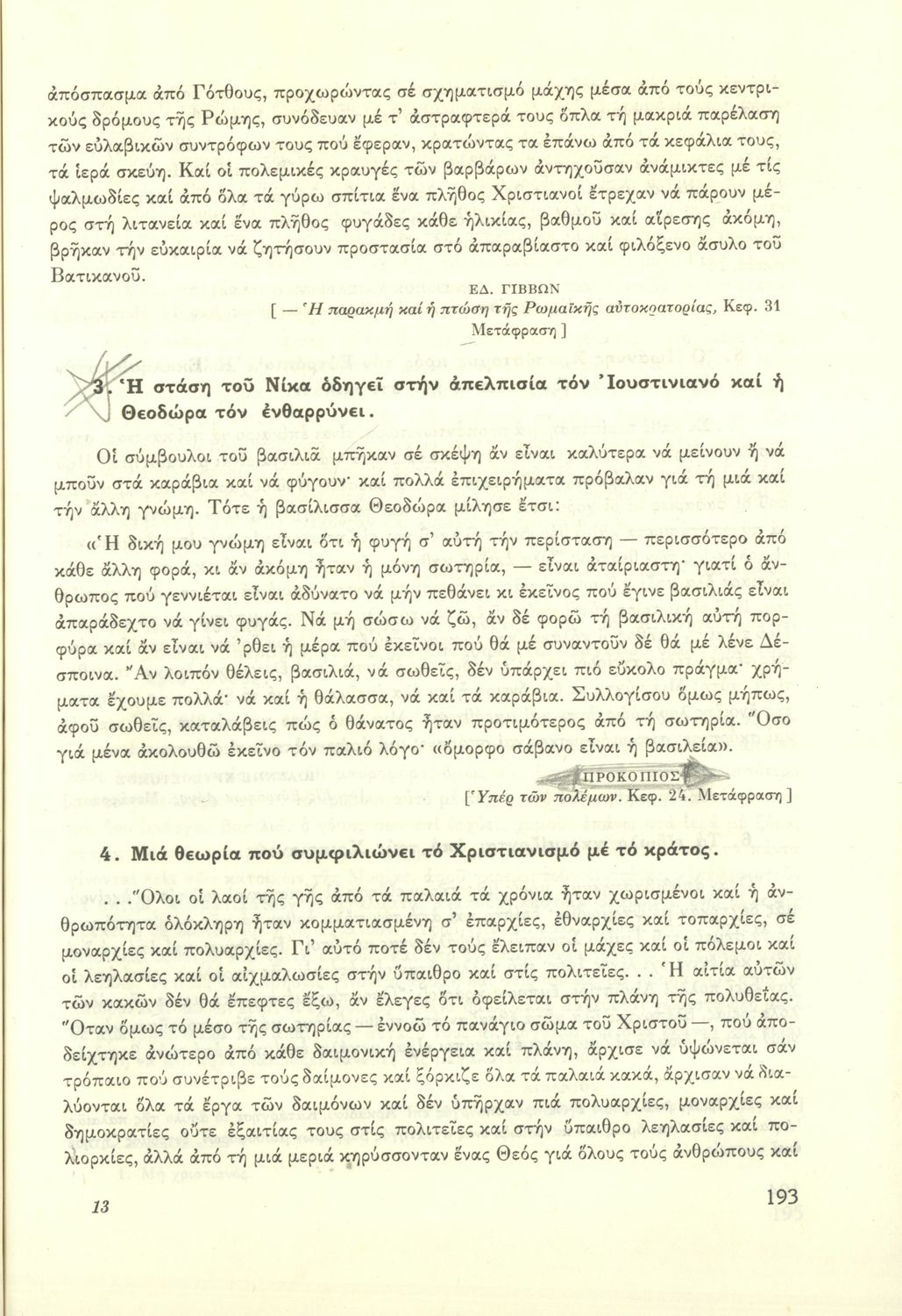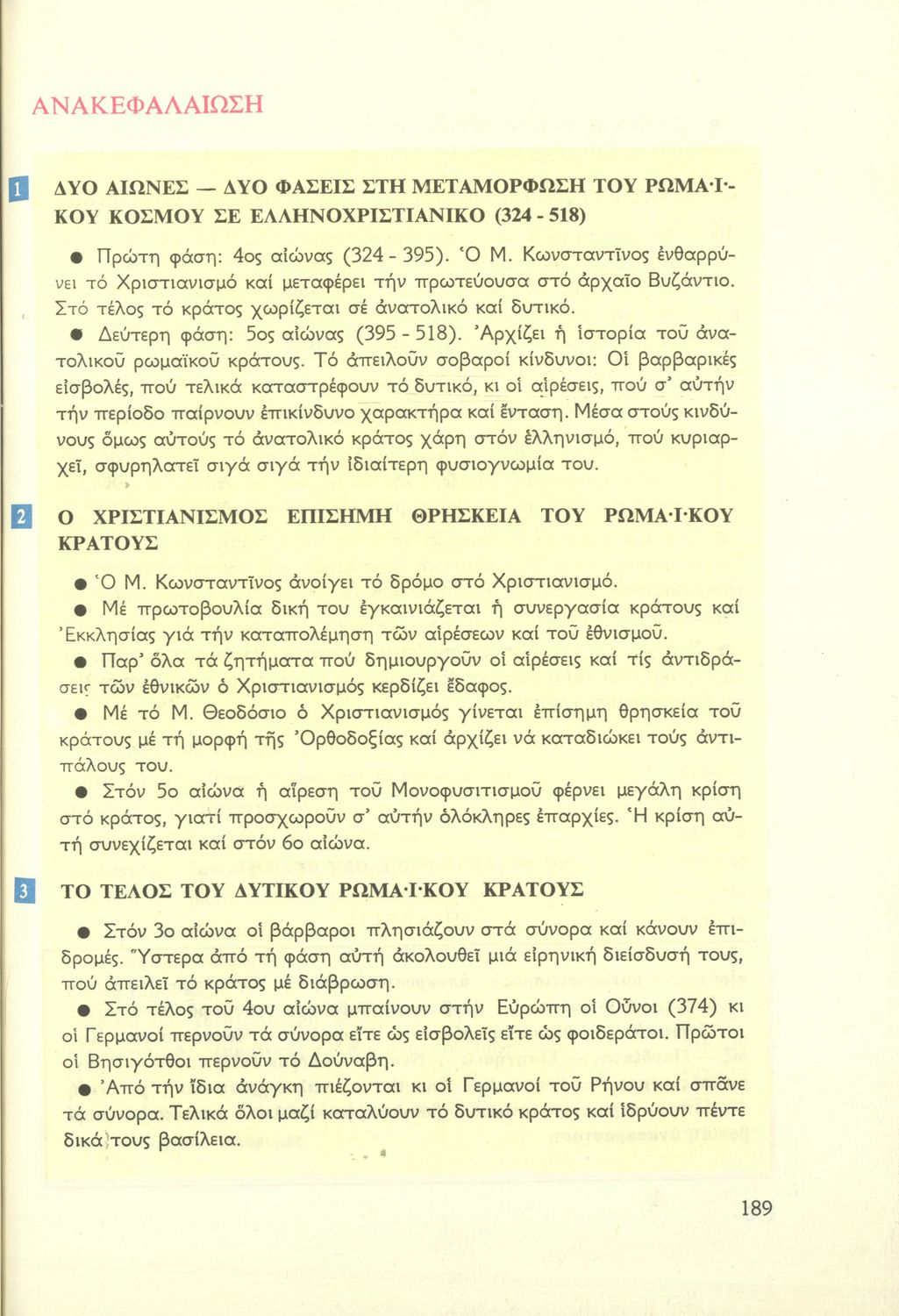 Σχολικό εγχειρίδιο Ιστορίας Β΄ Γυμνασίου που καλύπτει την περίοδο από την κατάληψη της Ελλάδας από τους Ρωμαίους ως την πτώση της Βυζαντινής Αυτοκρατορίας. Γίνεται ιδιαίτερη μνεία στο χριστιανικό και ελληνικό στοιχείο του Βυζαντίου. Προτείνει μια υλιστική ανάγνωση της Ιστορίας την οποία διαβάζει από την οπτική των κοινωνικών συγκρούσεων.