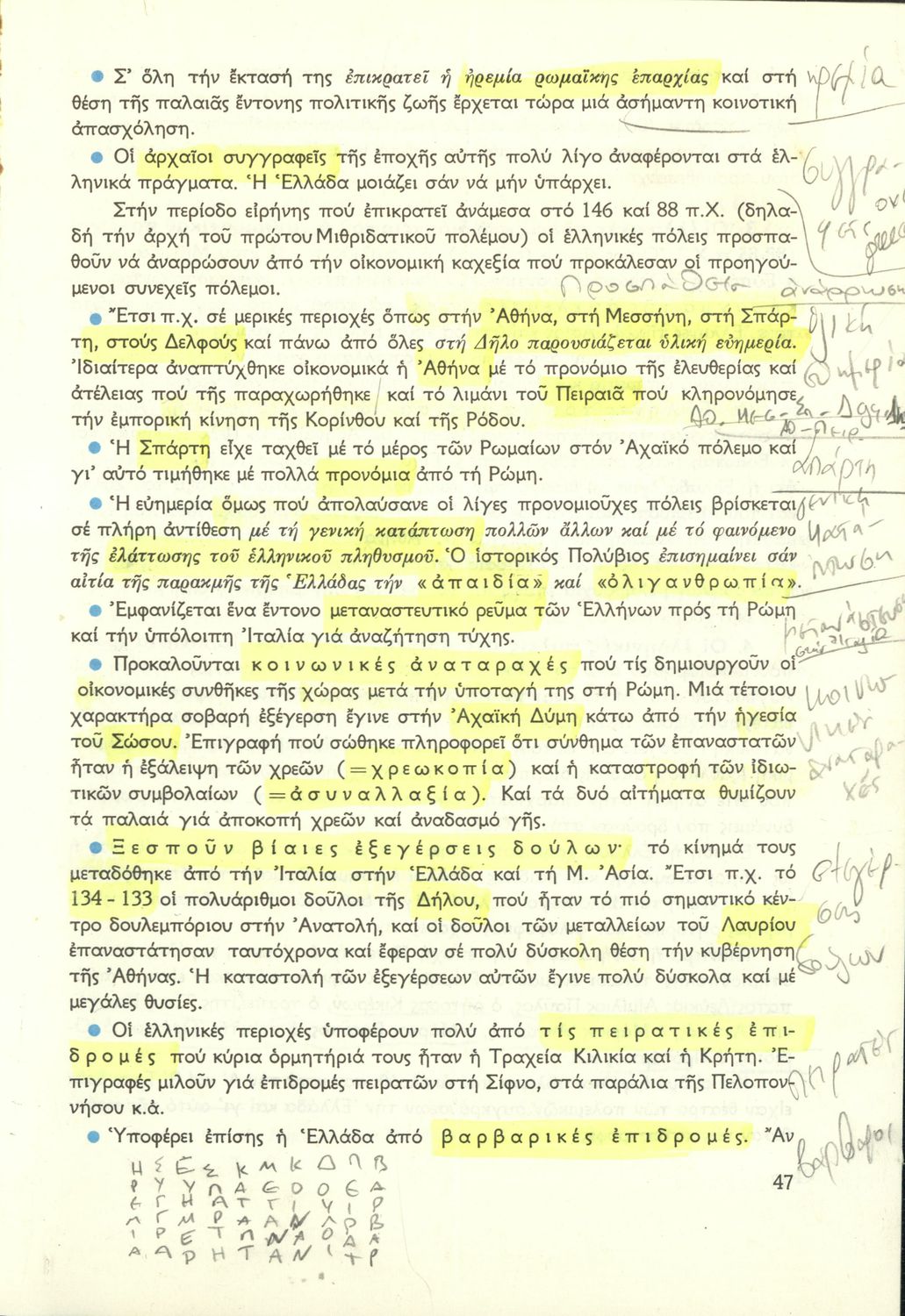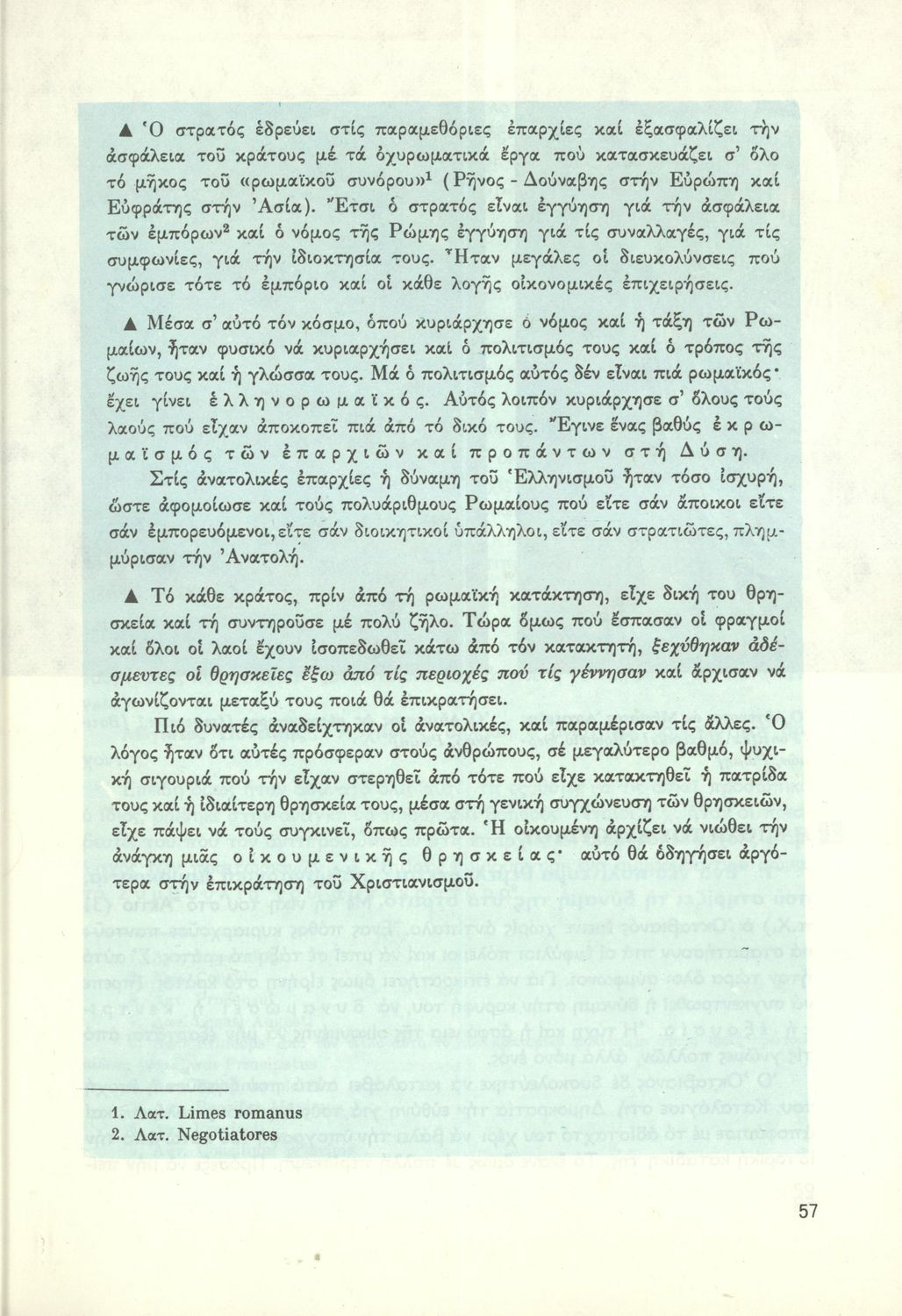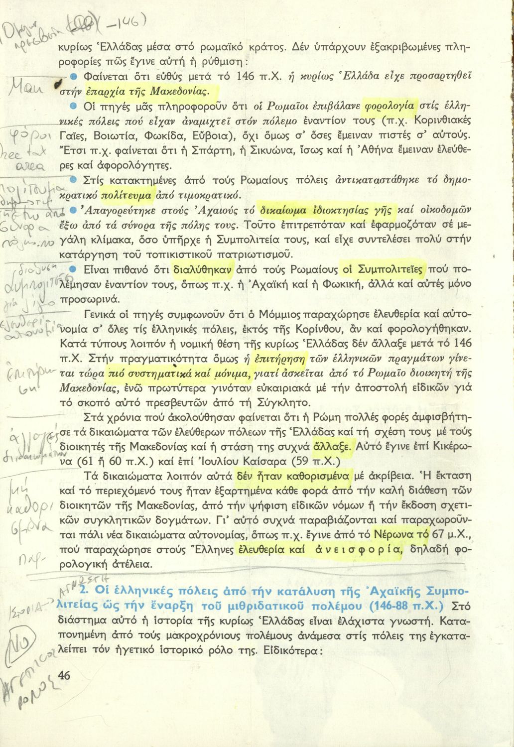 Σχολικό εγχειρίδιο Ιστορίας Β΄ Γυμνασίου που καλύπτει την περίοδο από την κατάληψη της Ελλάδας από τους Ρωμαίους ως την πτώση της Βυζαντινής Αυτοκρατορίας. Γίνεται ιδιαίτερη μνεία στο χριστιανικό και ελληνικό στοιχείο του Βυζαντίου. Προτείνει μια υλιστική ανάγνωση της Ιστορίας την οποία διαβάζει από την οπτική των κοινωνικών συγκρούσεων.