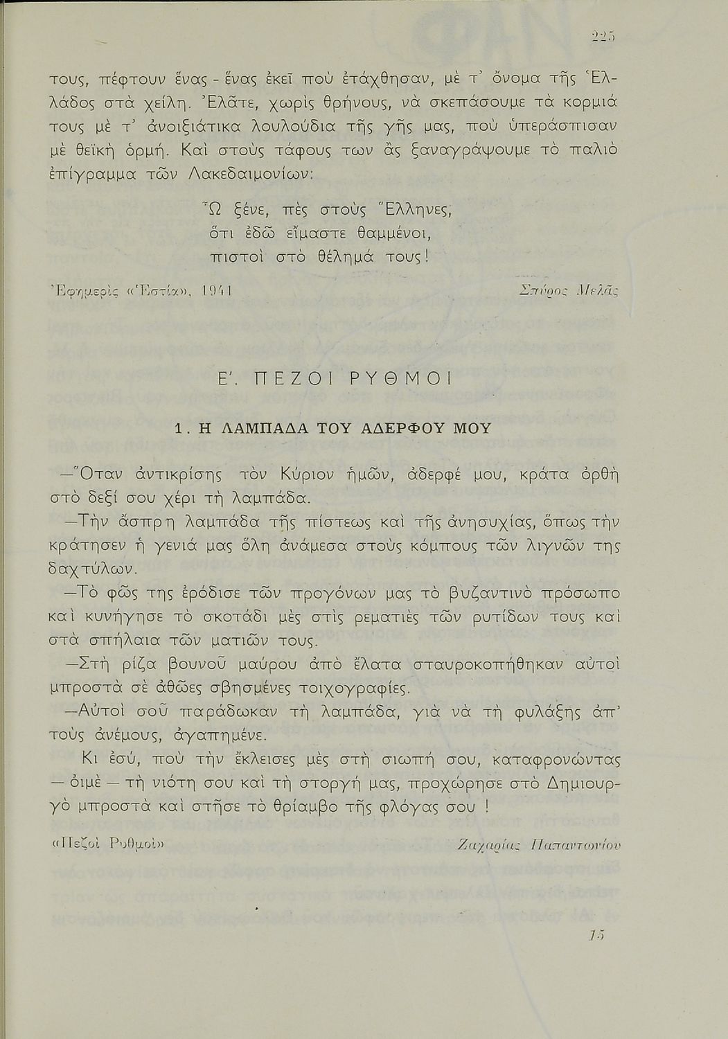 Σχολικό εγχειρίδιο Νέων Ελληνικών Ε΄ Γυμνασίου που περιέχει πεζά και ποιήματα συγγραφέων της βυζαντινής και μεταβυζαντινής περιόδου πατριωτικού και θρησκευτικού περιεχομένου. Περιλαμβάνει και πεζά και ποιήματα