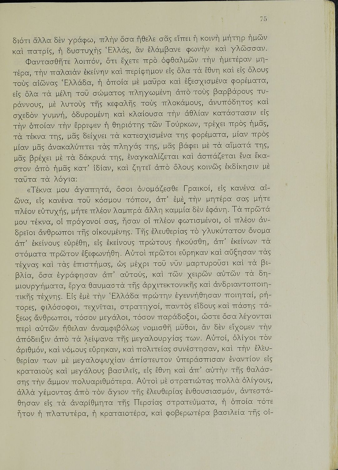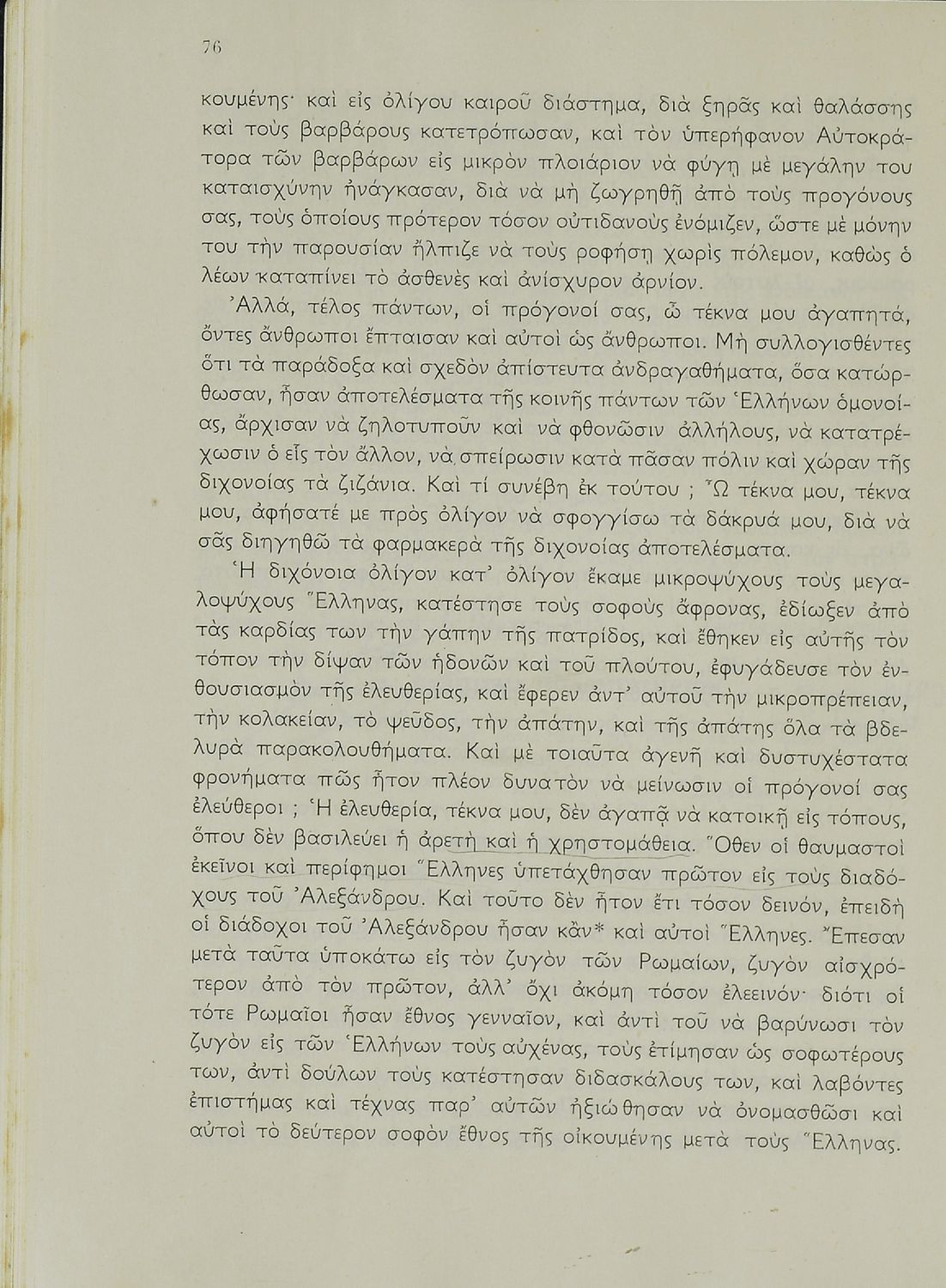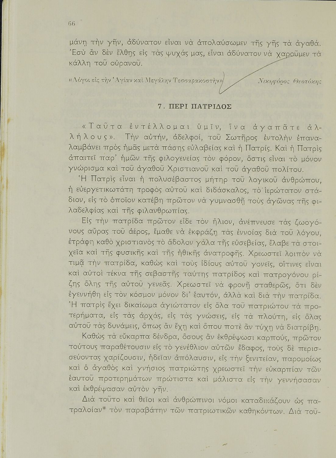 Σχολικό εγχειρίδιο Νέων Ελληνικών Ε΄ Γυμνασίου που περιέχει πεζά και ποιήματα συγγραφέων της βυζαντινής και μεταβυζαντινής περιόδου πατριωτικού και θρησκευτικού περιεχομένου. Περιλαμβάνει και κείμενα Ελλήνων συγγραφέων και δημοτικά τραγούδια πατριωτικού περιεχομένου και παράρτημα με βιογραφίες των συγγραφέων και λεξιλόγιο.