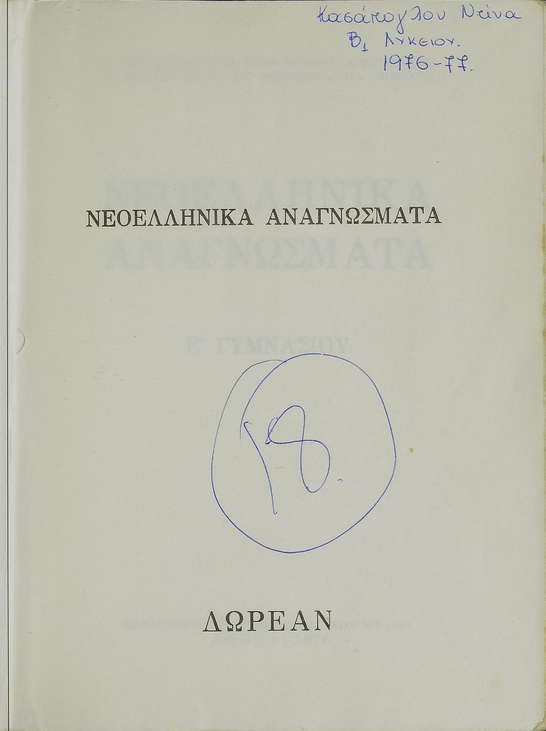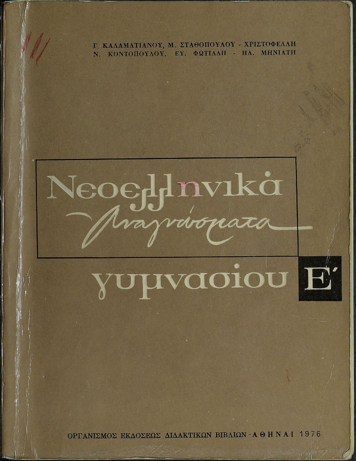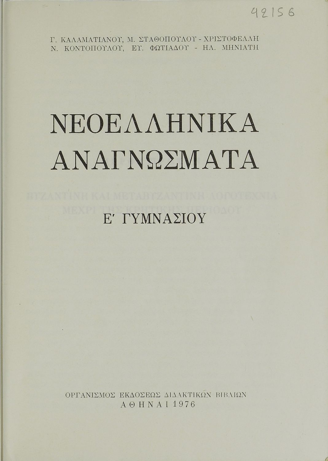 Κωδικός αναγνώρισης: 01-42156 Τίτλος: Νεοελληνικά αναγνώσματα Ε΄ Γυμνασίου Συγγραφέας: Γ. Καλαματιανός, Μ. Σταθοπούλου-Χριστοφέλλη, Ν. Κοντόπουλος, Ε. Φωτιάδης, Ηλ. Μηνιάτης Μέγεθος και υπόστρωμα: Σχολικό εγχειρίδιο, μαλακό εξώφυλλο, 348 σελίδες. |