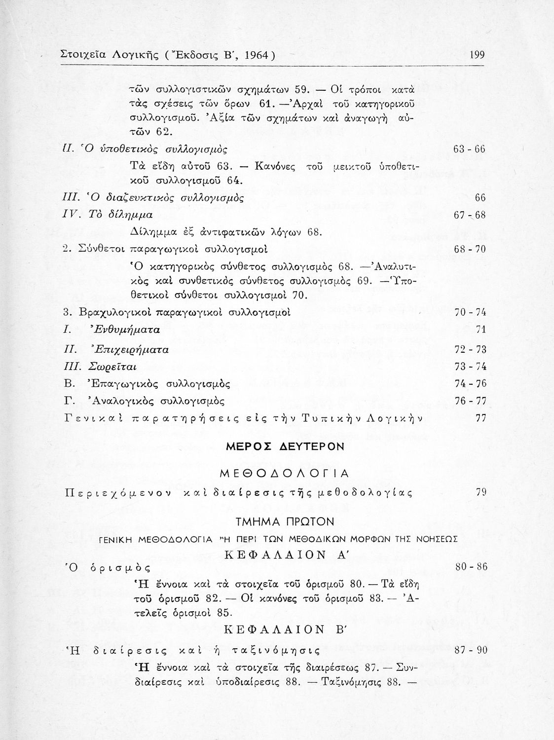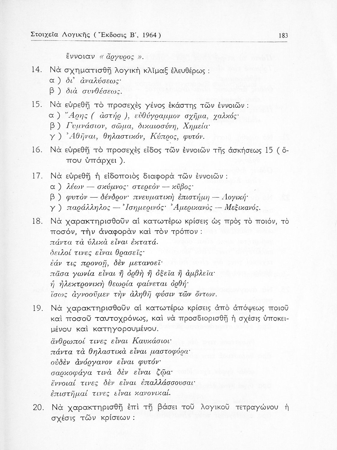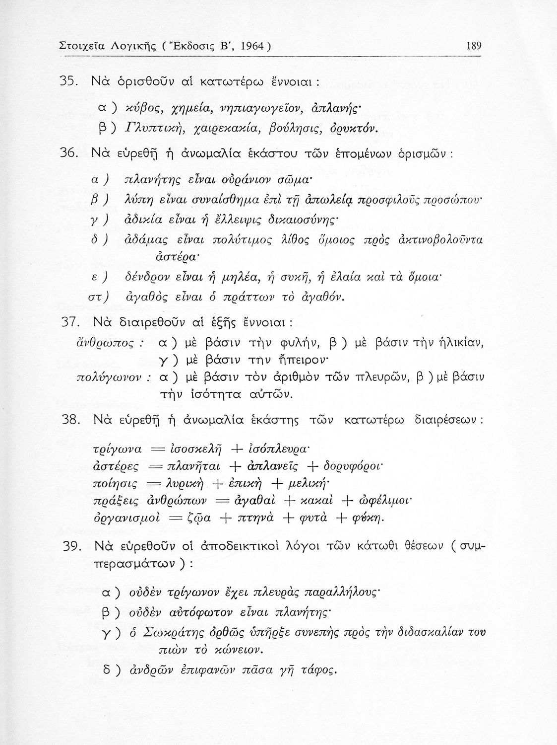 Σχολικό εγχειρίδιο Λογικής για τη ΣΤ΄ Γυμνασίου που είναι χωρισμένο σε στοιχειολογία ή τυπική λογική, μεθοδολογία και γνωσιολογία. Περιέχει ασκήσεις λογικής.