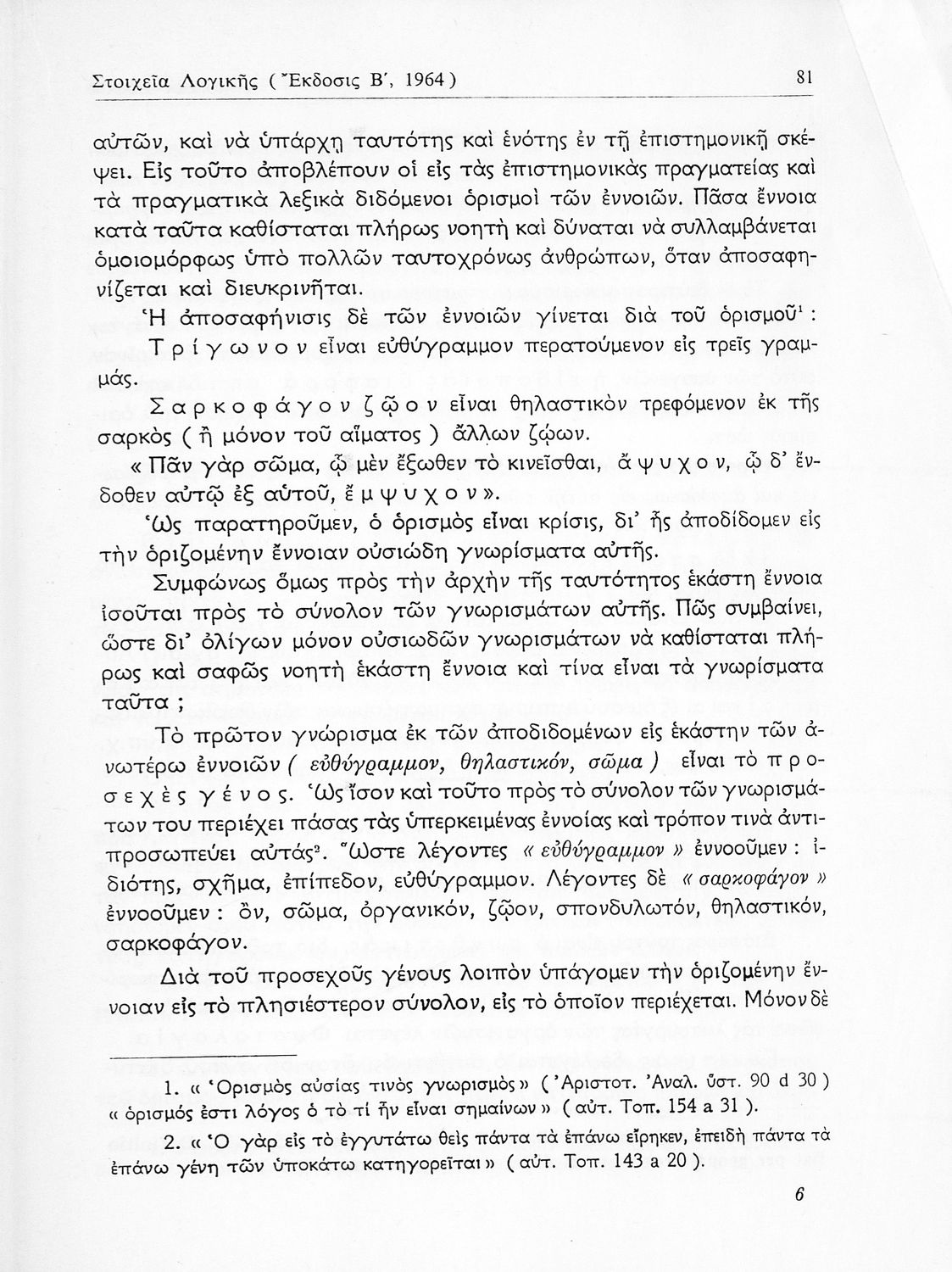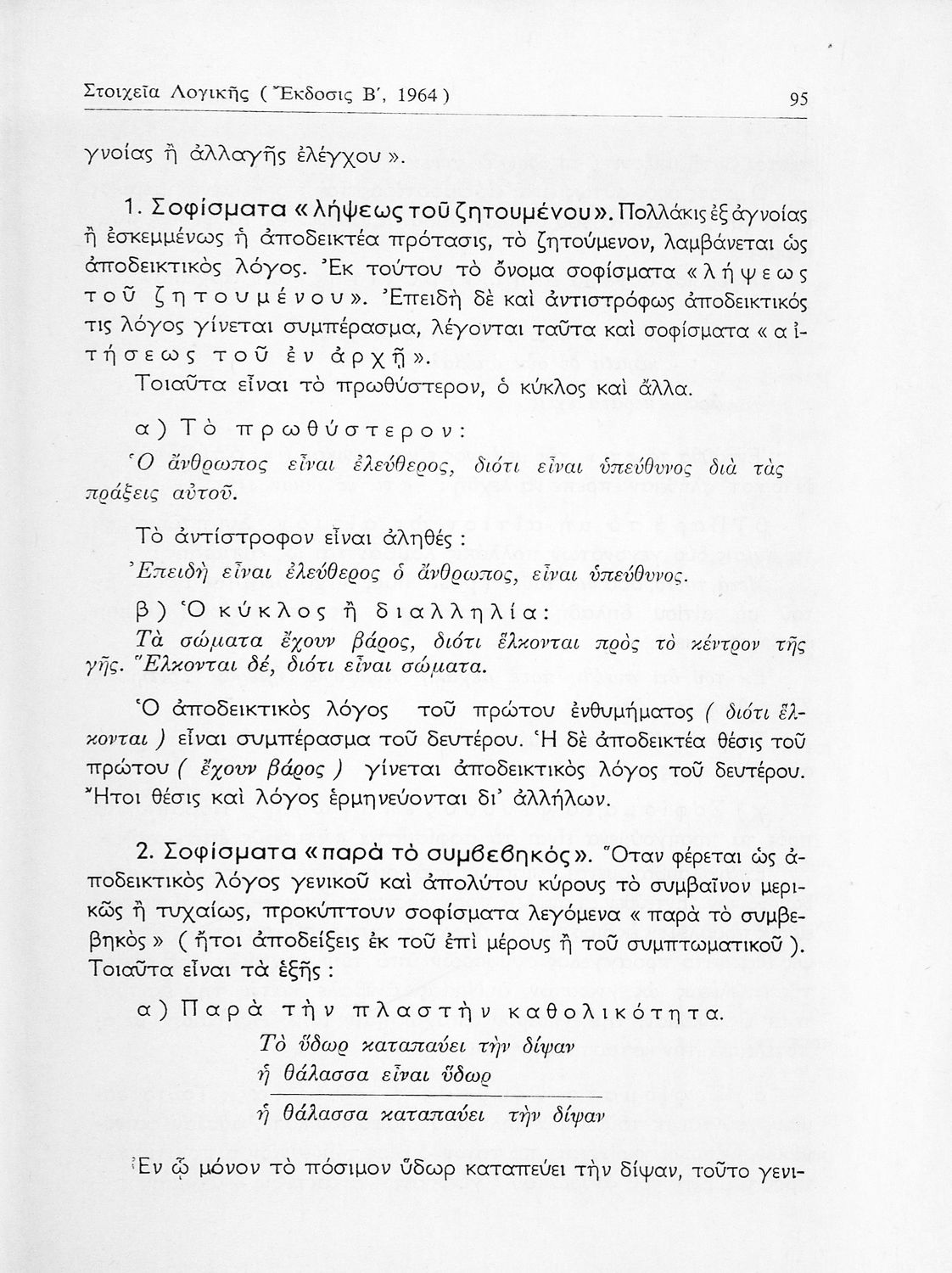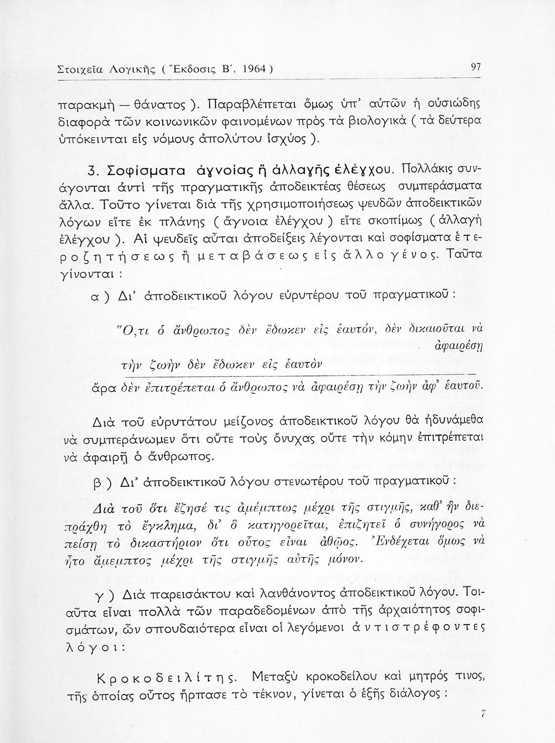 Σχολικό εγχειρίδιο Λογικής ΣΤ΄ Γυμνασίου που είναι δομημένο θεματικά και περιλαμβάνει ζητήματα τυπικής λογικής, μεθοδολογίας και γνωσιολογίας. Περιέχει παράρτημα με ασκήσεις λογικής.