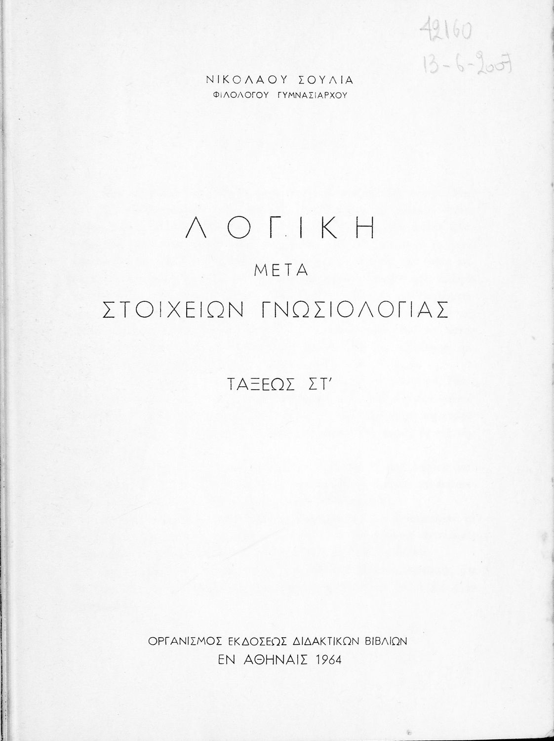 Τίτλος: Λογική μετά στοιχείων γνωσιολογίας, τάξεως ΣΤ΄